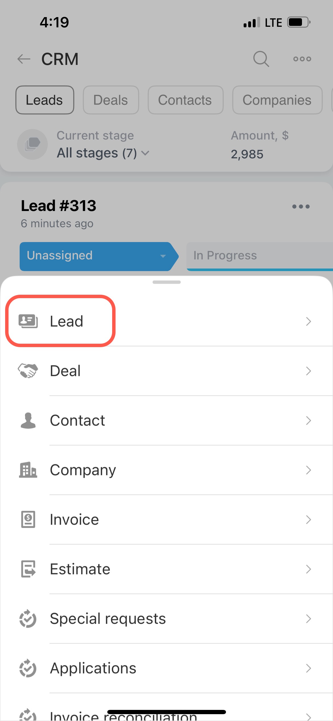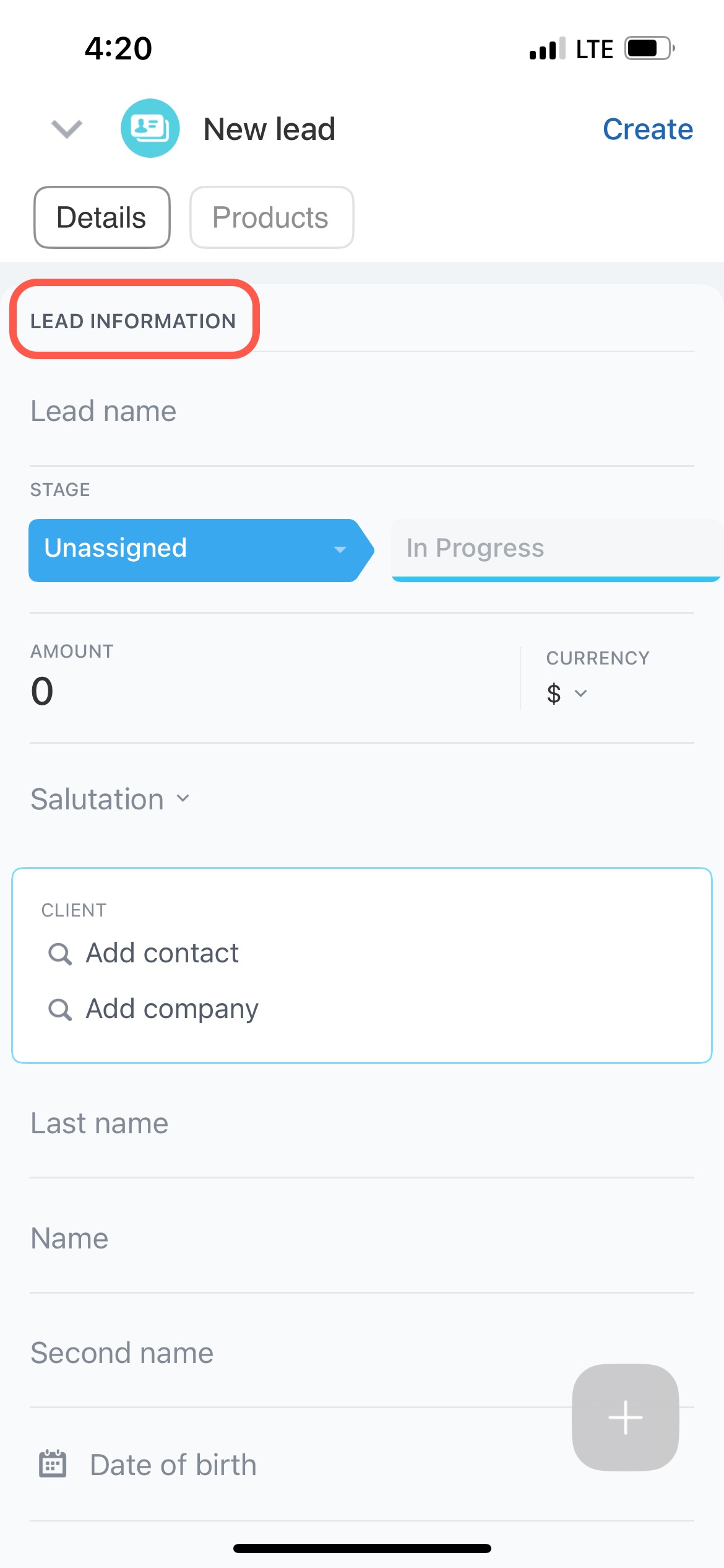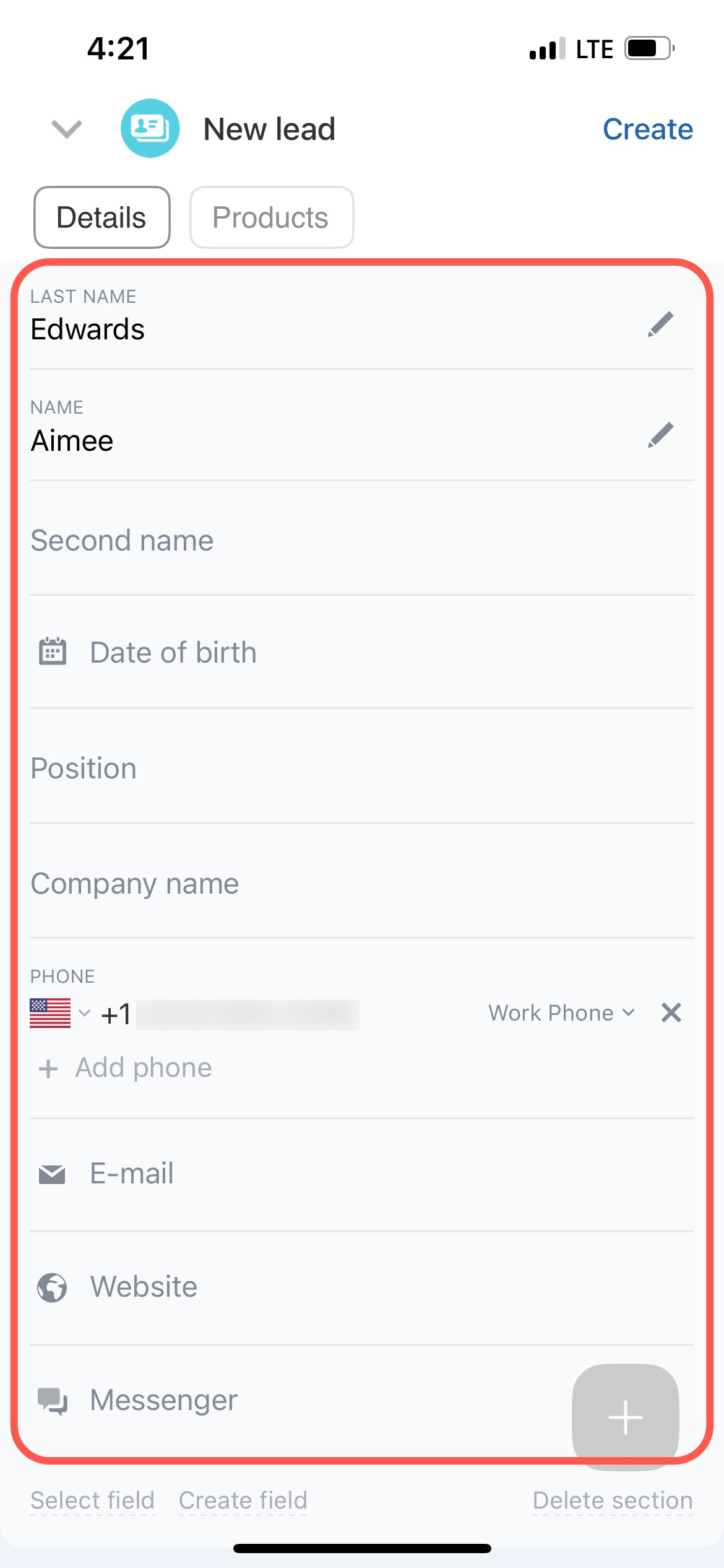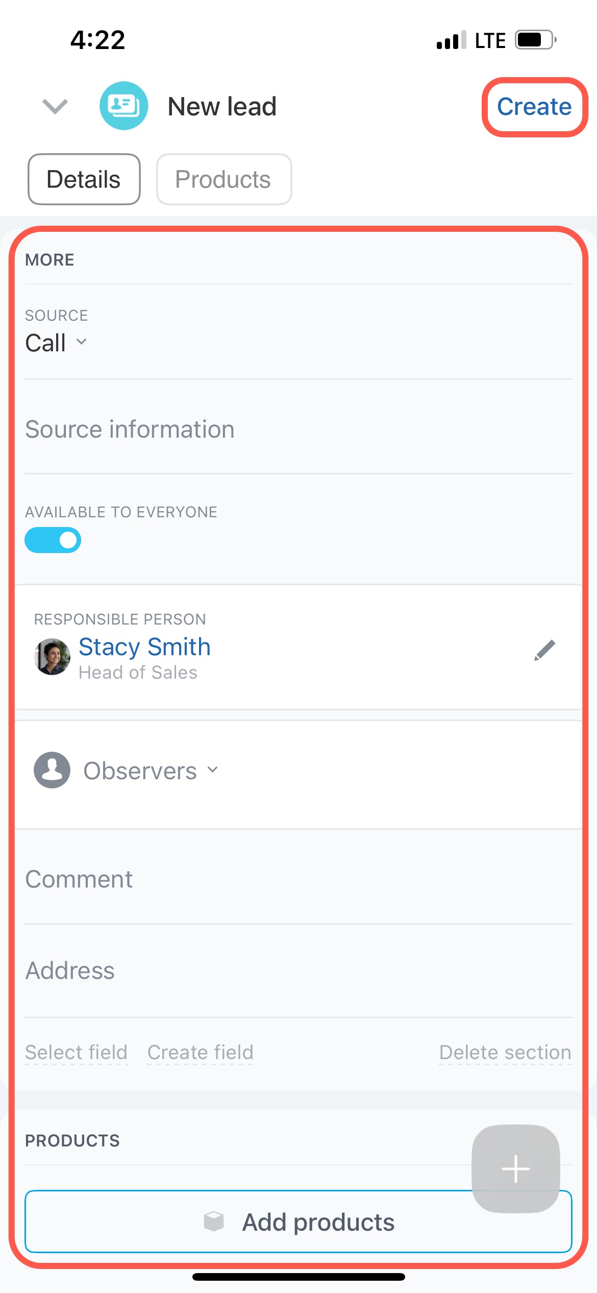 Select Lead in the list. Specify the lead name and fill in the basic information about the customer in the Details tab. Add the phone number, select the responsible person and the product. Once you have entered all the data, tap Create.