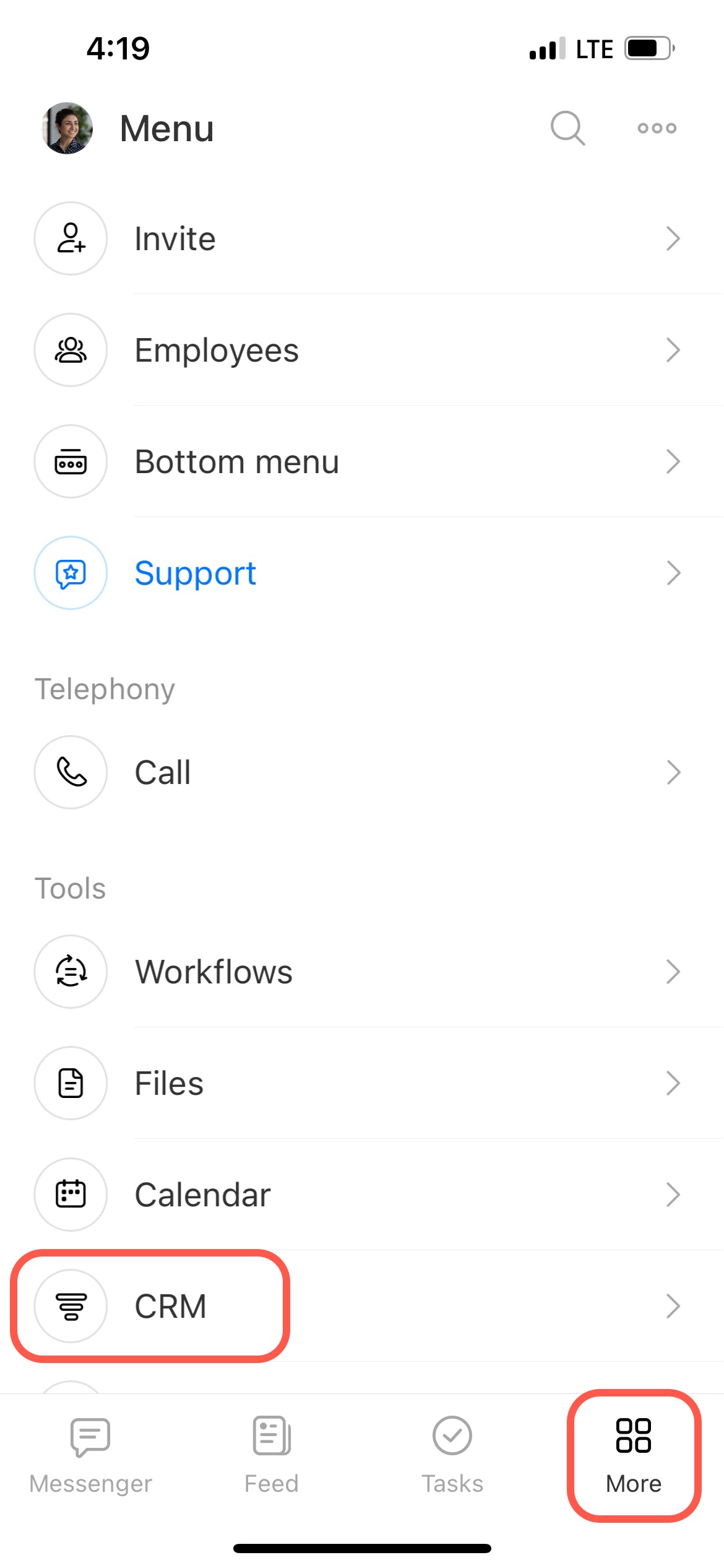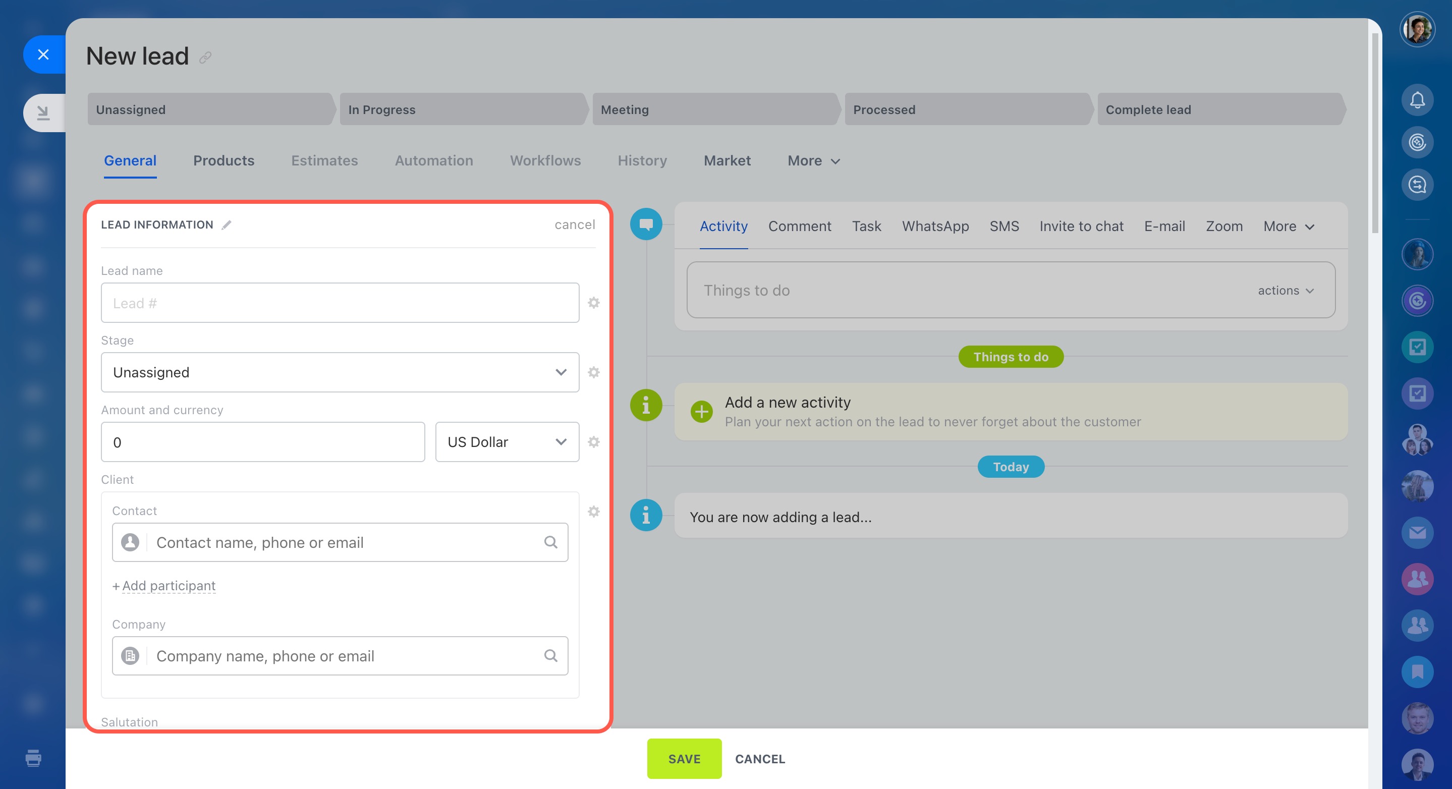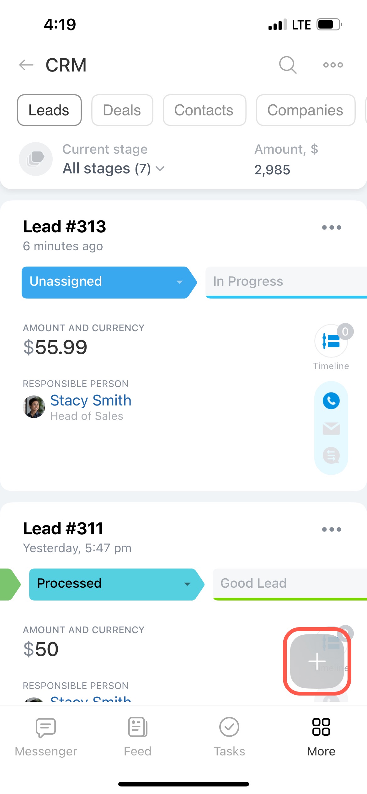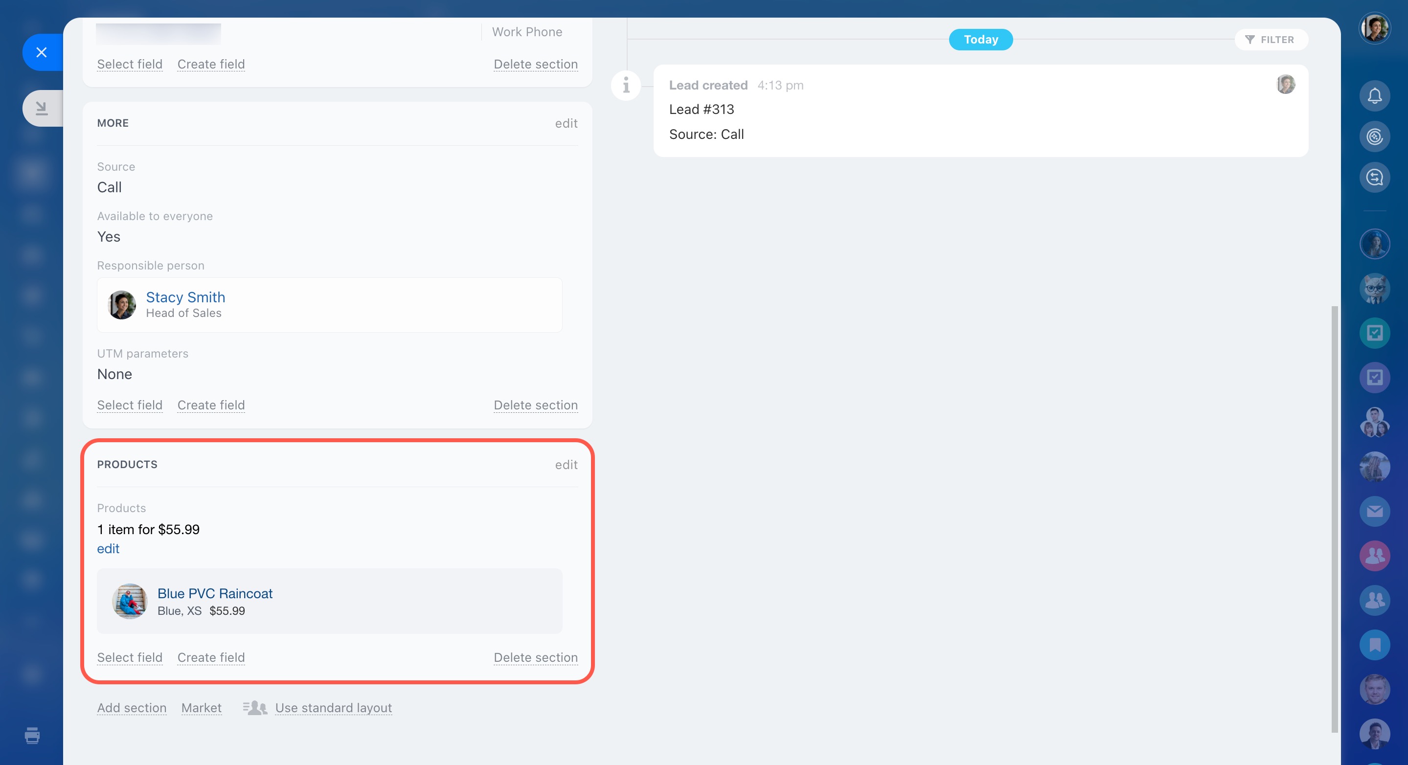 Select Lead in the list. Specify the lead name and fill in the basic information about the customer in the Details tab. Add the phone number, select the responsible person and the product. Once you have entered all the data, tap Create.