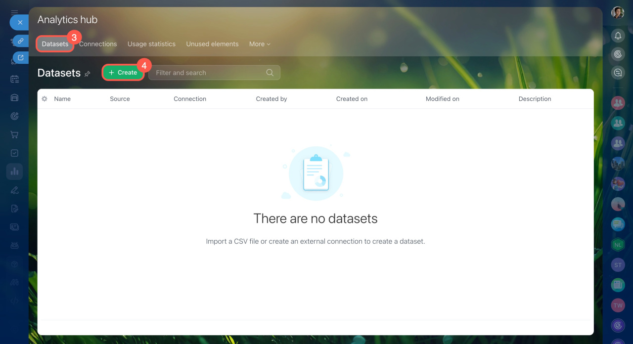 Go to BI Builder > Analytics hub > Datasets > Create. In the File and settings section, upload your CSV file and configure its settings.