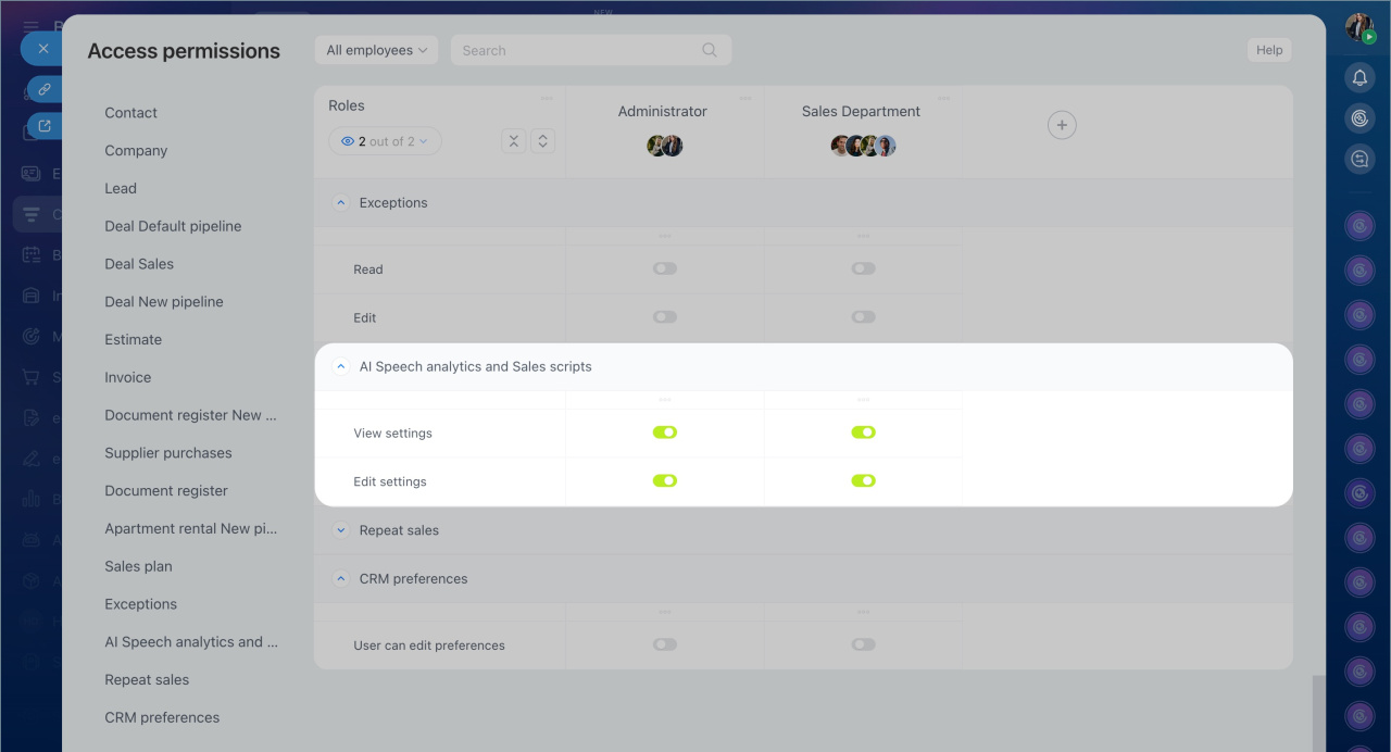 Access permissions for sales scripts and AI-powered speech analytics can be configured by a Bitrix24 administrator or an employee with the editing permission in CRM.
