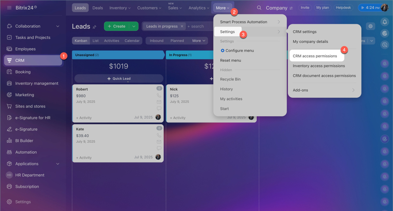 1. Go to CRM > More > Settings (⚙️) > CRM access permissions.
