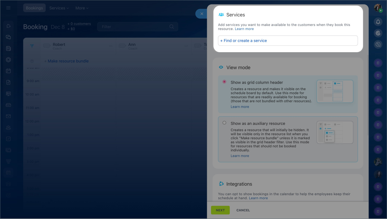 - Show in grid column header — the resource is always visible on the schedule board. Ideal for the main resources that customers book, like experts or rental cars.