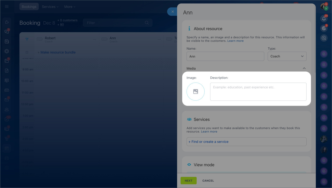 Information for customers. You can add an image and a brief description to help them learn more about the resource before booking. For example, upload photos of the specialists and include details about their education.