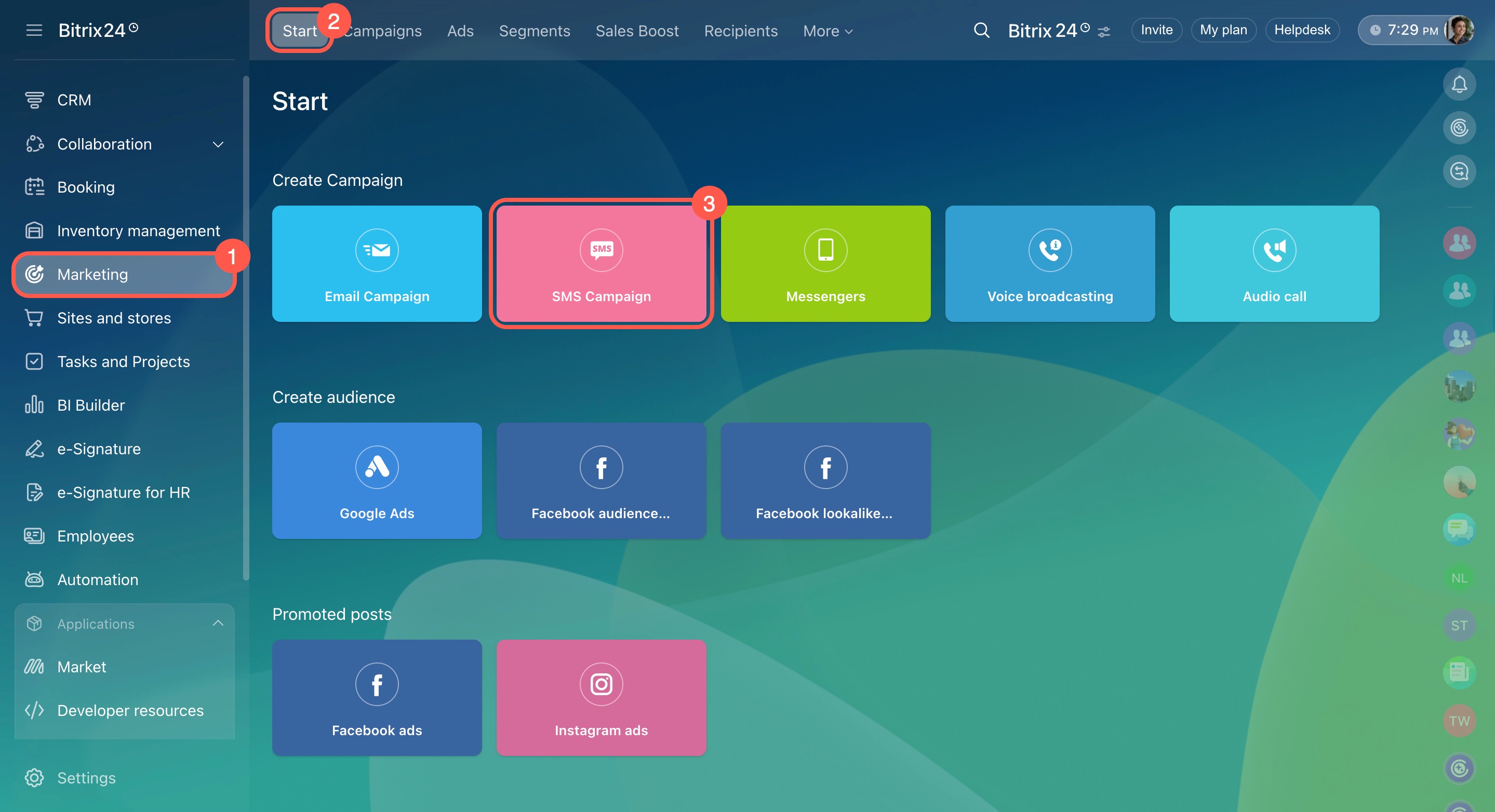 - SMS campaign in Bitrix24 is a tool for sending messages to a group of clients. For example, you can inform them about promotions, new products, or special events.