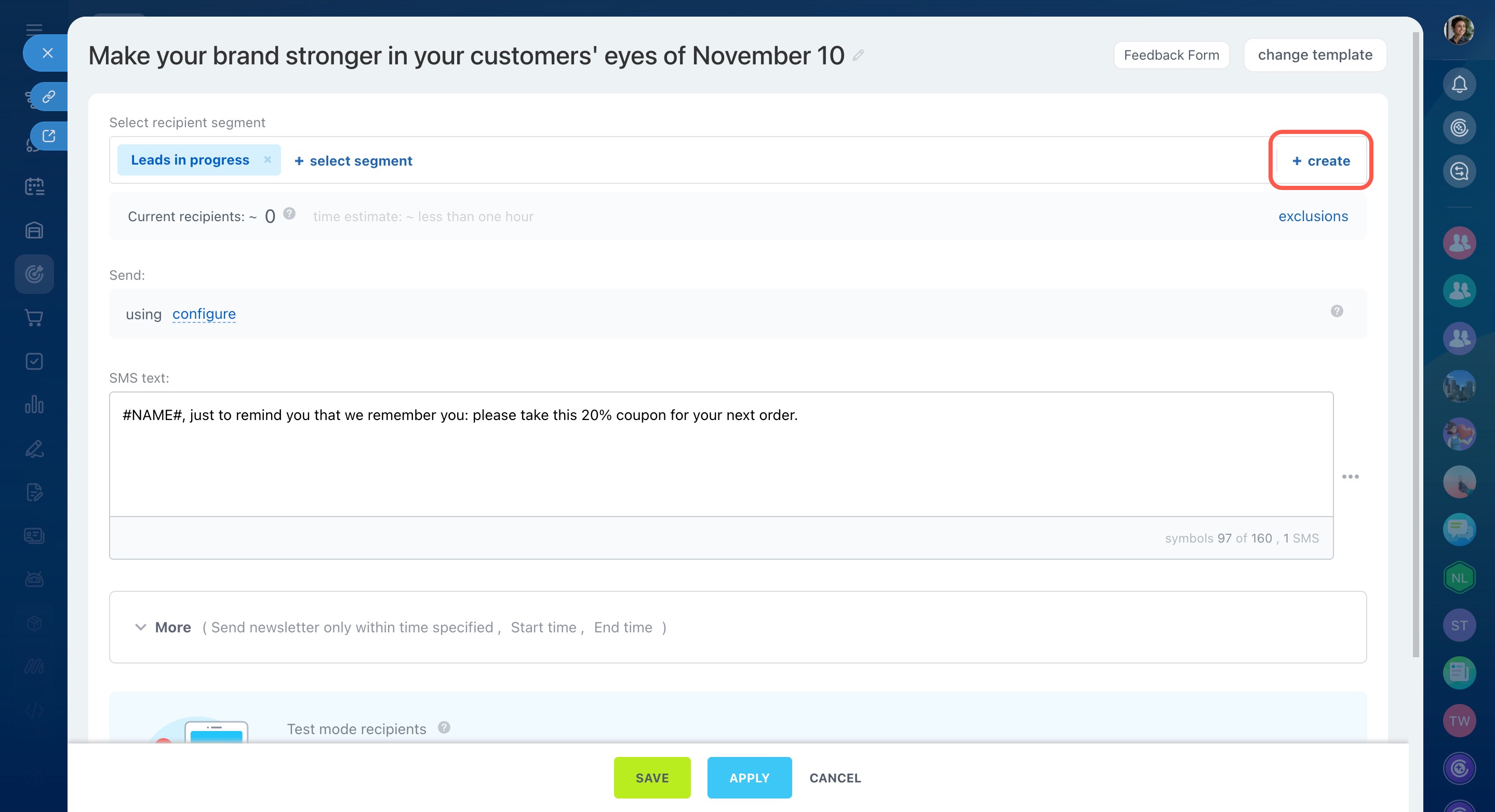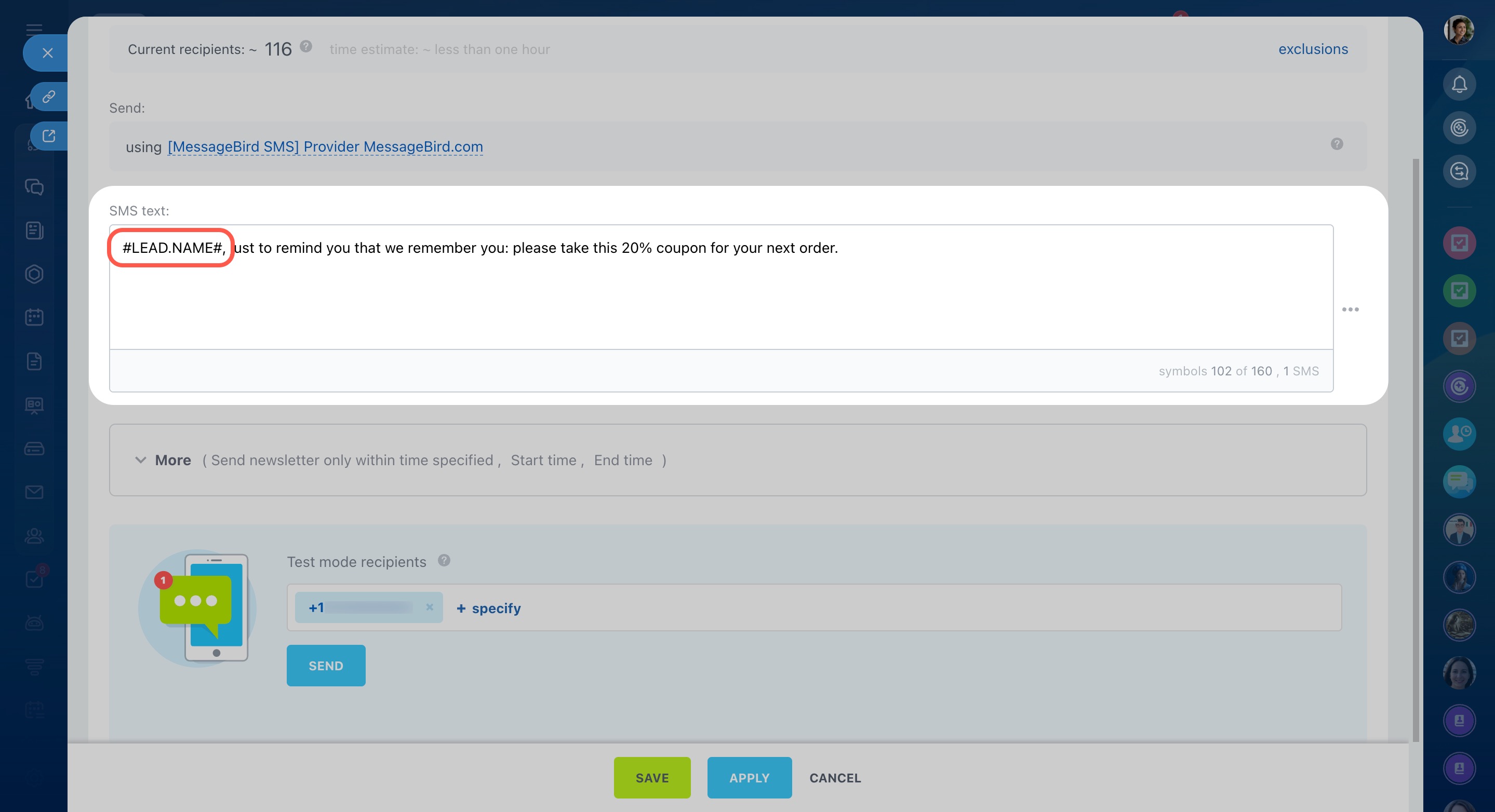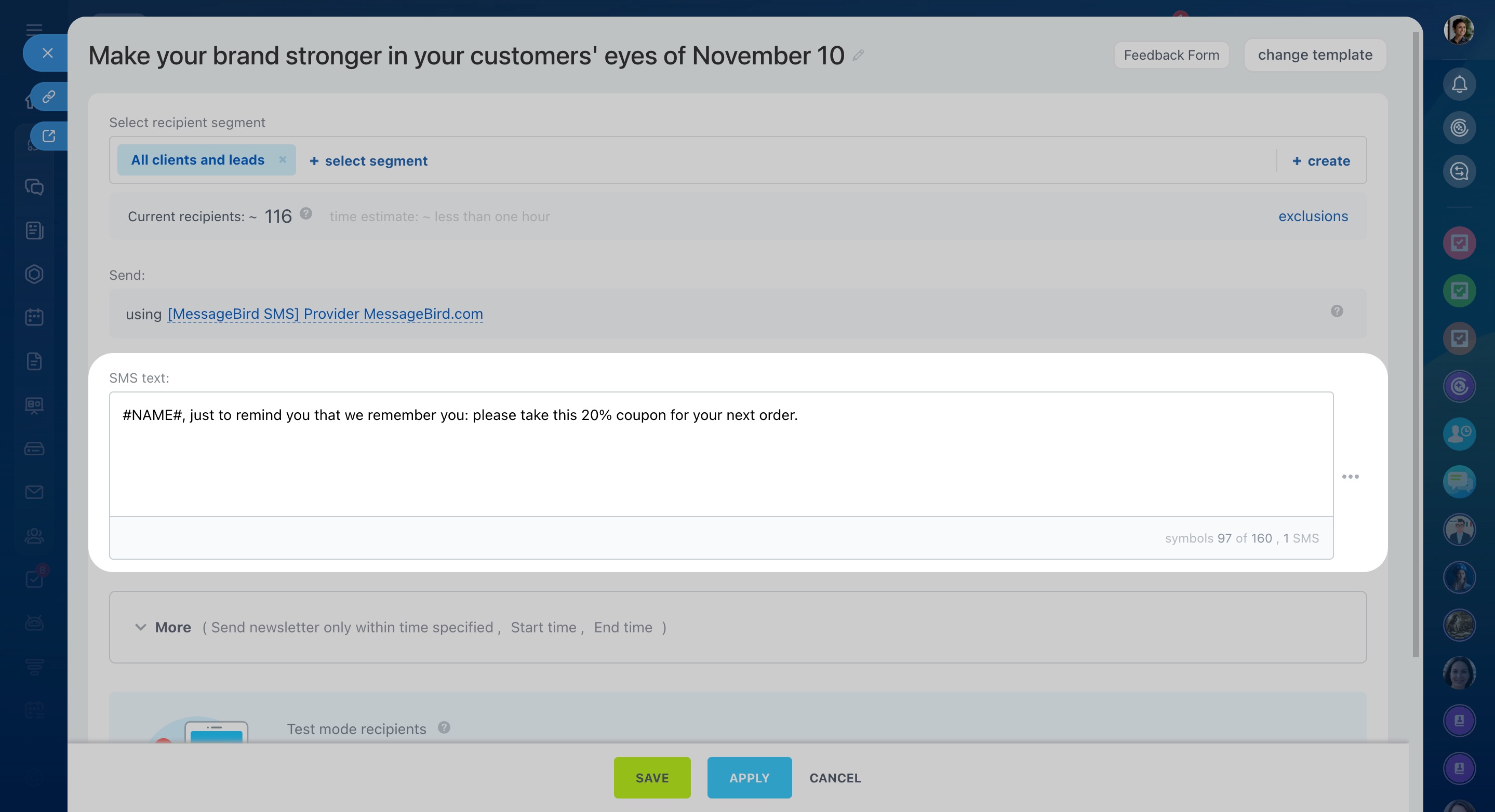 SMS campaign in Bitrix24 is a tool for sending messages to a group of clients. For example, you can inform them about promotions, new products, or special events.