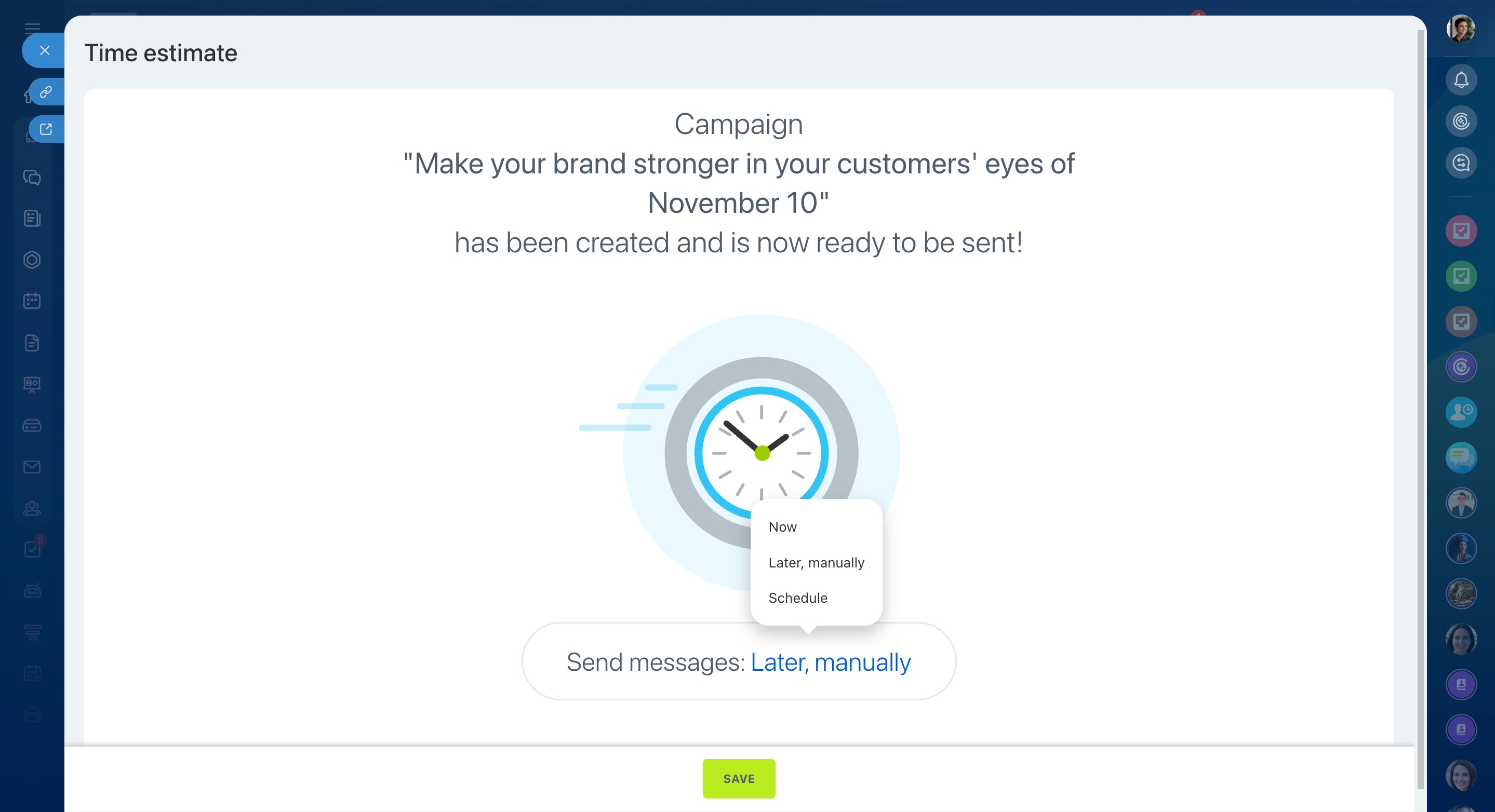 - Later, manually - a campaign can be sent at any time. Go to Marketing - Campaigns, select the desired one and click Send.