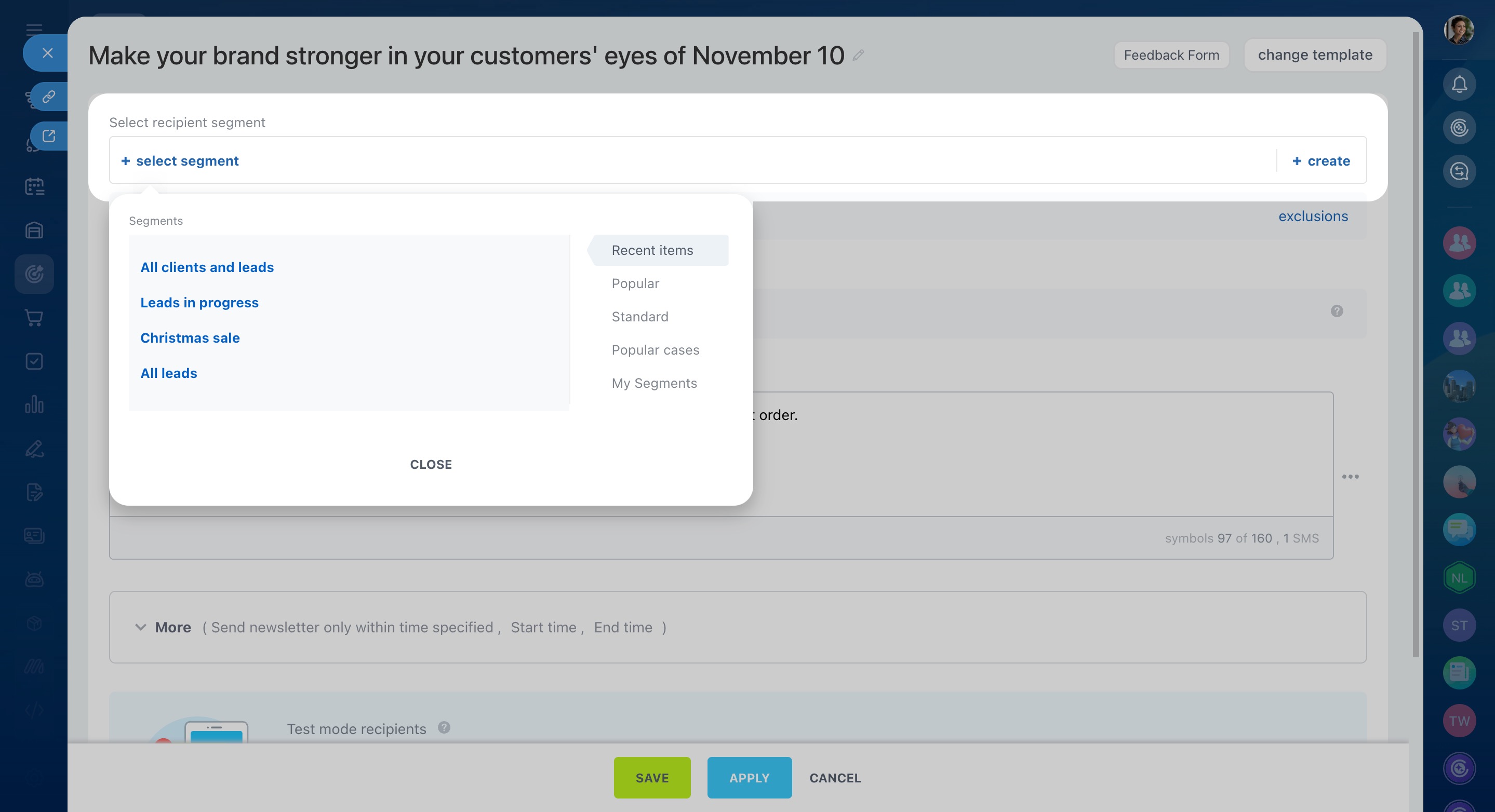 Select exclusion segment. You can exclude customers from the main segment who do not need to receive the newsletter. For example, you can send a promotion to all customers, but exclude those who are already planning to make a purchase.