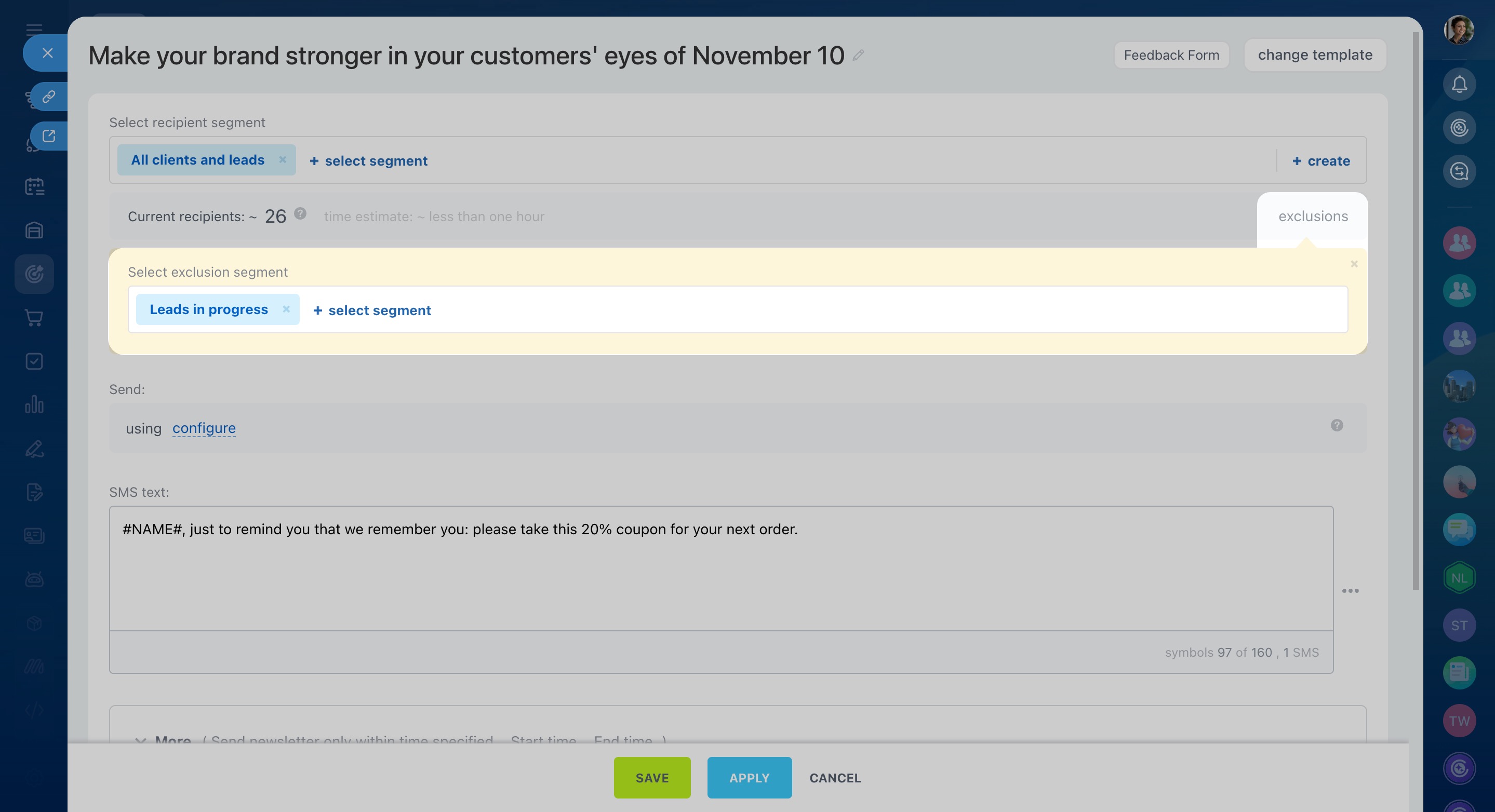 Click Exclusions and select which segment to exclude from the campaign. When you have added the exceptions, click Apply.