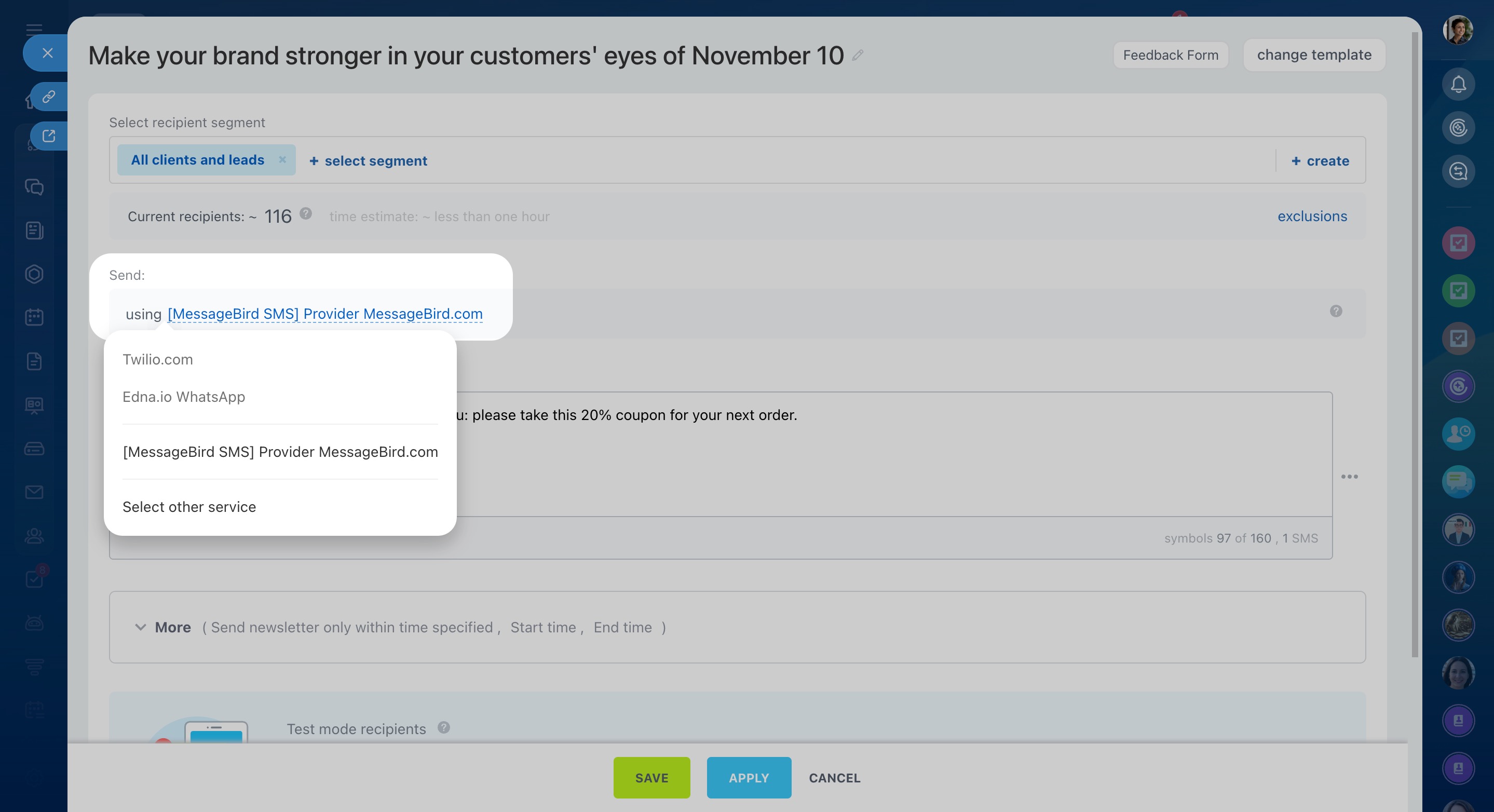 To send a campaign, you need to connect an SMS provider. Click Configure. Select the desired provider from the list or install it from the Market.