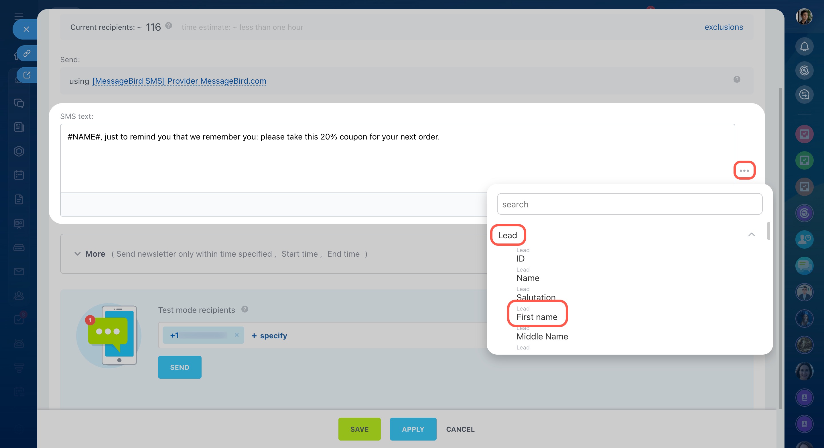 - It will be added to the text. When you send the message, the value from the field will be substituted.