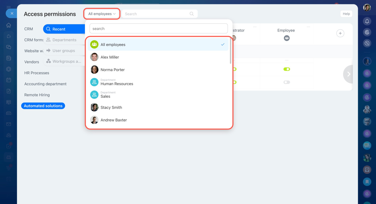 Automated solutions are a separate section for SPA, designed to automate the work of any department of your company. Bitrix24 now lets you manage access permissions specifically for this section.