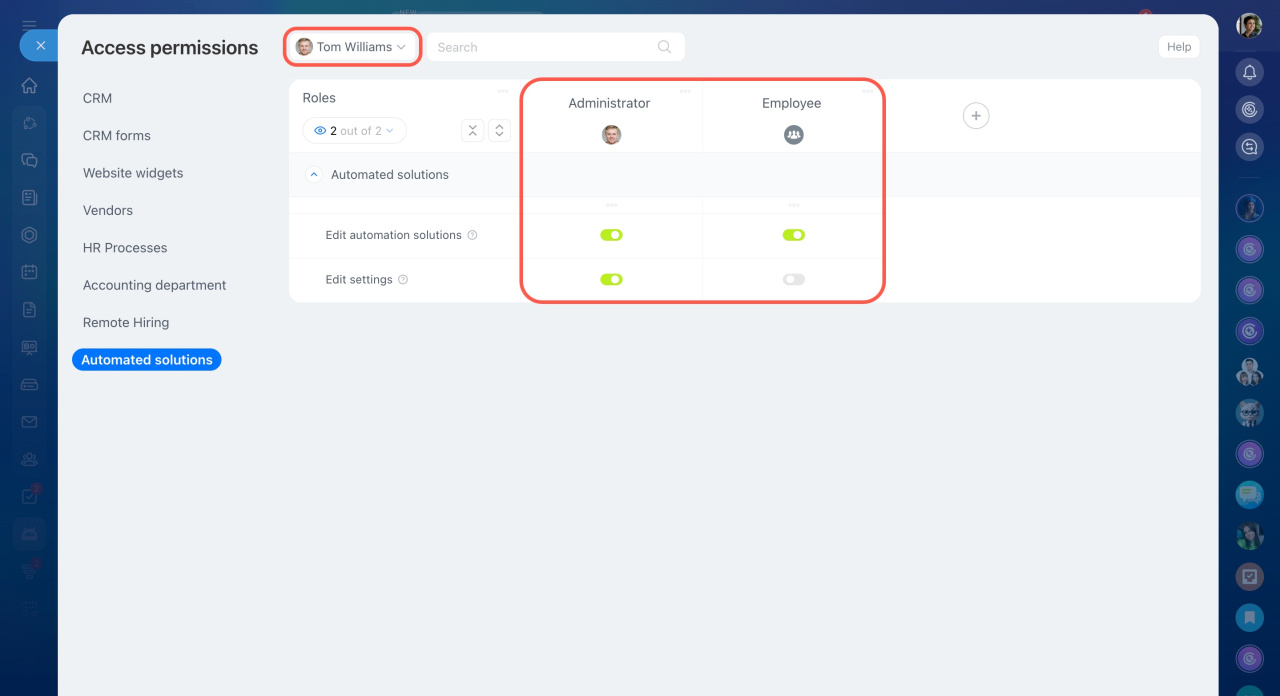 Create roles with different permissions for departments and employees. For example, the HR department might have full access to the Hiring automated solution, while other users may only view items.