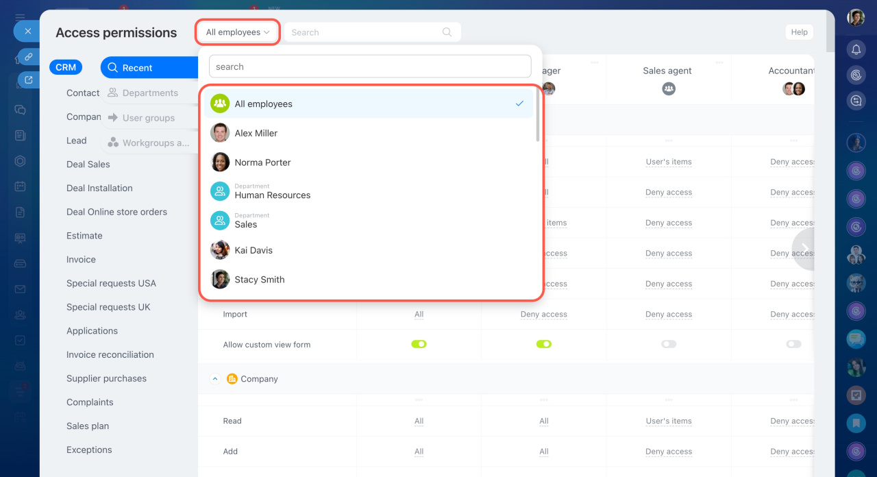 Role-based access permissions allow you to set up specific permissions to the CRM section. Create roles with different access levels for departments and employees. For example, the head of the sales department might have full access to CRM items, while agents may only manage their own deals.