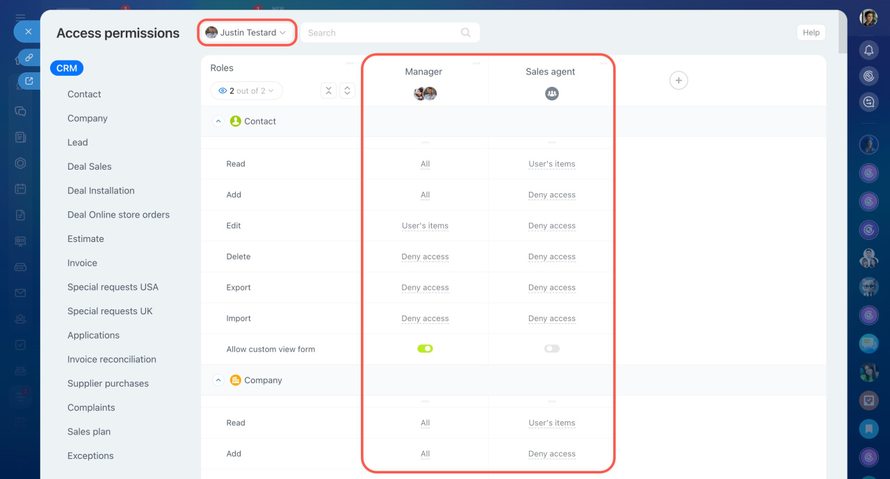 By default, there are two roles in the CRM access settings: administrator and manager.