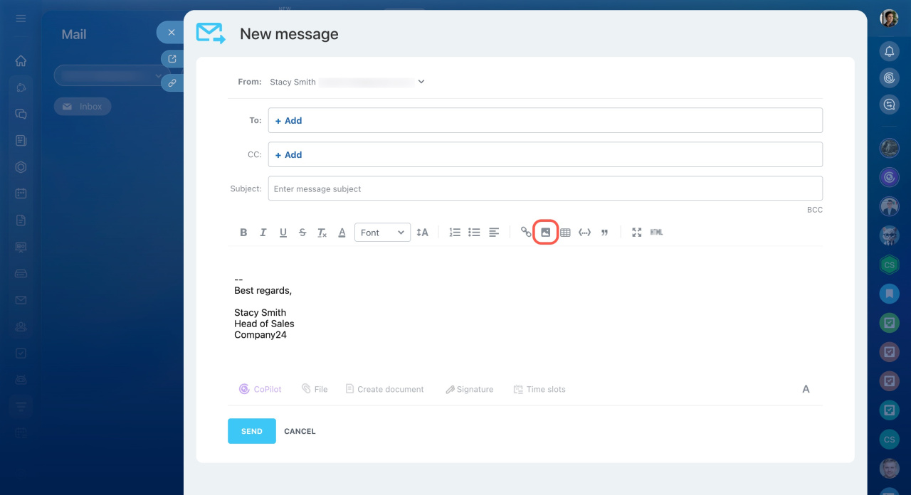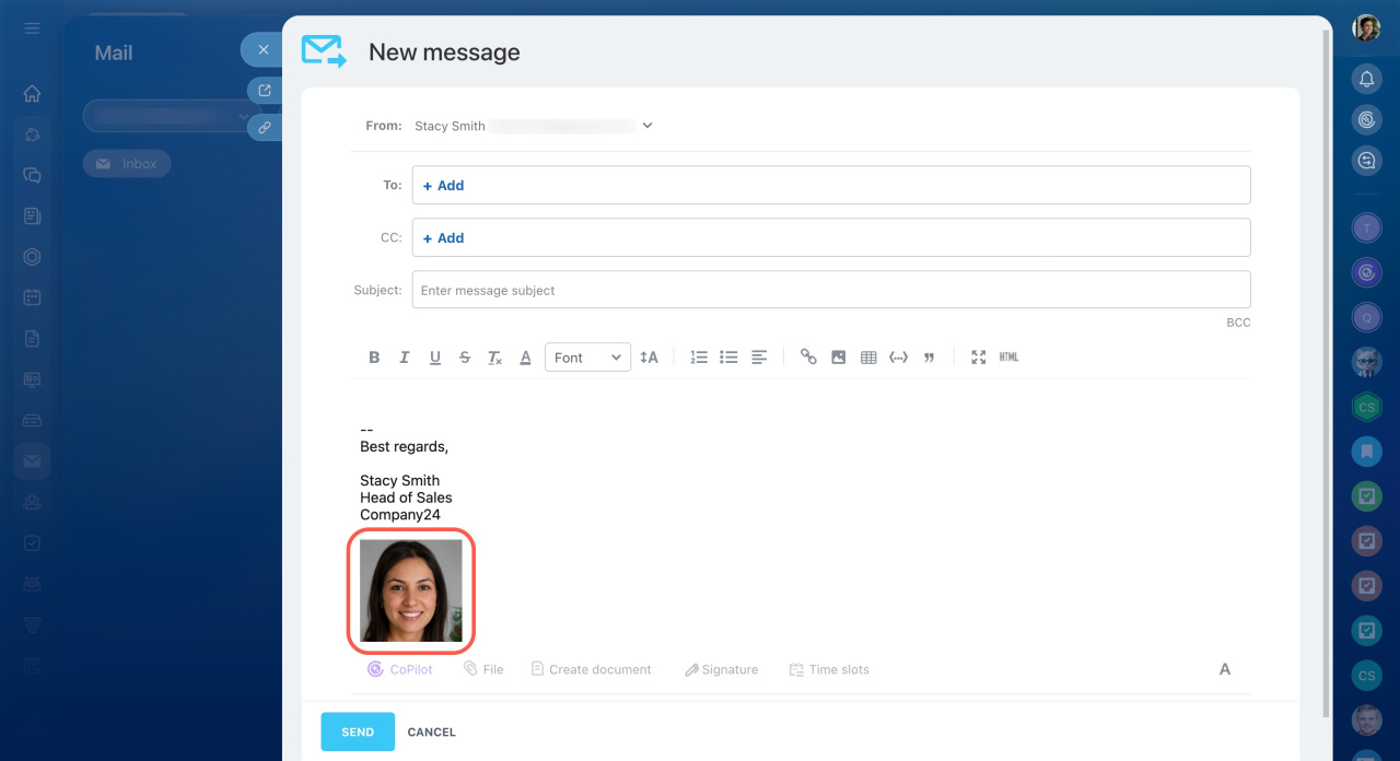 You can write emails, read, bind to tasks, and save them to CRM. Create a chat with colleagues or an event in the calendar based on the email. This article contains answers to frequently asked questions about mail.