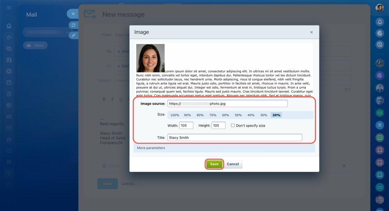 - In the Image source field, paste the link to your image, then enter the file name and size. The link must be public and accessible without logging in to Bitrix24. Use external hosting services that provide direct public links to files. Services like Bitrix24 Drive or Google Drive aren’t suitable for this purpose.