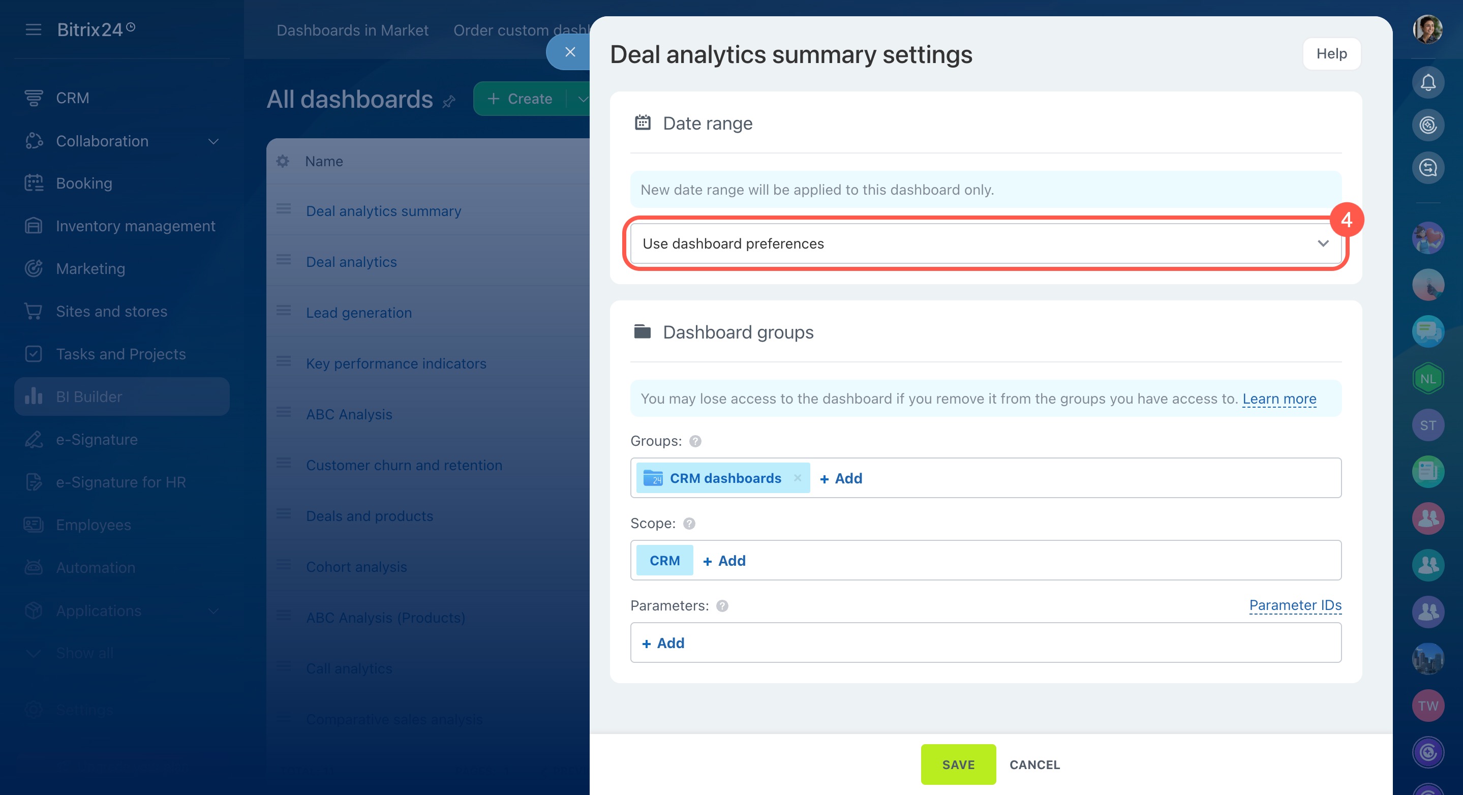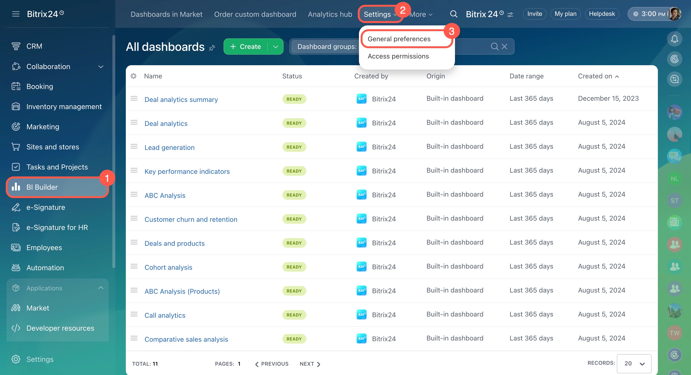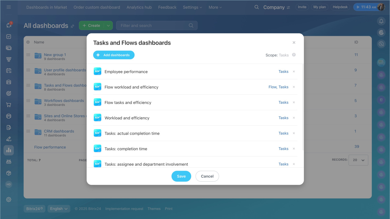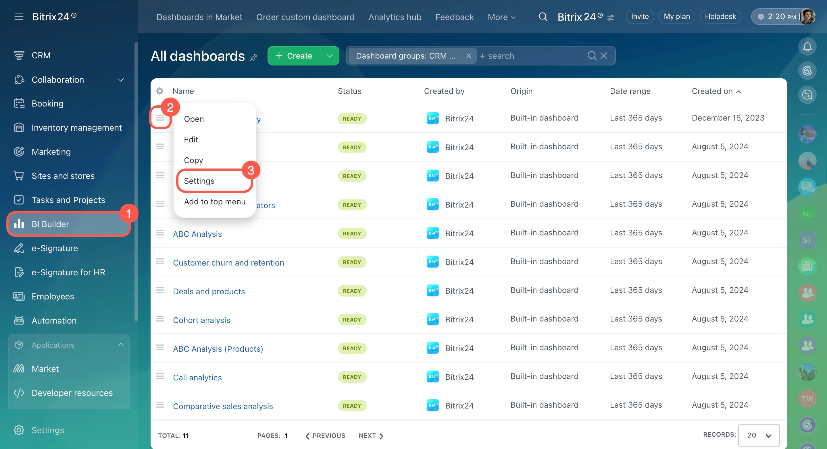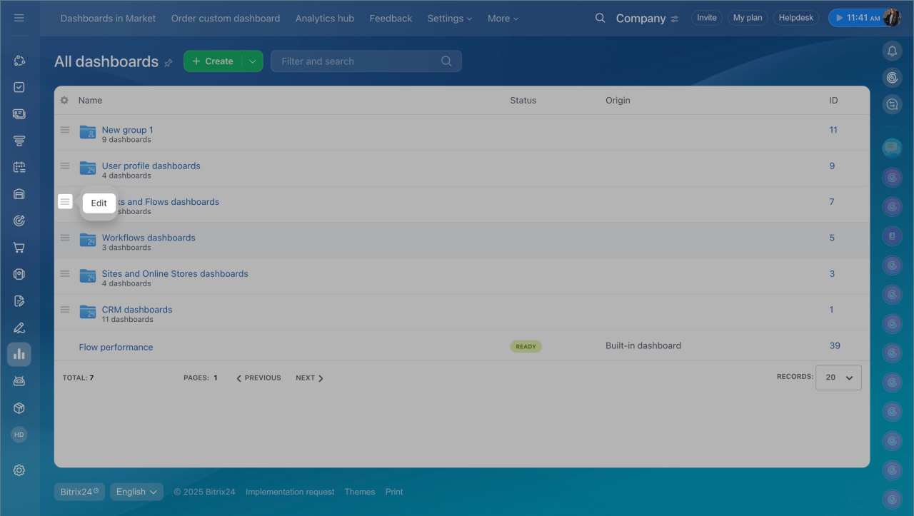 You can't modify built-in dashboards, but you can copy and edit them. Select the dashboard from the list and open Menu (≡) > Edit > Continue. Bitrix24 will create a copy that you can customize.