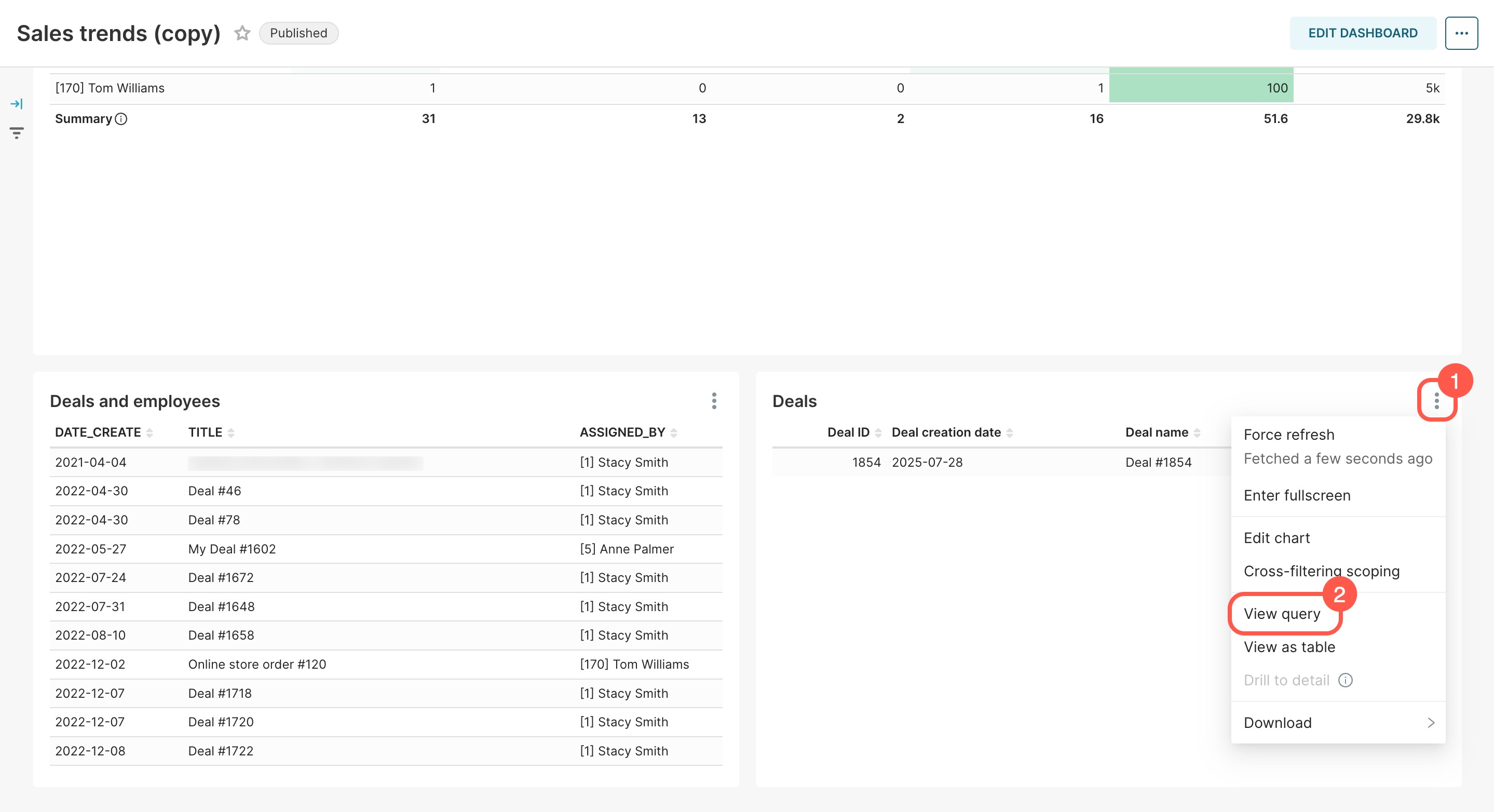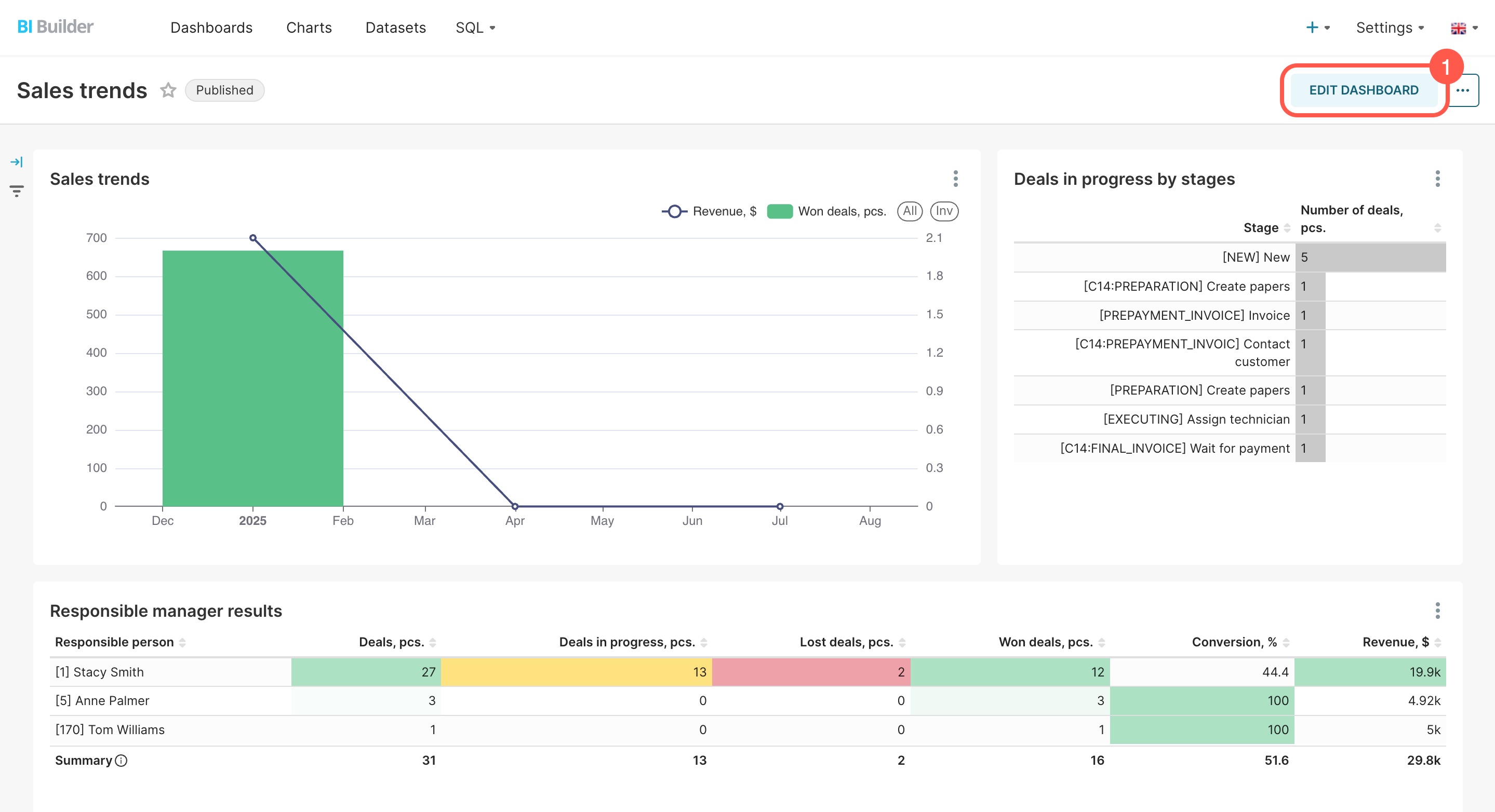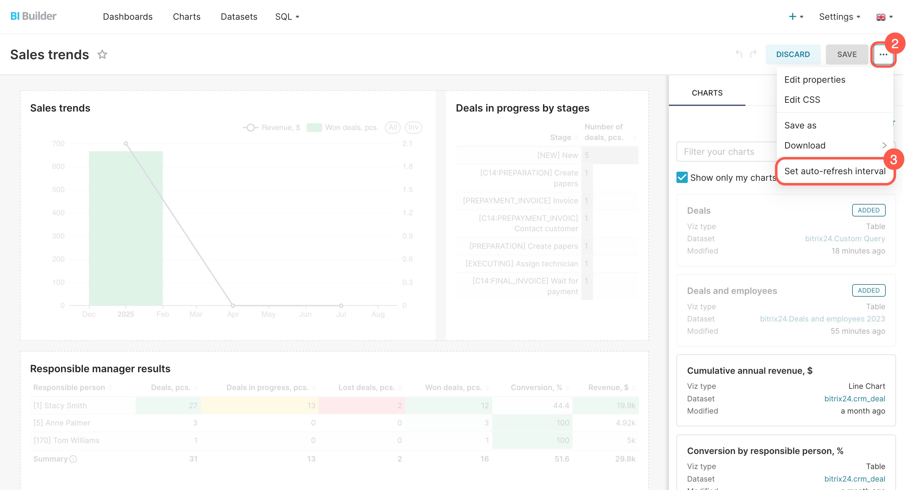 When you open a dashboard, BI Builder loads fresh data from the database and caches it for one hour. During this time, no new queries are sent, and the dashboard shows cached data. For example, if a deal is created after you open the dashboard, it will appear only after an hour. You can update the data manually or set it to refresh automatically.