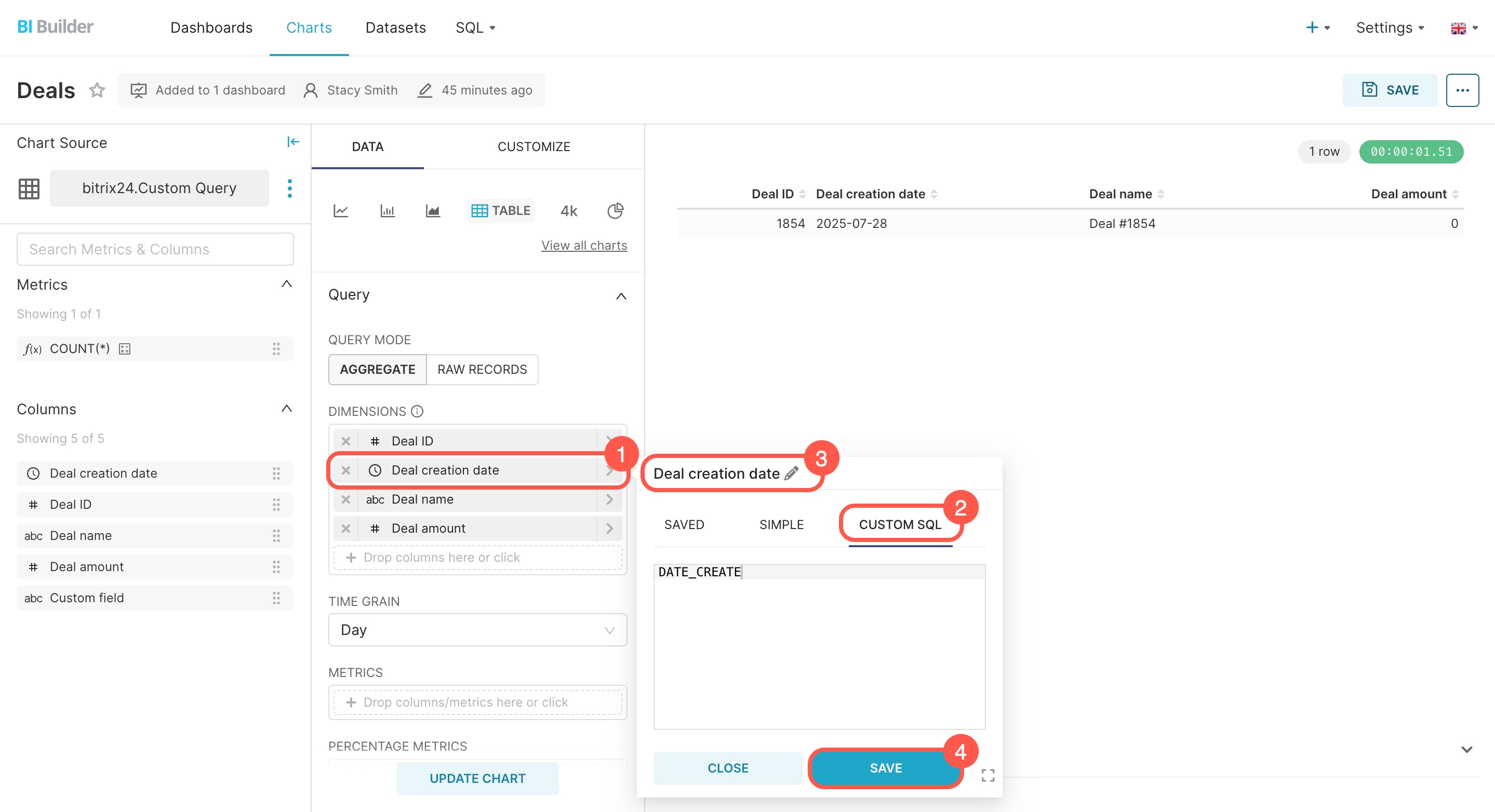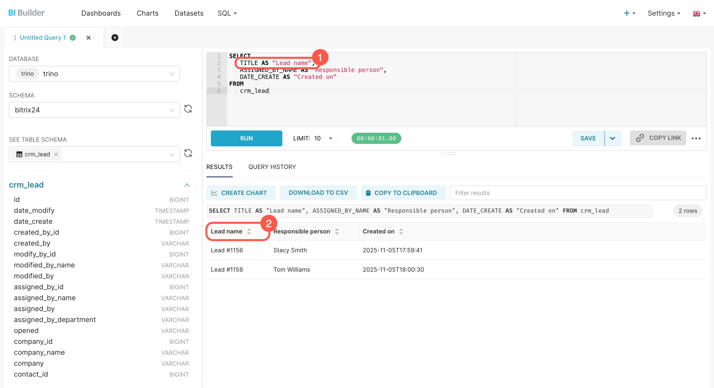 By default, BI Builder pulls field names directly from the database and displays them with system labels such as TITLE or DATE_CREATE. To make your dashboards easier to read, assign custom field names in the SQL query, dataset settings, or chart settings.