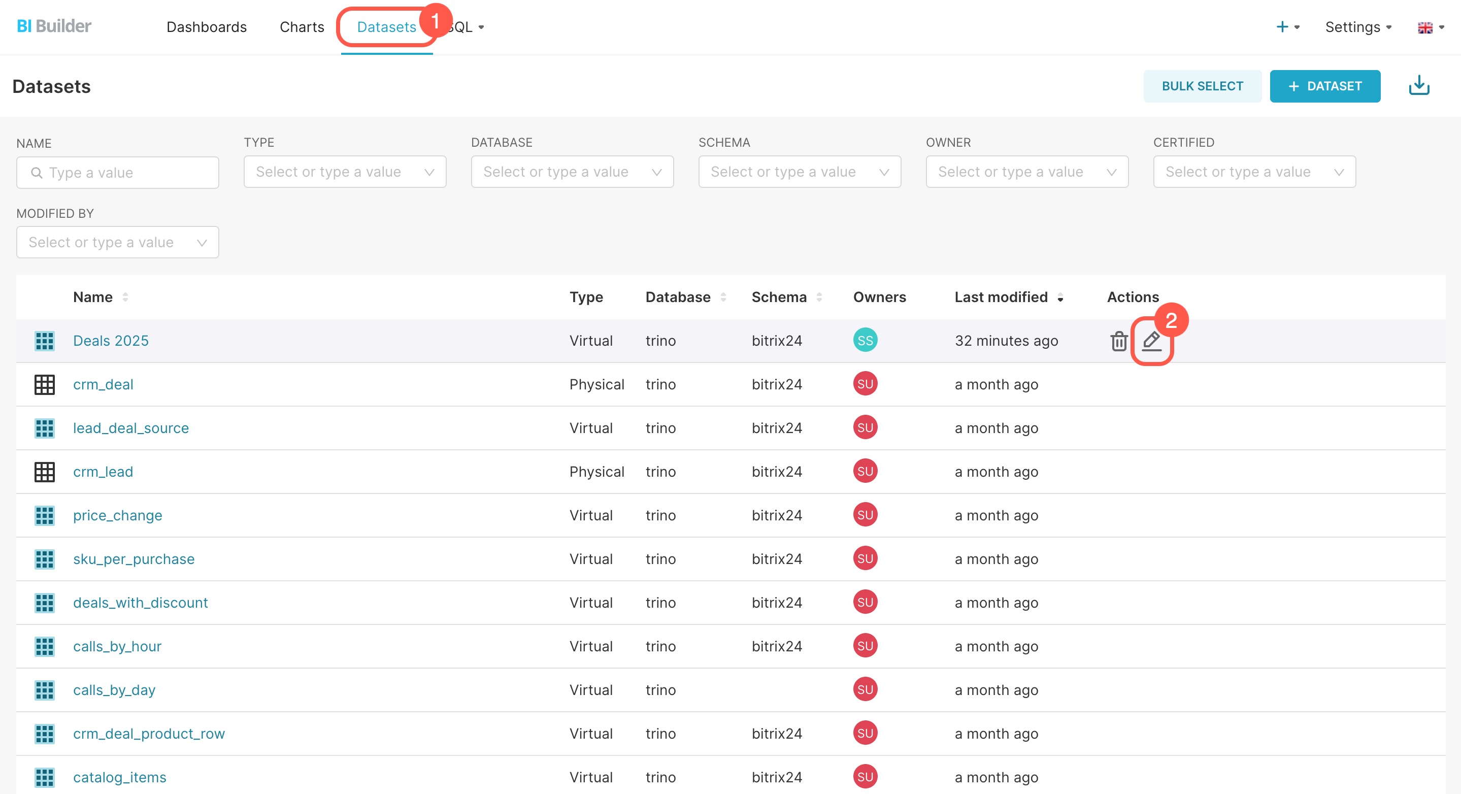 Make sure the dataset includes a Date/Time column, such as DATE_CREATE or CLOSEDATE. BI Builder cannot filter data without one.