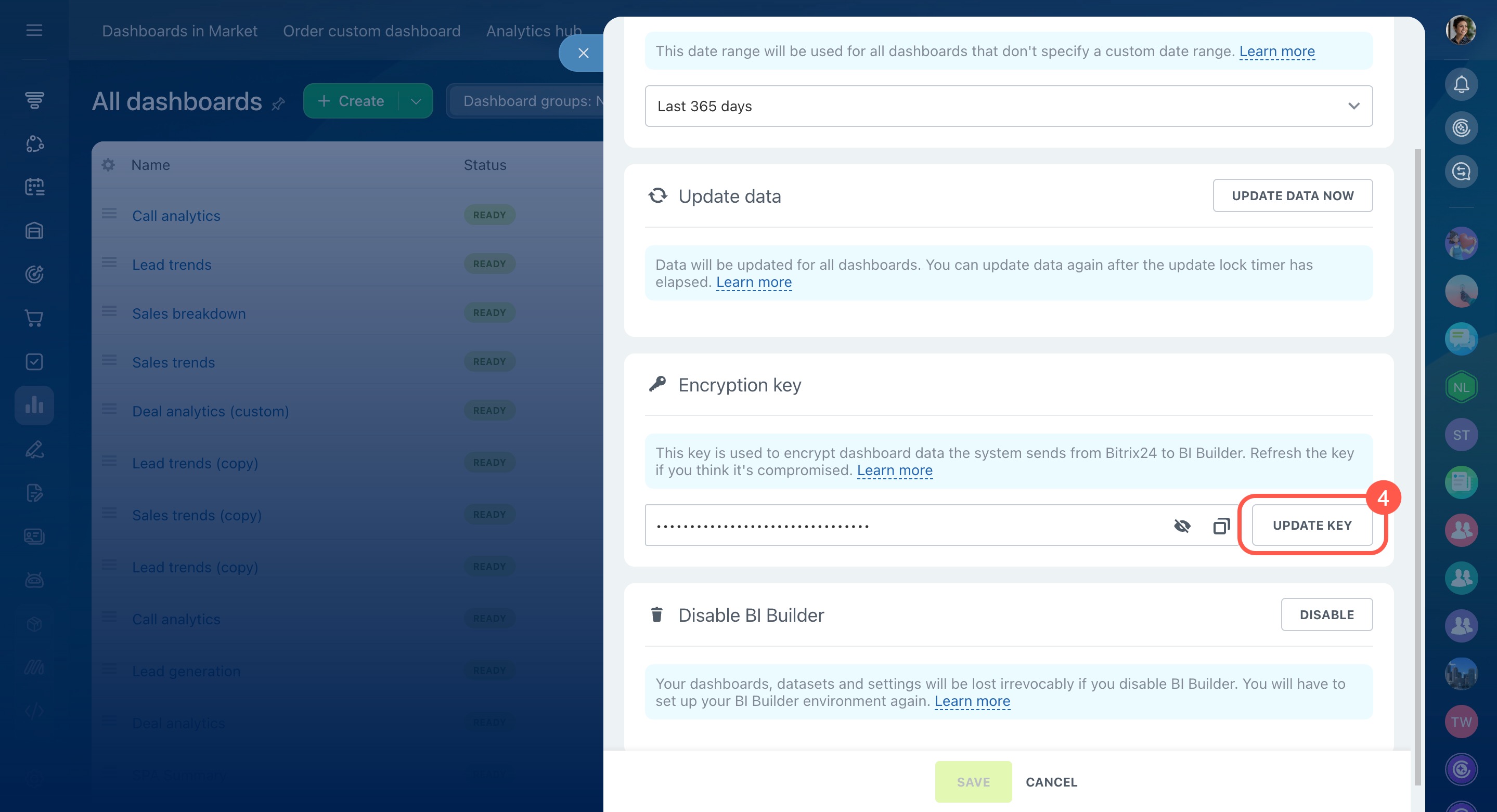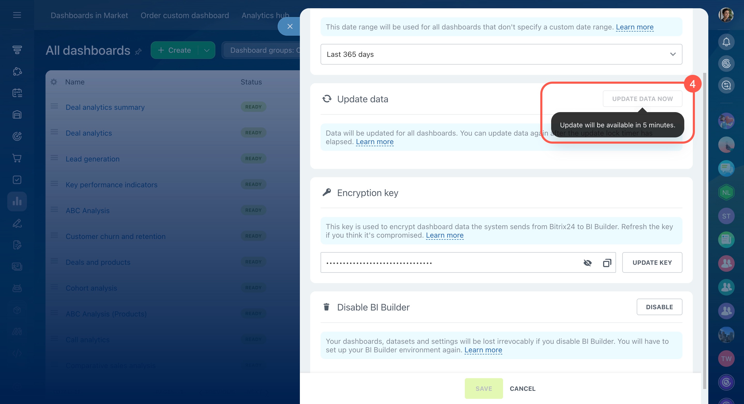 If a dashboard in BI Builder doesn’t open for more than an hour or an error appears while loading, the data source may be temporarily unavailable. This can happen when Bitrix24 fails to retrieve data. Updating the encryption key may help restore the report’s functionality.