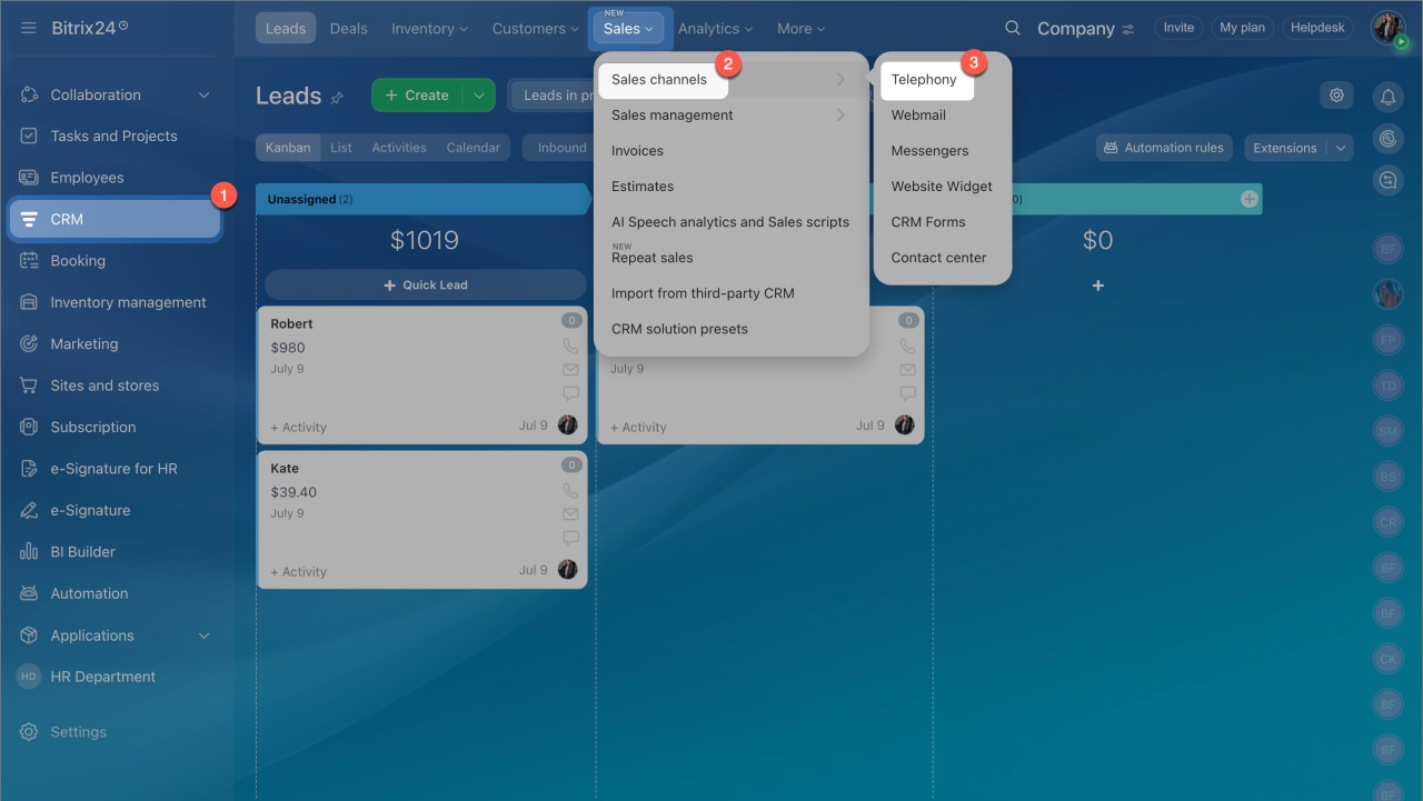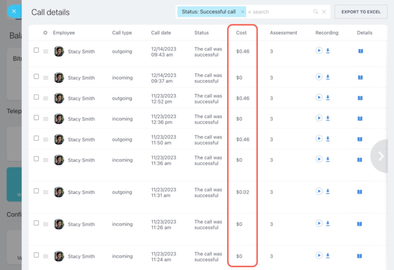 In your Bitrix24 account, go to CRM > Add-ons > Telephony > Call details and display the Cost column. The calls can be filtered by cost, employee, etc.