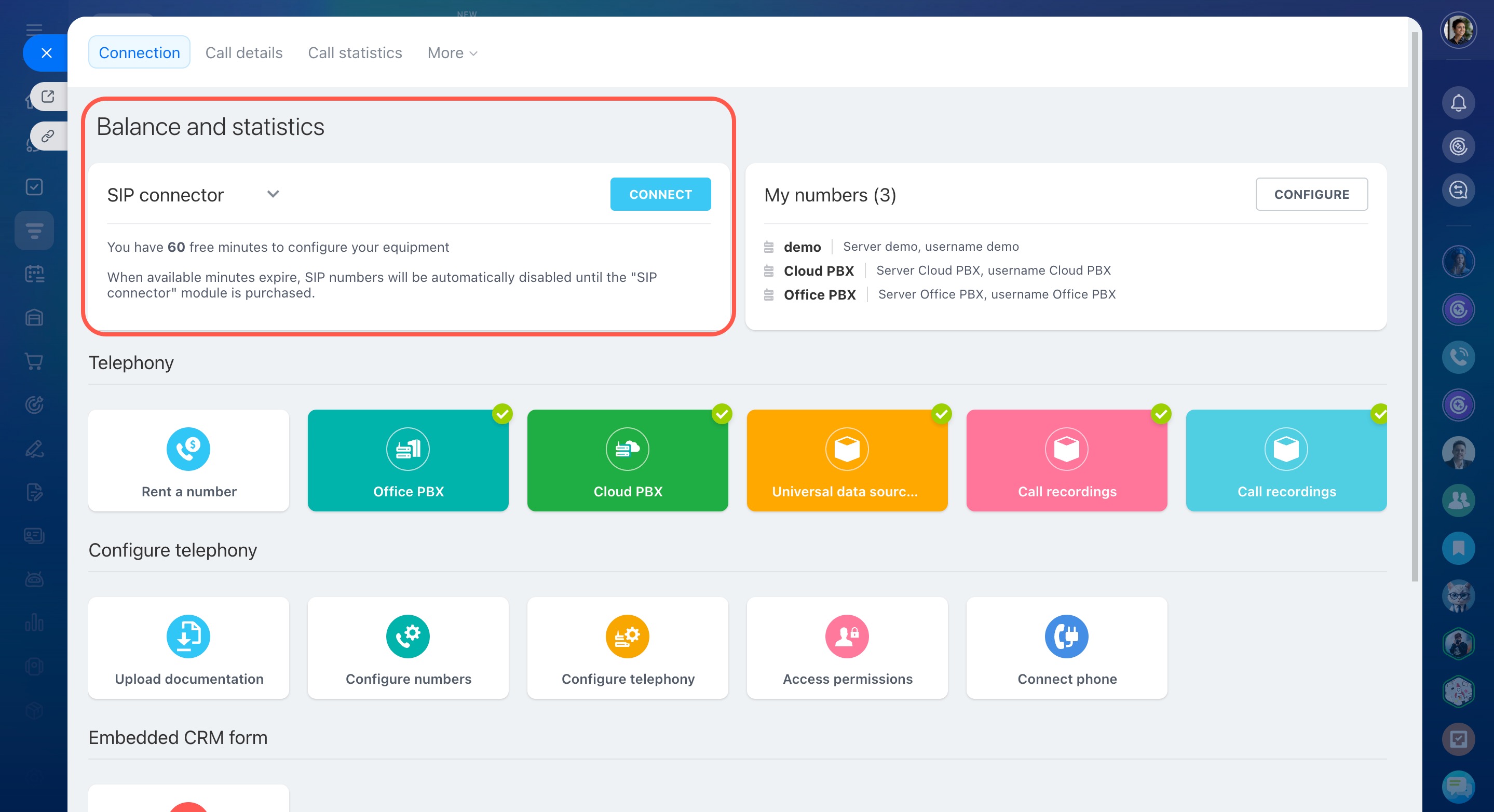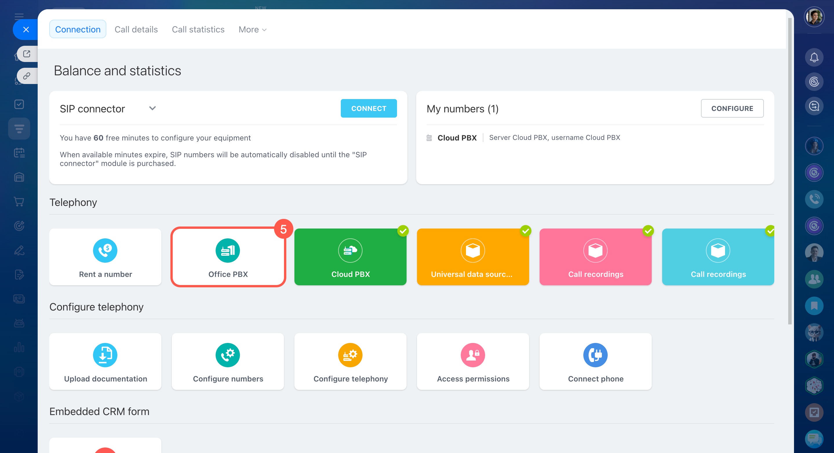 Connect your office PBX to Bitrix24 using either REST API or the SIP connector. You can link an unlimited number of office PBXs to your account.