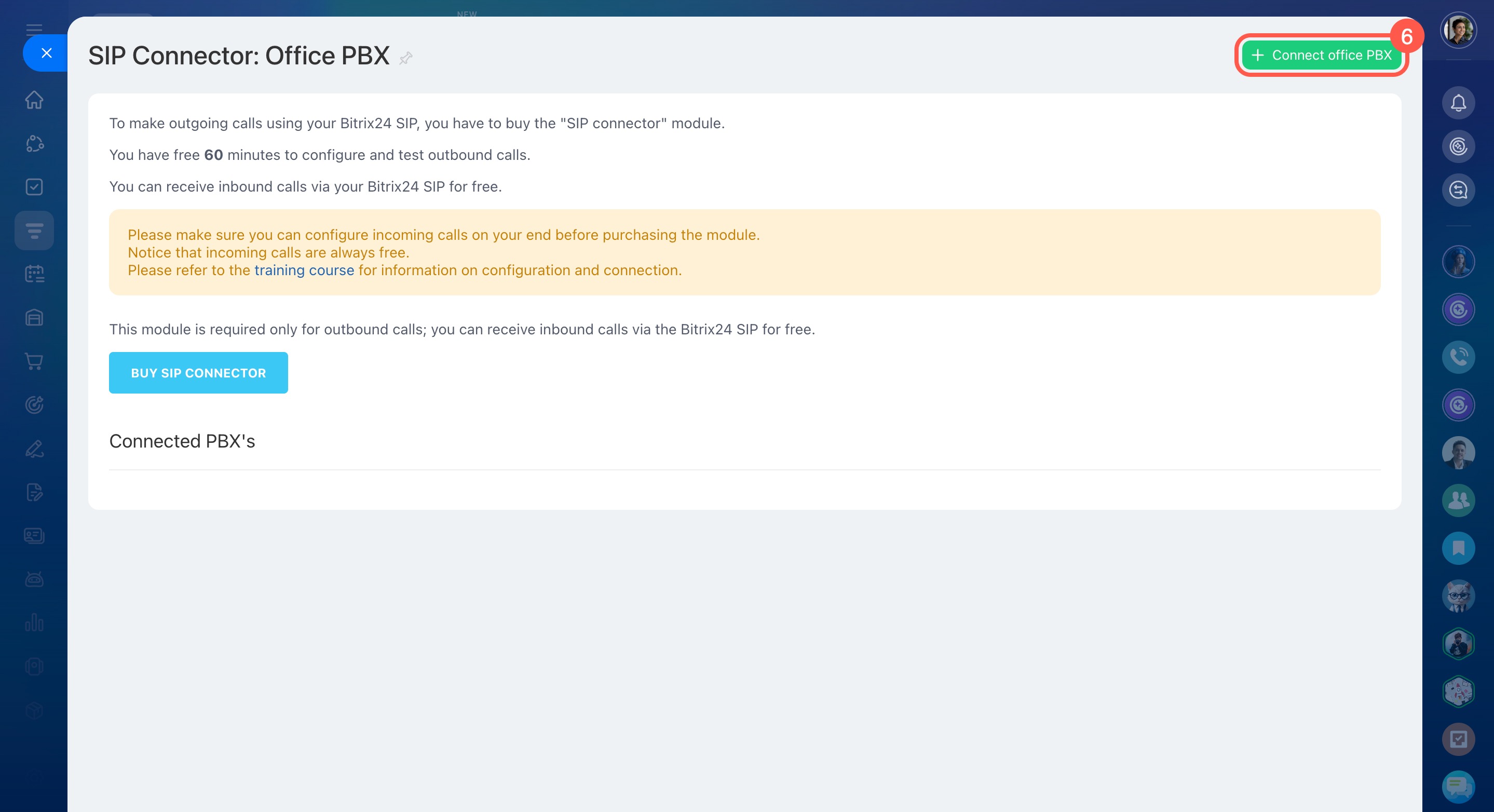 You can receive incoming calls for free via your Bitrix24 SIP PBX, but you'll need the SIP connector for outgoing calls or call forwarding.
