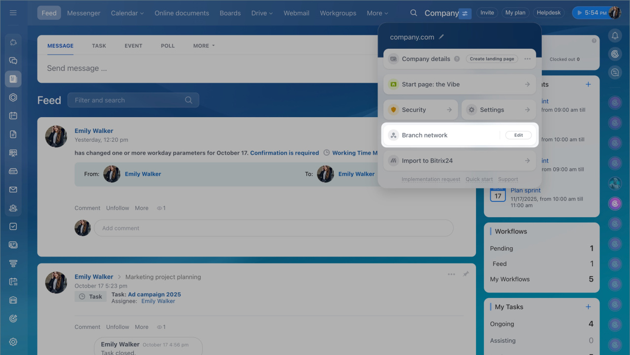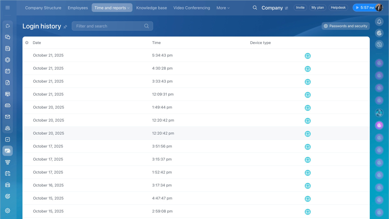 Monitoring network security compliance is crucial for any company. Unauthorized access to information can lead to significant financial and reputational damage. The new Employee Login History feature enables you to manage access to Bitrix24 from various devices. If an unfamiliar device logs into the account, users can log out from all devices except the current one with a single click. Bitrix24 administrators can also track employee logins and, if necessary, enforce logouts on all employee devices.