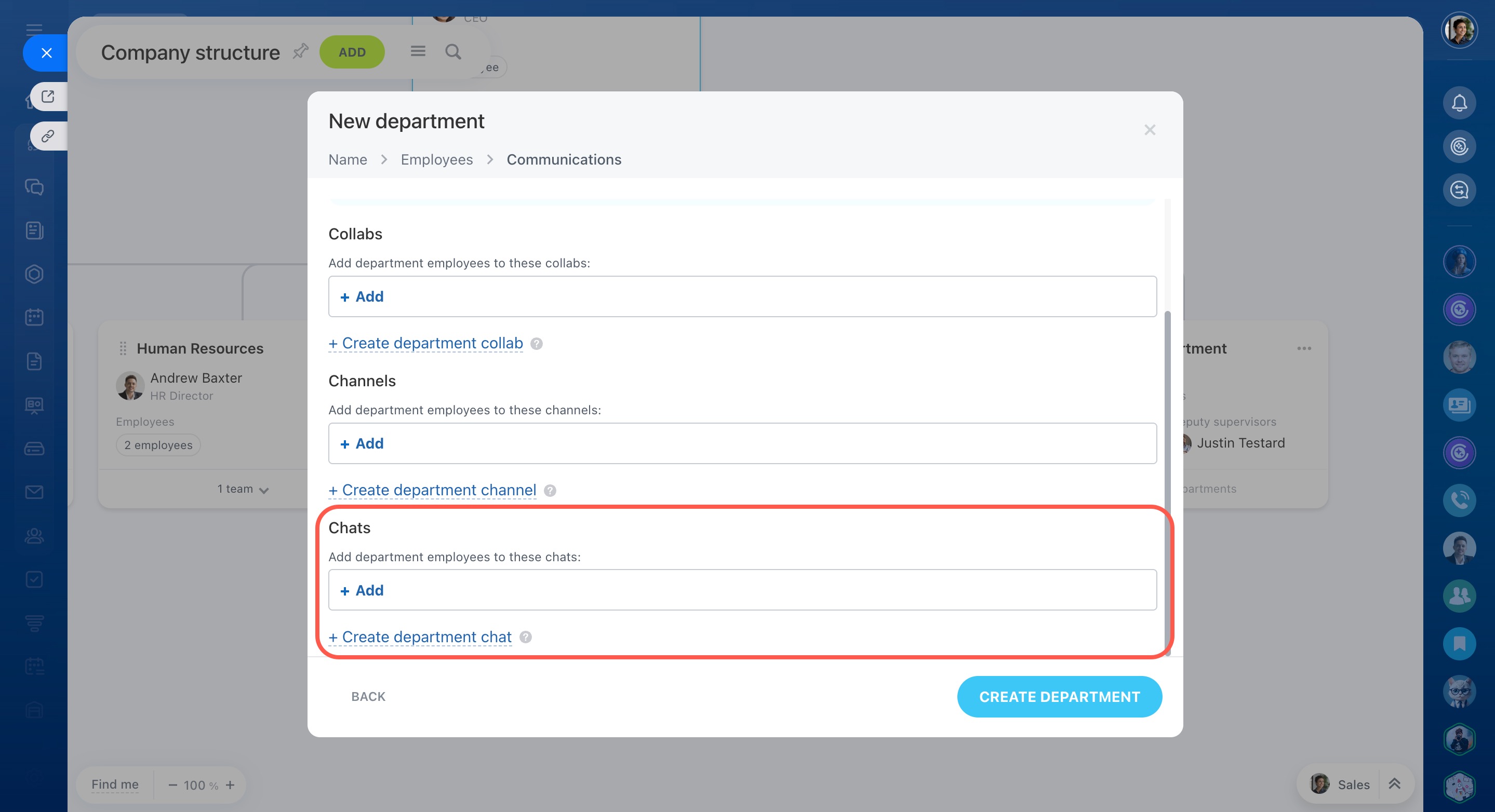 You can add an entire department to a chat, channel, or collab, and new employees will be connected automatically. This ensures users receive important updates right away and can join work discussions.