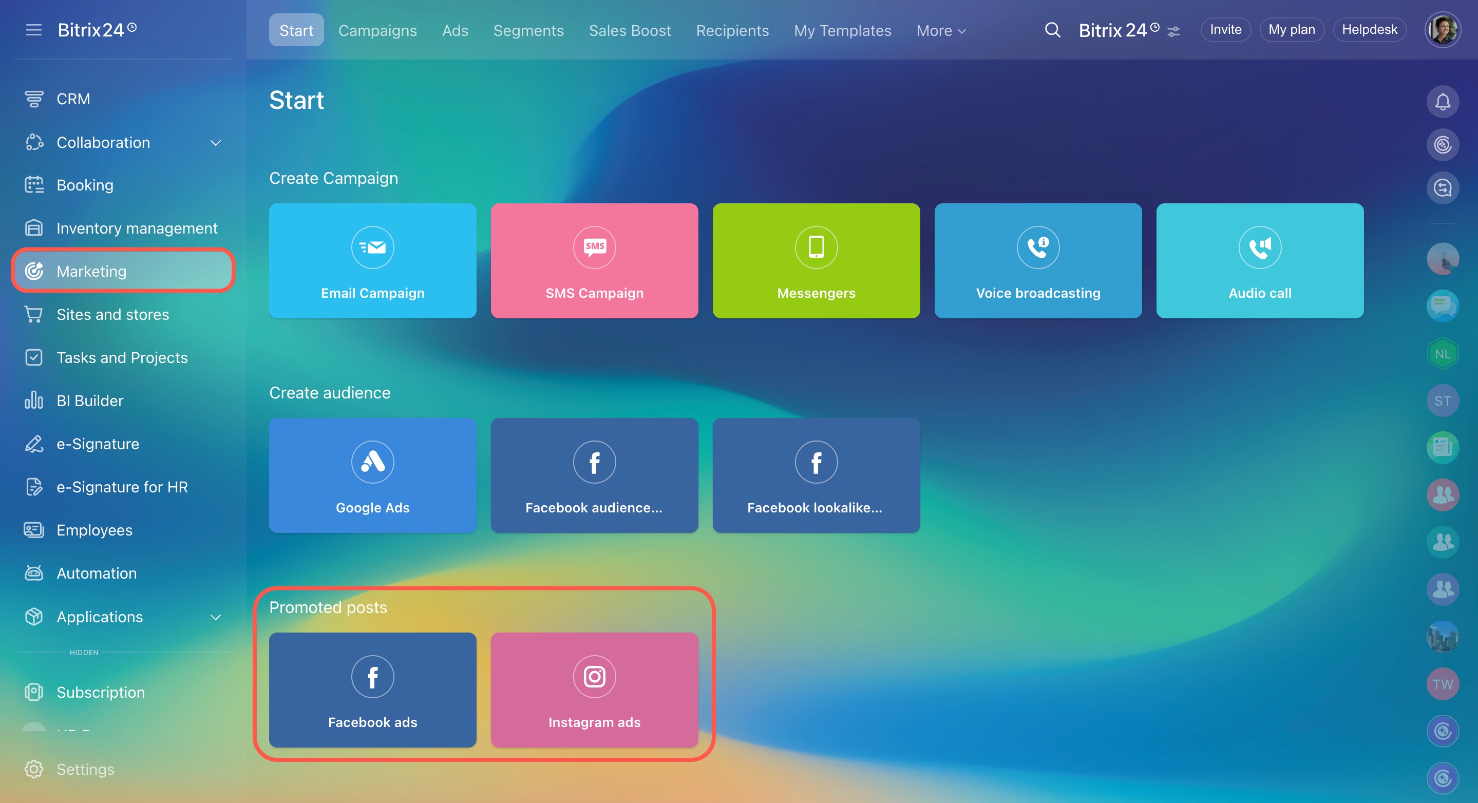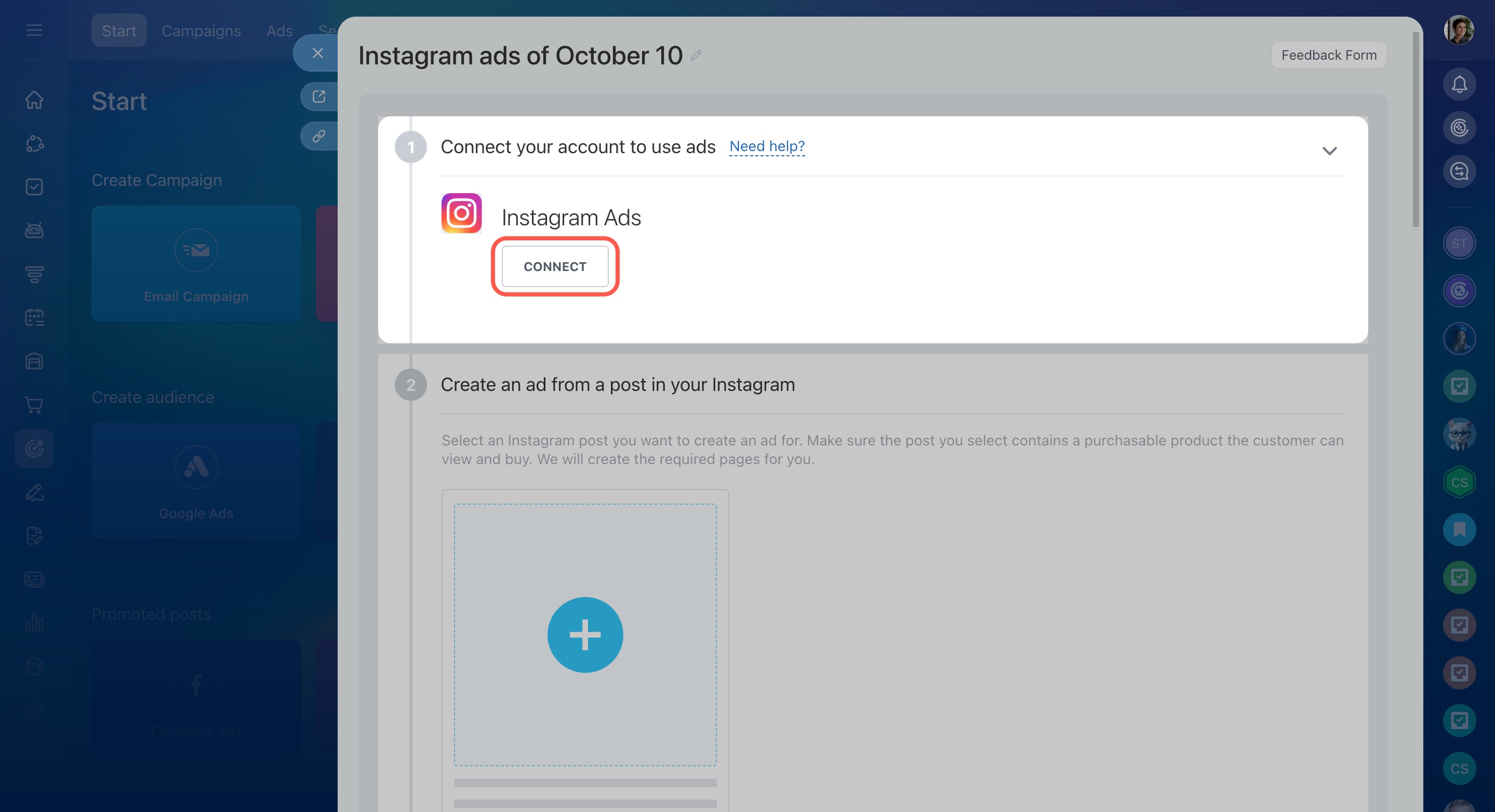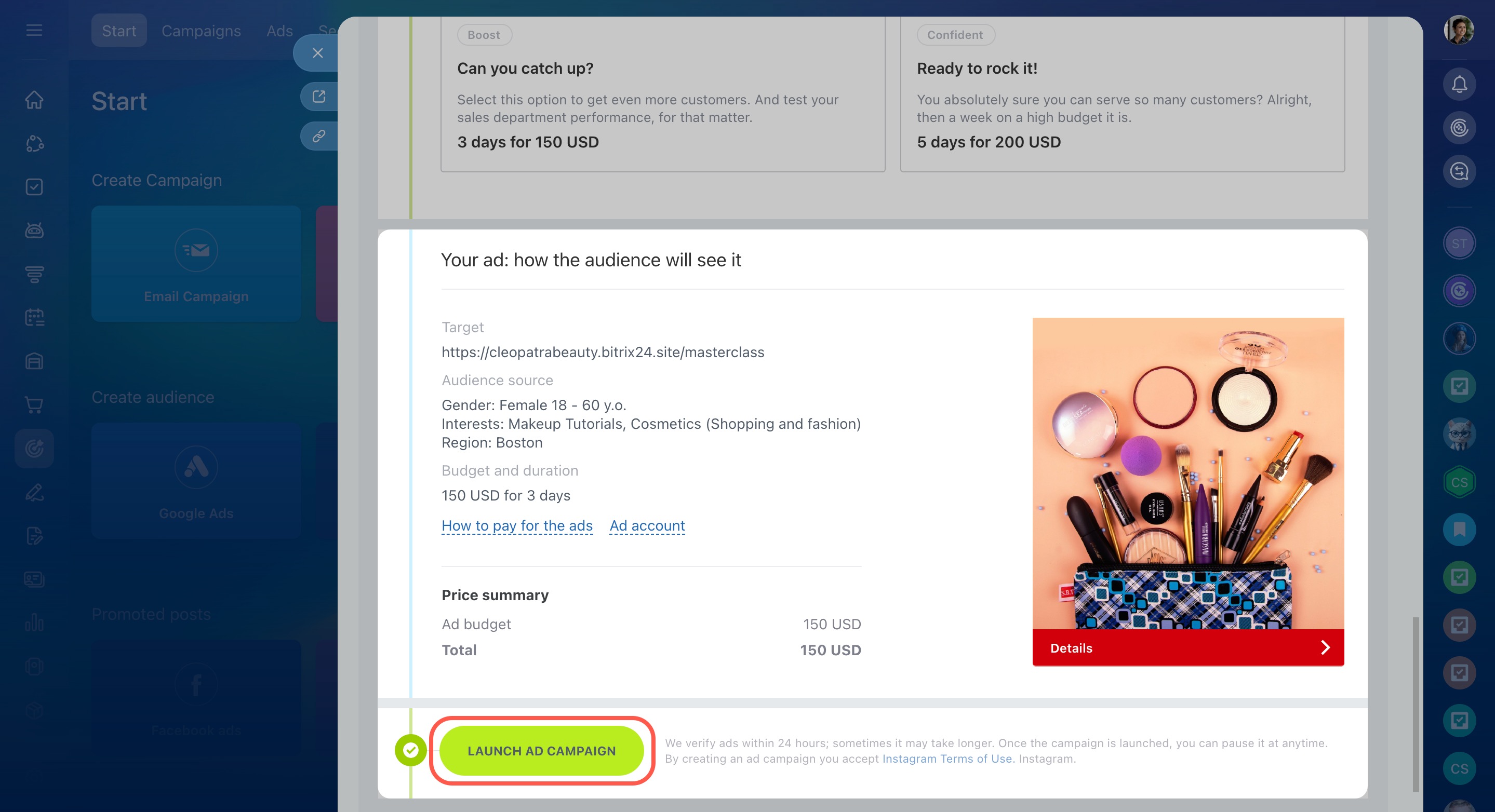 The process of setting up ads in Bitrix24 for Facebook and Instagram is the same. Let's take Instagram as an example and see how it works.
