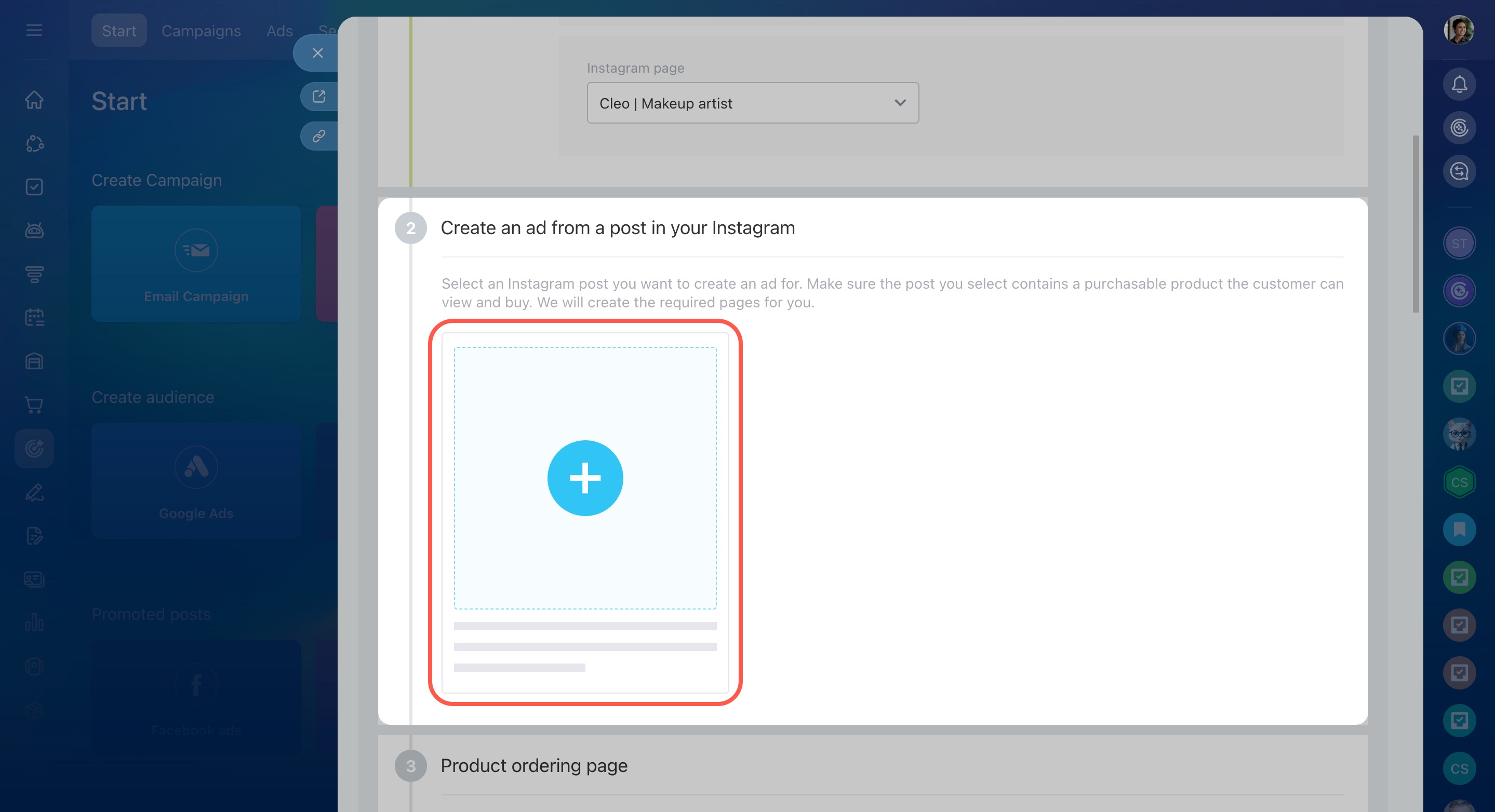To set up ads, go to the Marketing section and choose either Facebook ads or Instagram ads under Promoted posts.