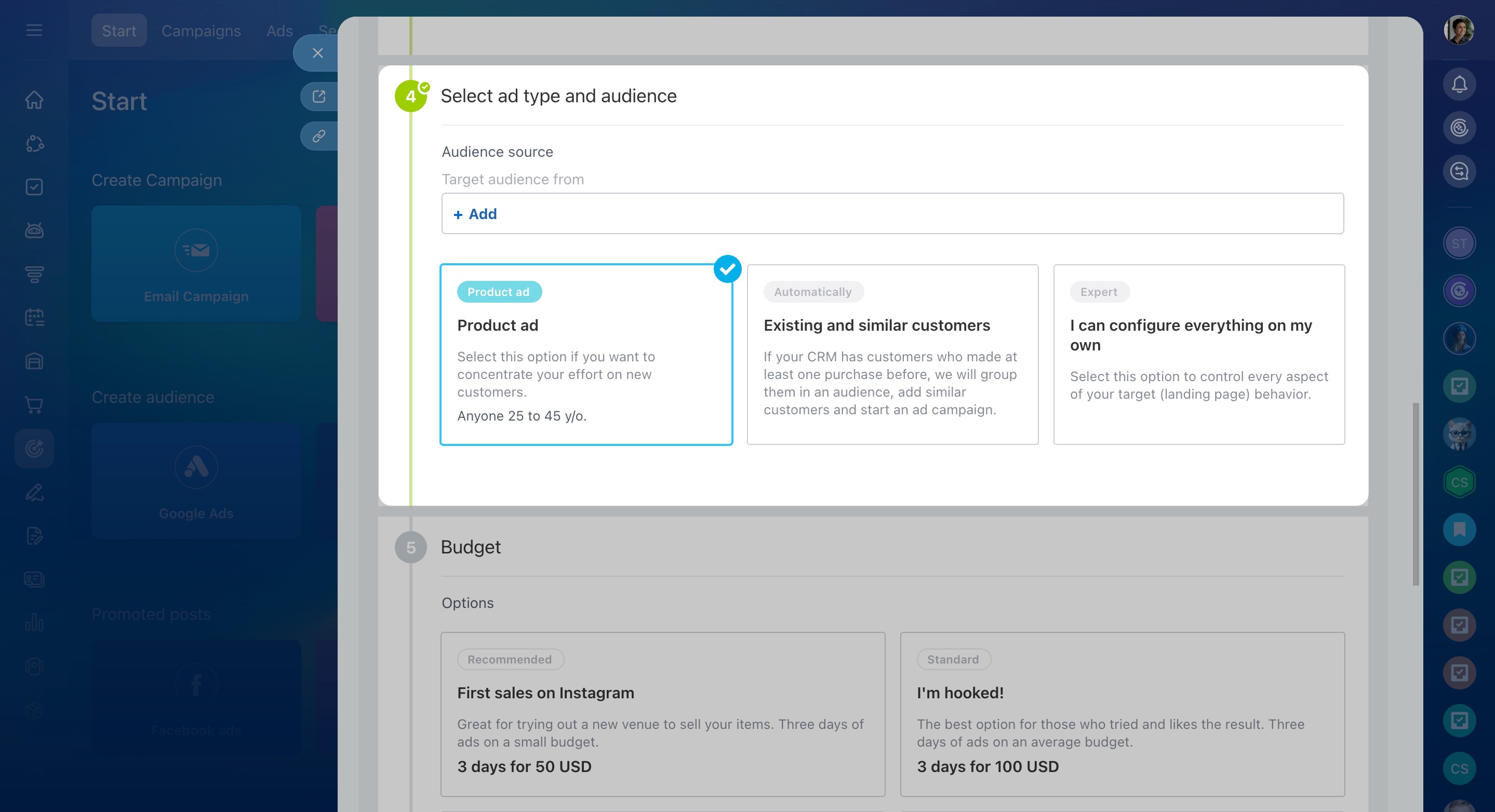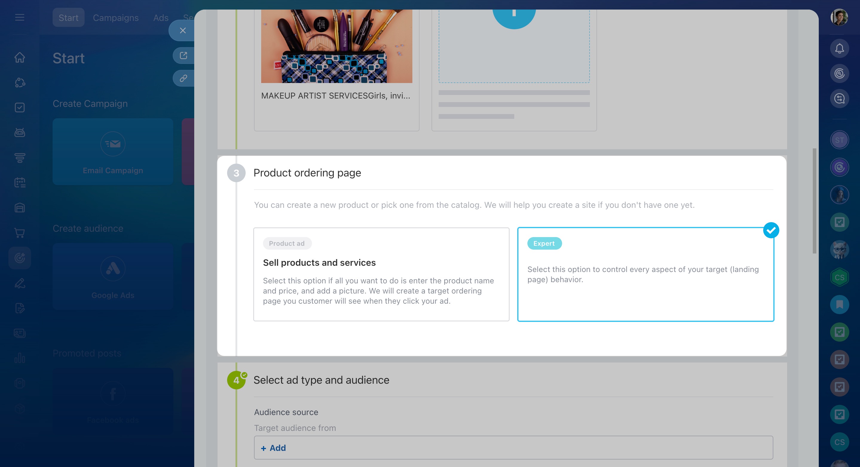 Choose an ad type and audience, or customize everything yourself.