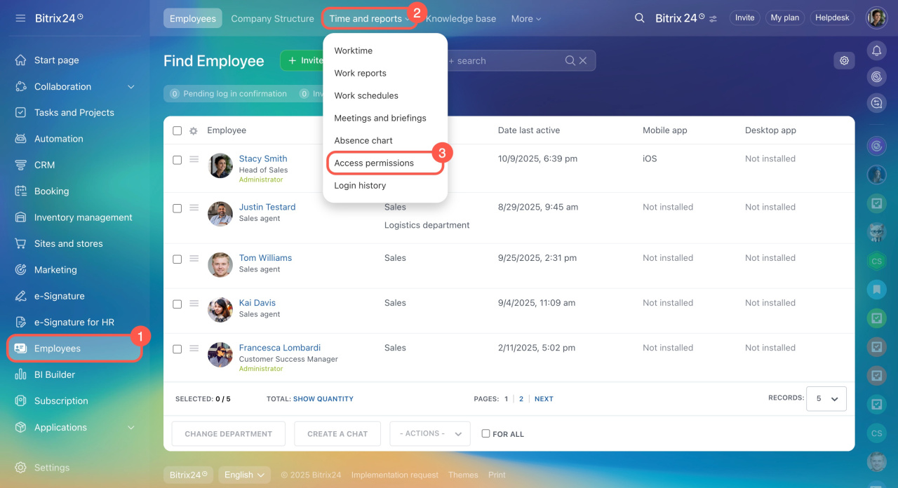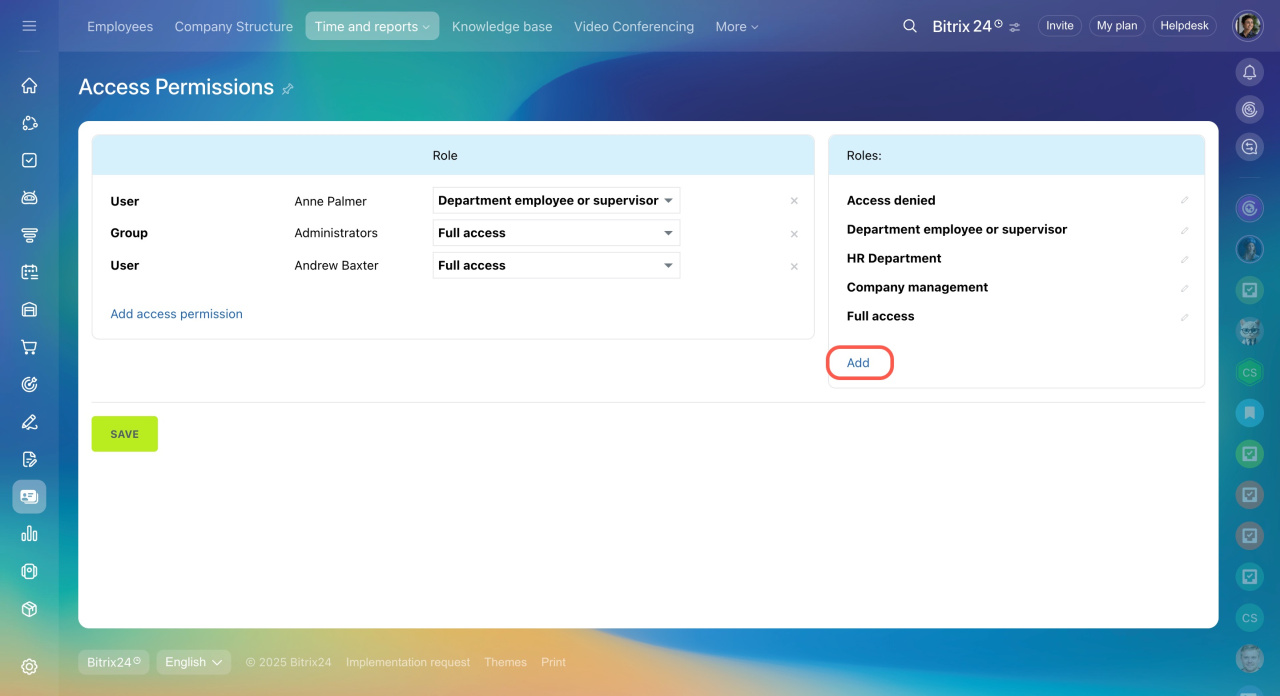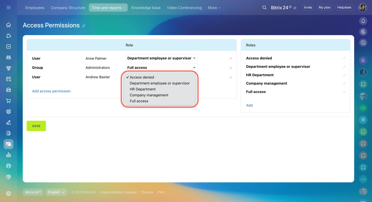 The default setup includes two user groups - administrators and regular users - with pre-set access permissions and standard roles. Here you can also create new roles and assign them to employees and departments.