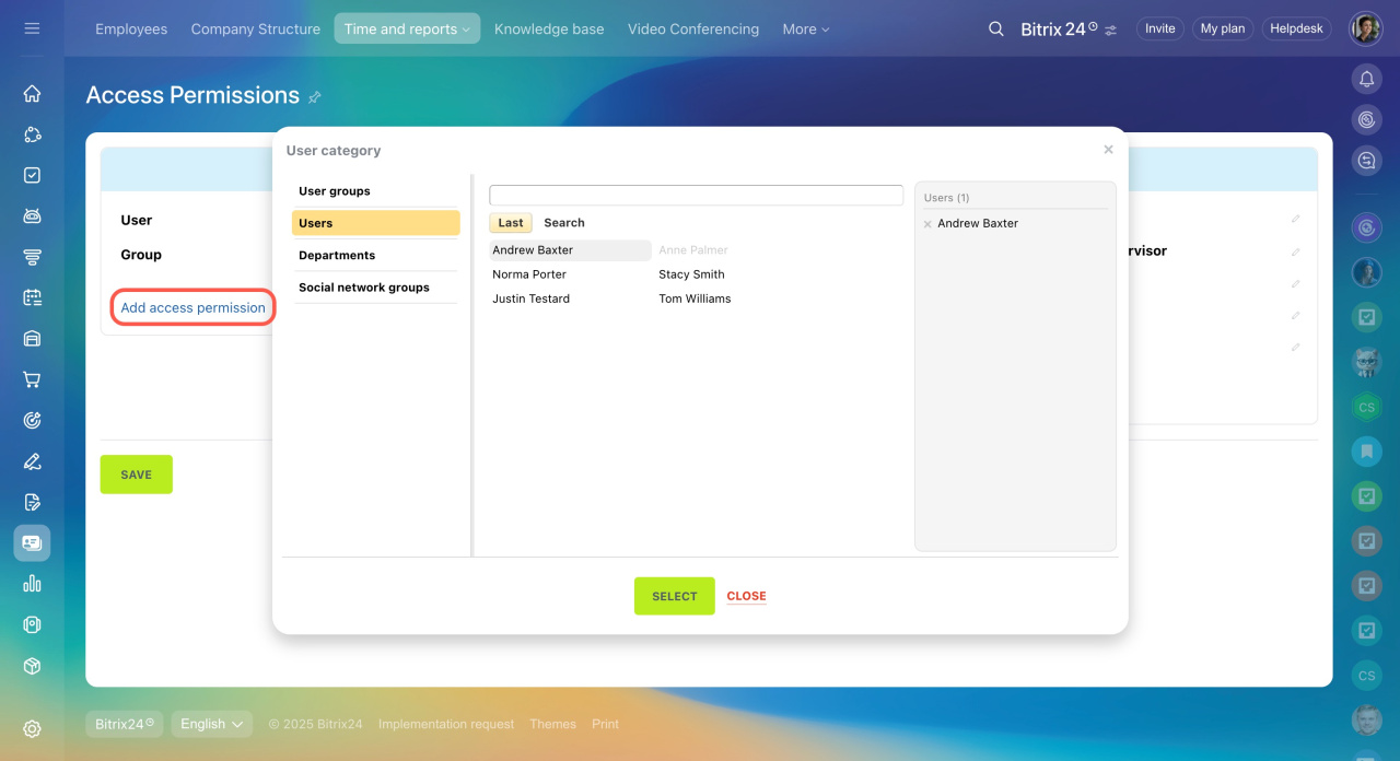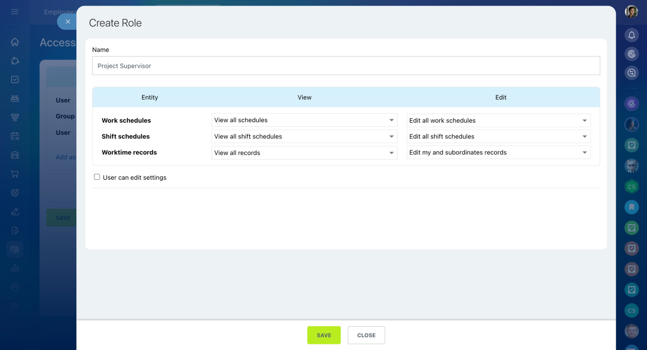 Configure access permissions to work schedules and work time records. Specify which sections can be viewed or edited by employees.