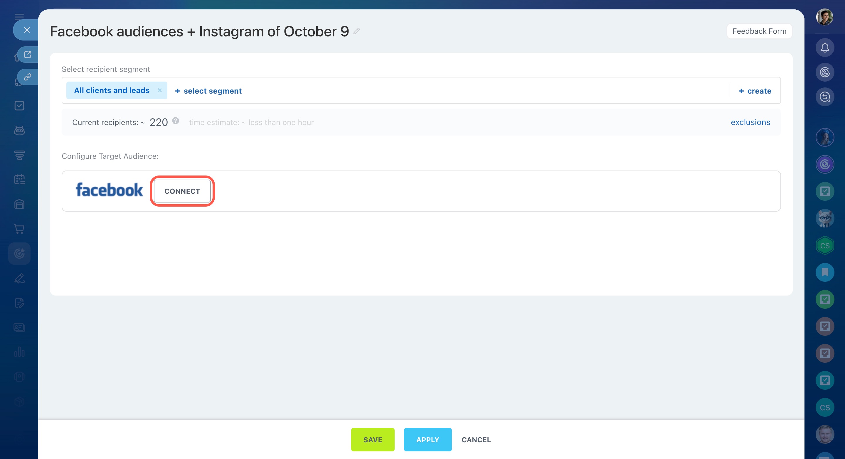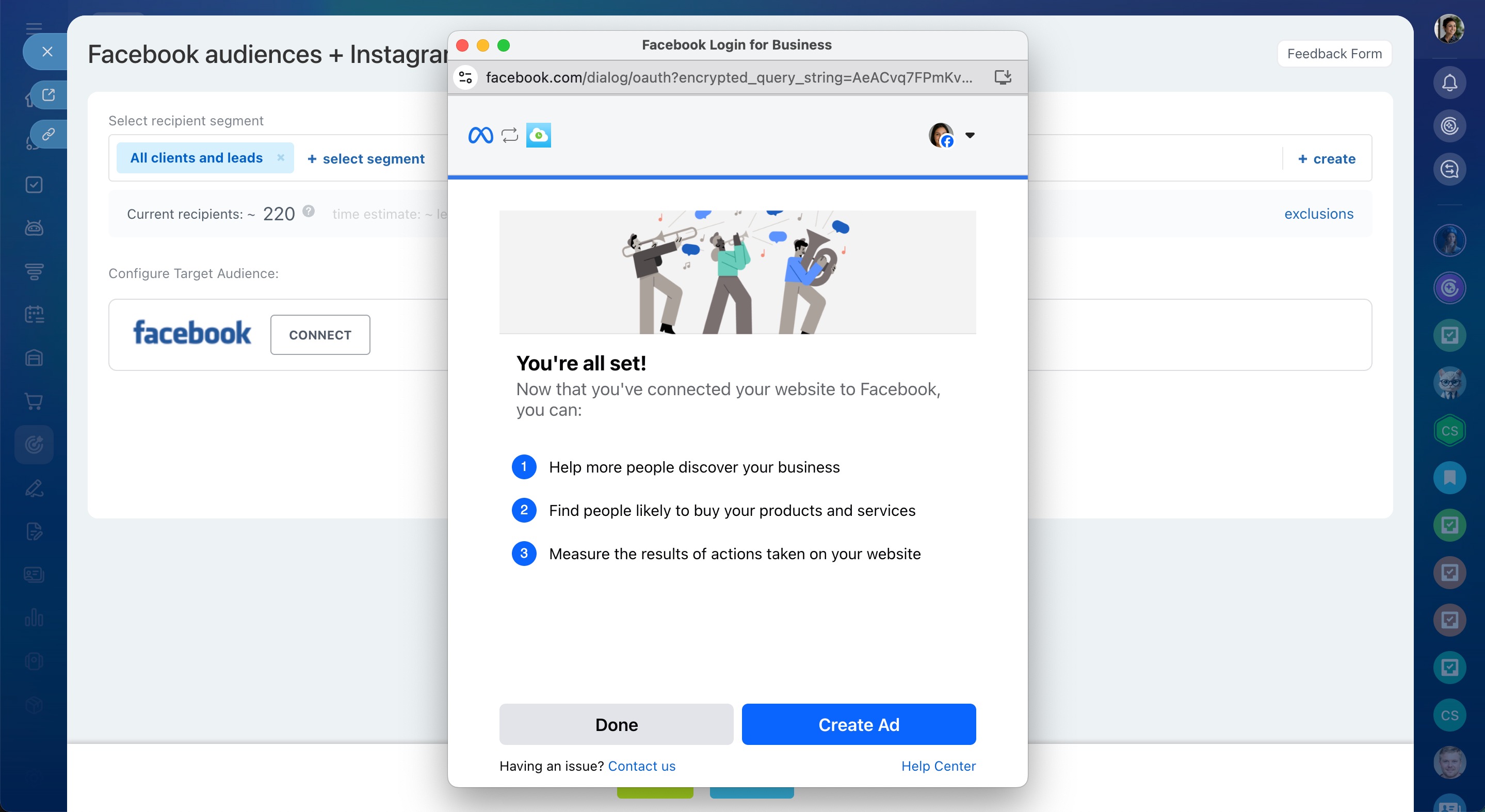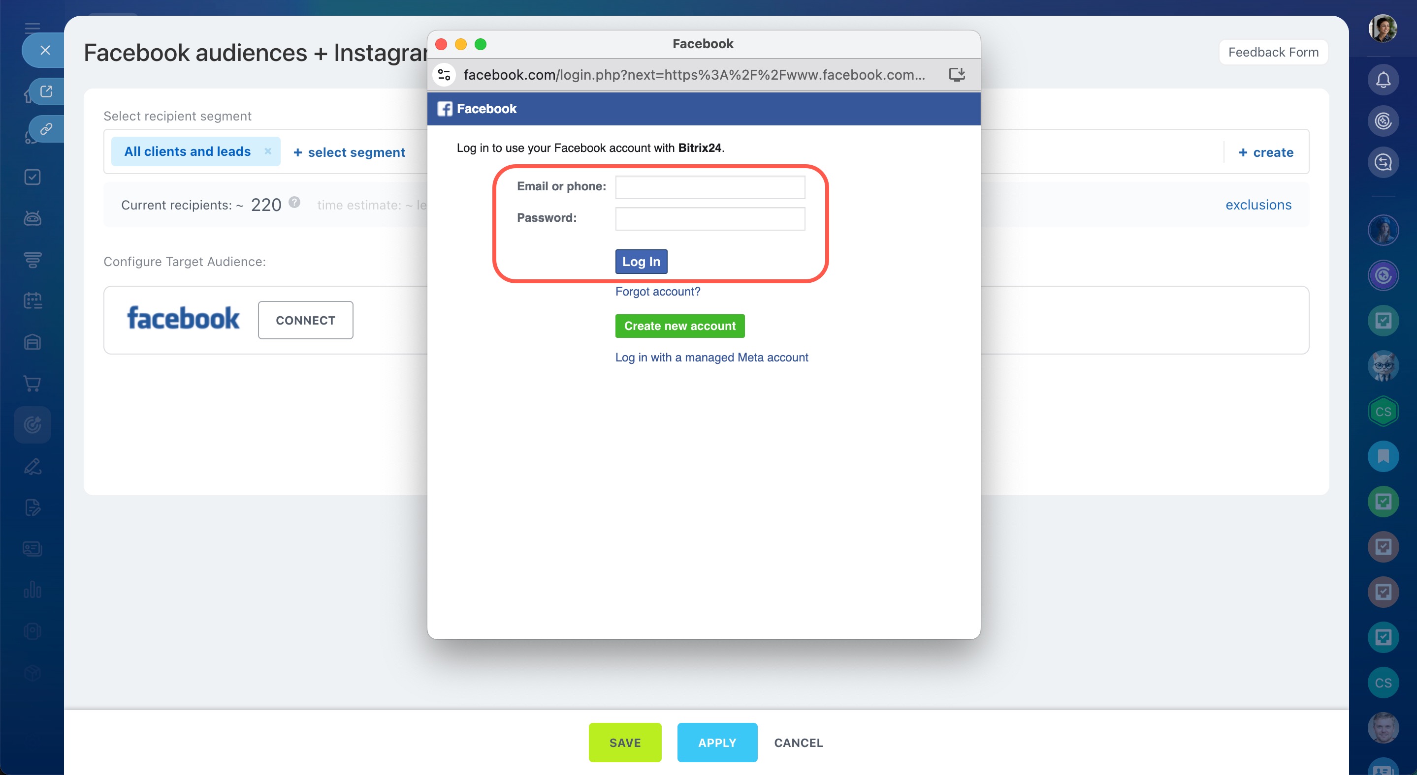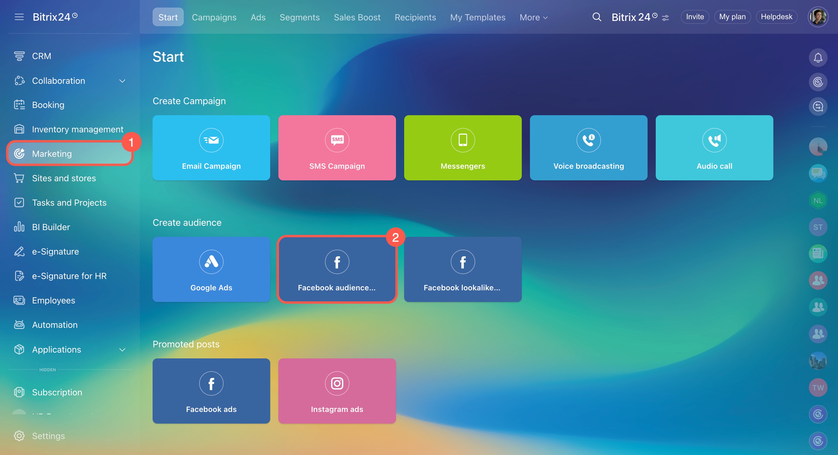 You can connect to Facebook using various Bitrix24 tools like Marketing, CRM Analytics, or CRM forms. For example, here's how to connect Bitrix24 to Facebook advertising audiences: