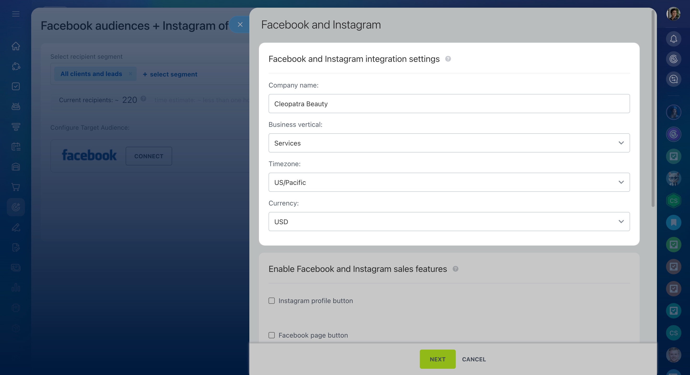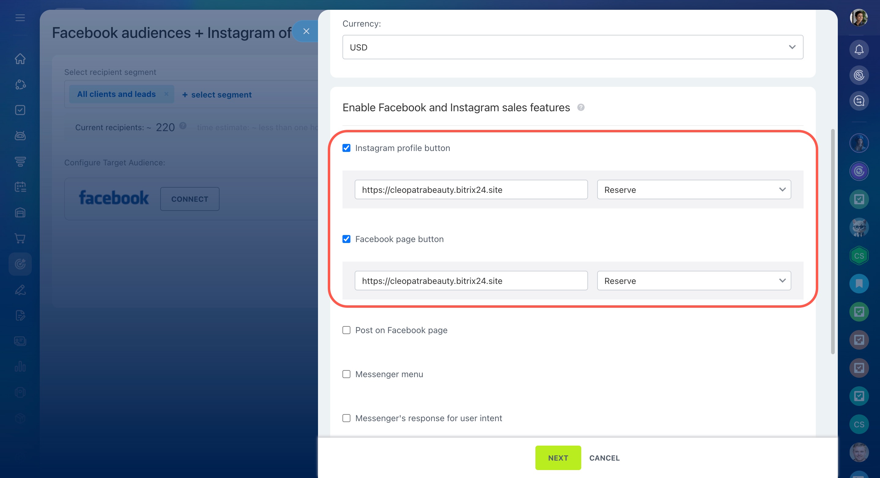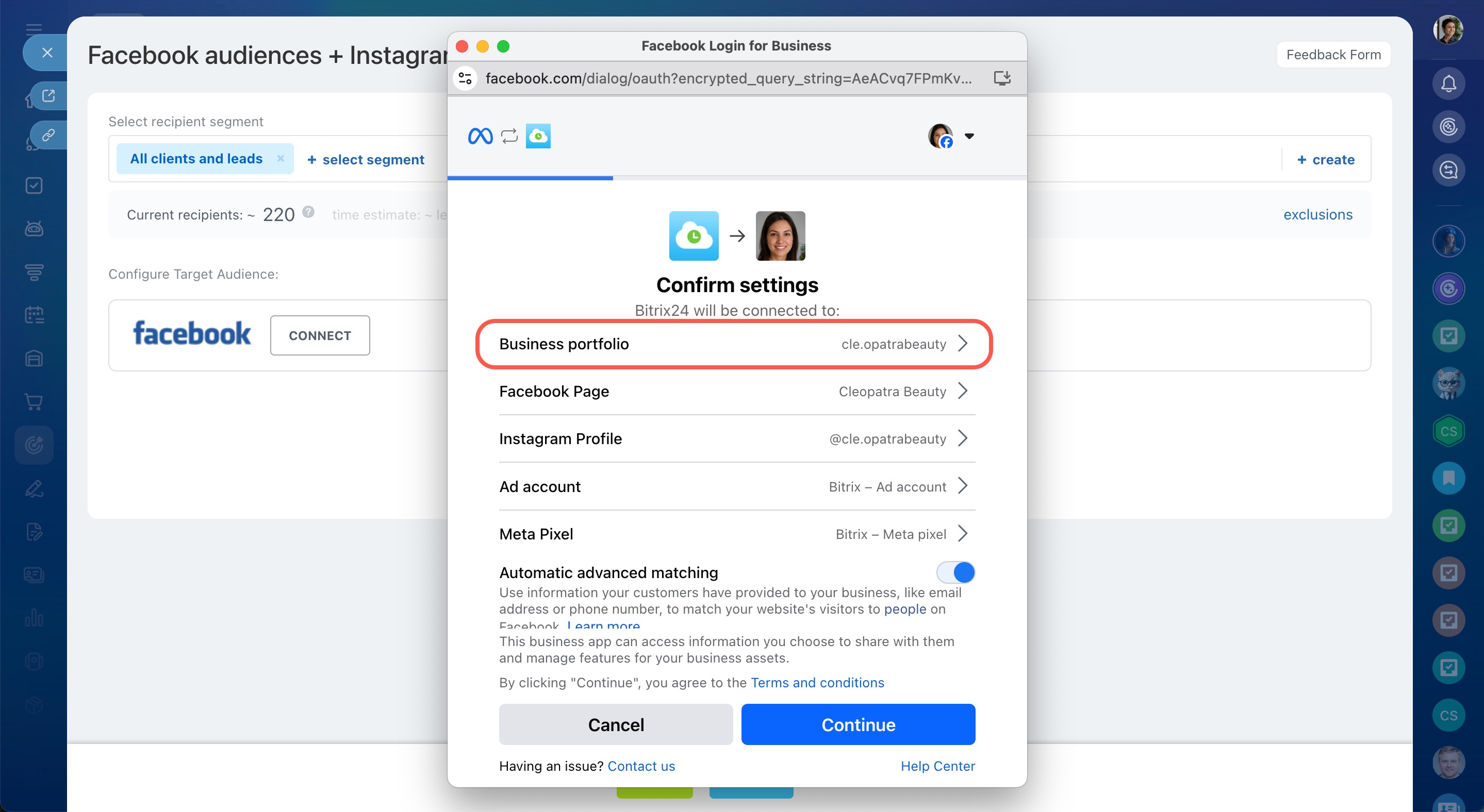 Set up your business portfolio, ad account, Facebook Page, Meta pixel, and additional sales features when integrating Bitrix24 with Facebook.