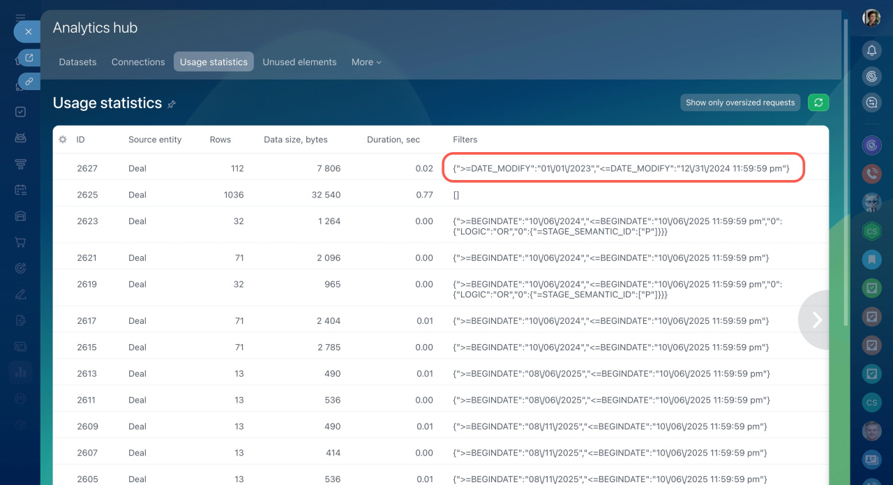 The filter quickly selects deals by the DATE_CREATE field, loading only the necessary data to speed up query execution. In the Usage statistics section, it appears as: {">=DATE_CREATE":"01\/01\/2023","<=DATE_CREATE":"12\/31\/2024 11:59:59 pm"}