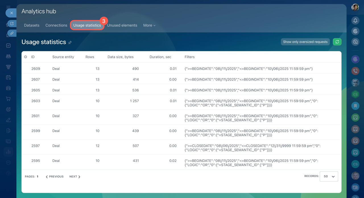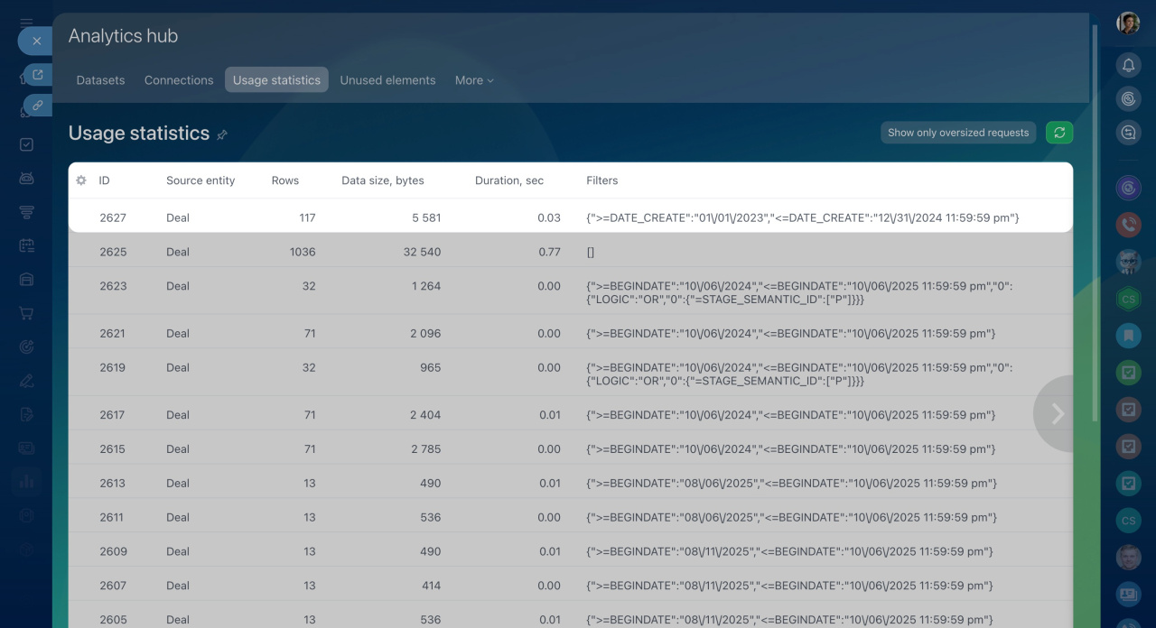 Dashboard charts are created using SQL queries. The faster the queries run, the quicker the dashboards load in Bitrix24. By analyzing statistics, you can evaluate query performance. If queries are slow or load too much data, make adjustments to improve dashboard speed.