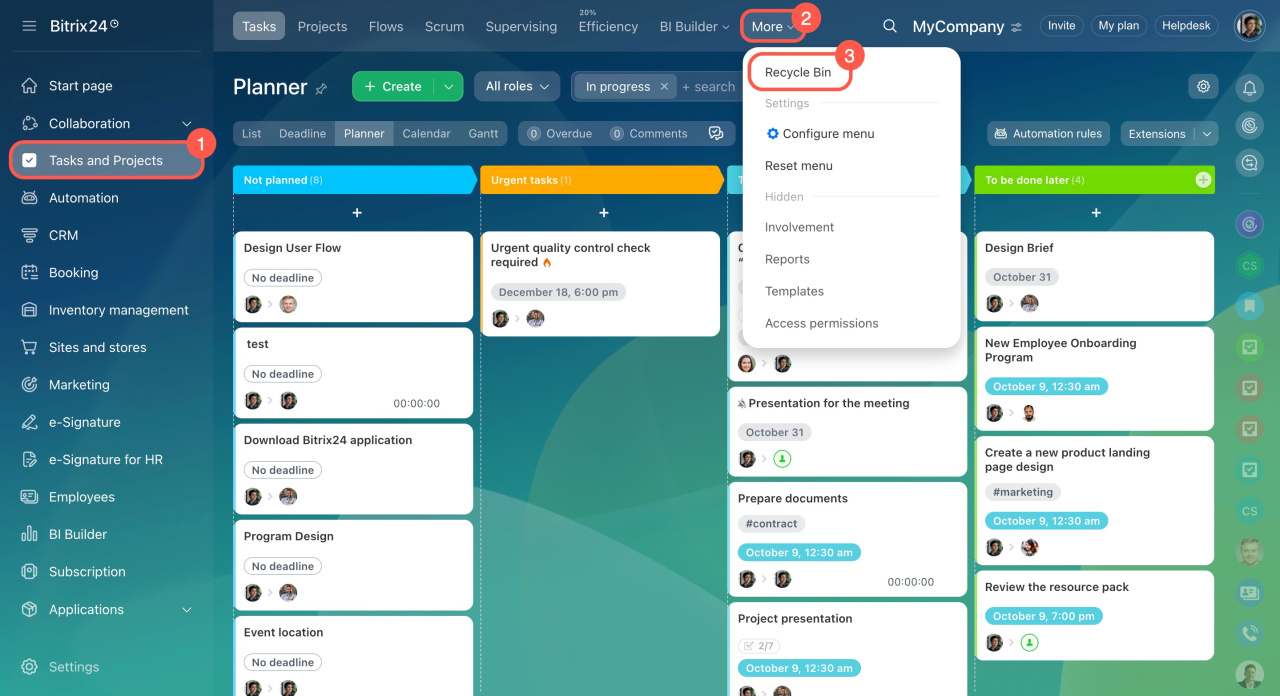 Tasks. To find deleted tasks, open Tasks and Projects > More > Recycle Bin.
