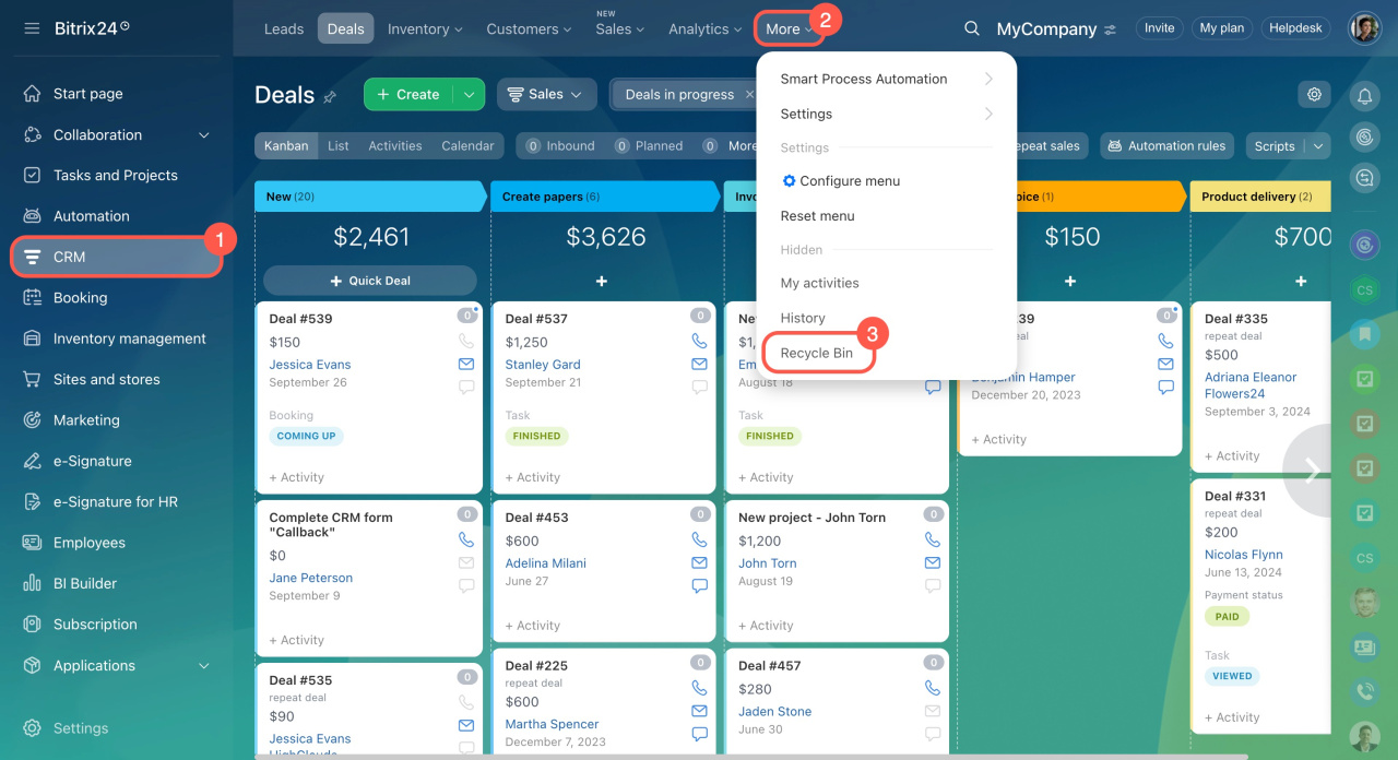 CRM items. If you've deleted deals, contacts, companies, or leads, go to CRM > More > Recycle Bin.