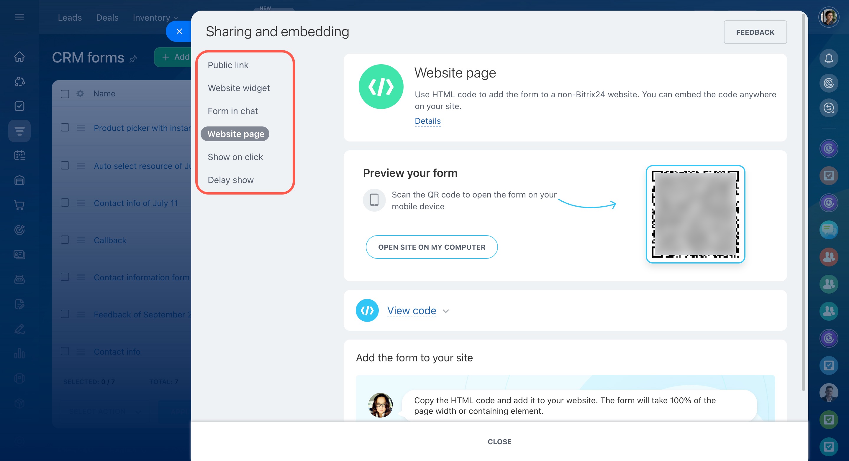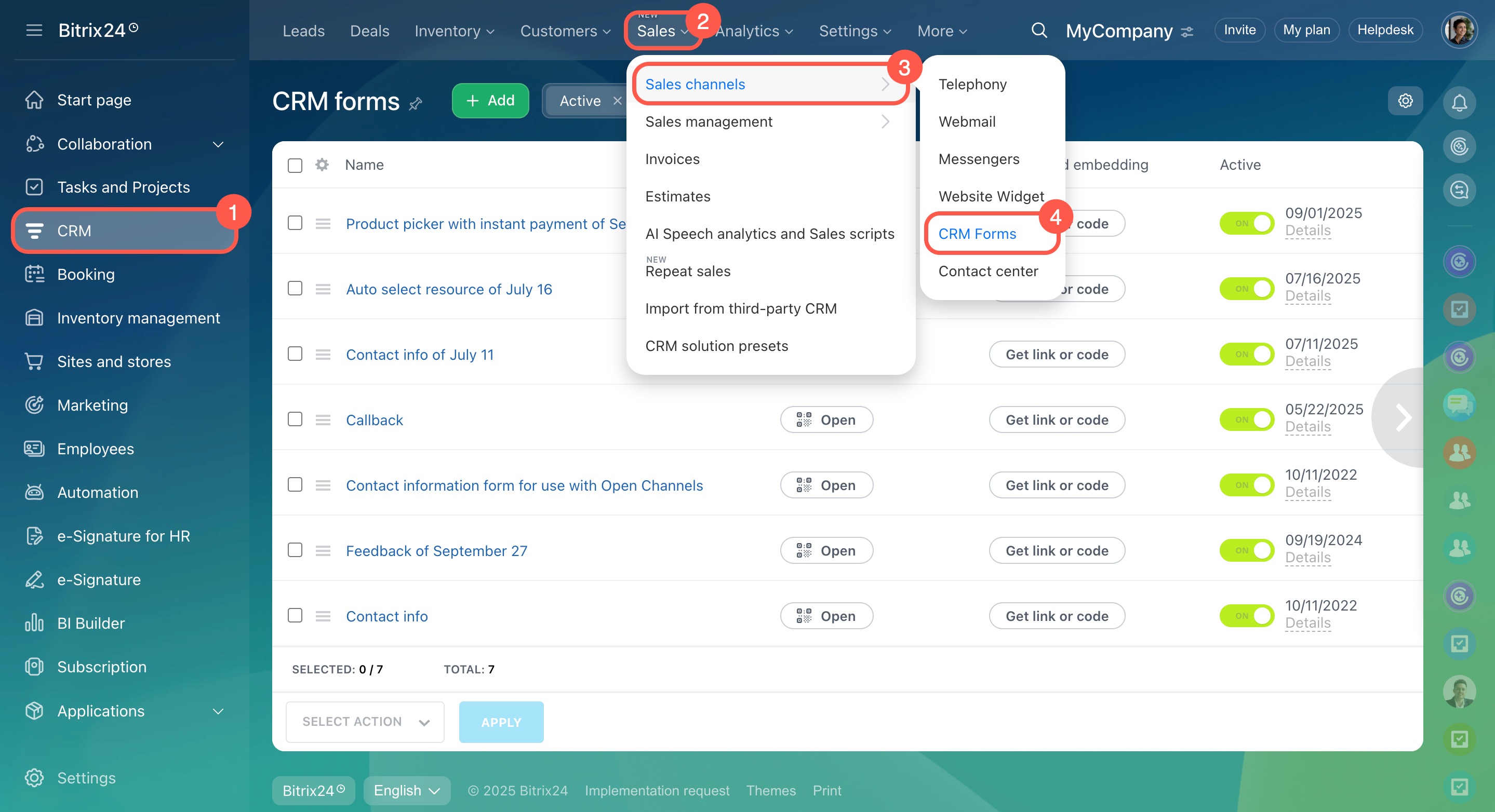 - To work with the list, go to the CRM section > Sales > Sales Channels > CRM Forms.