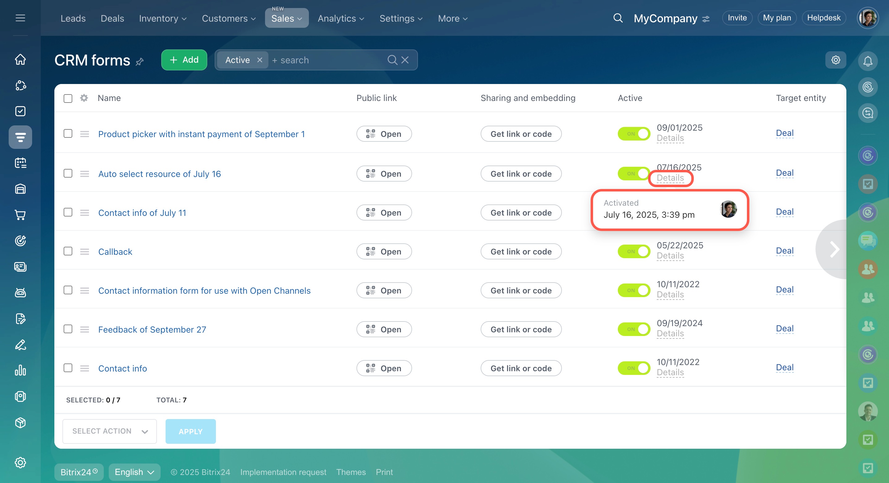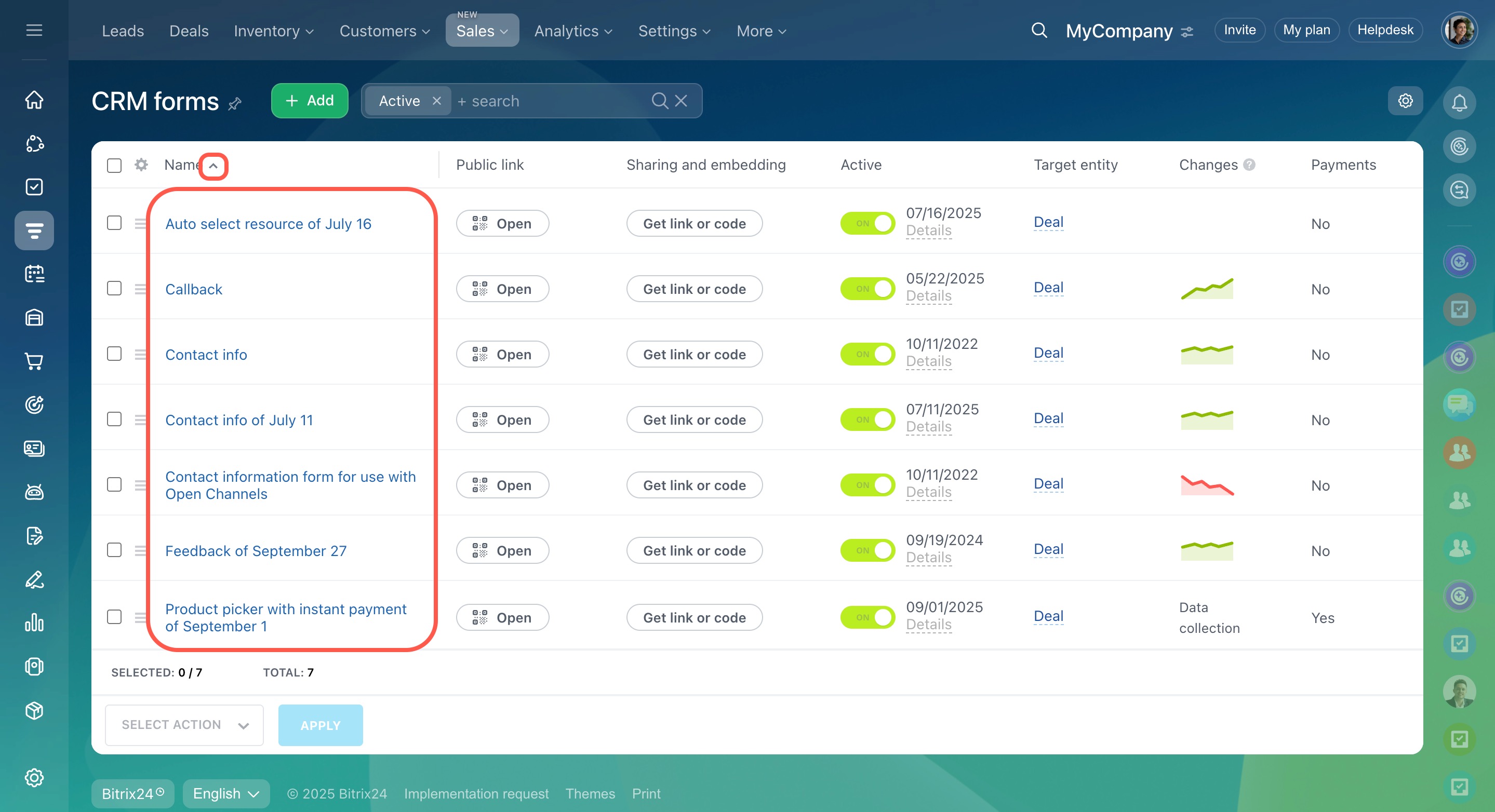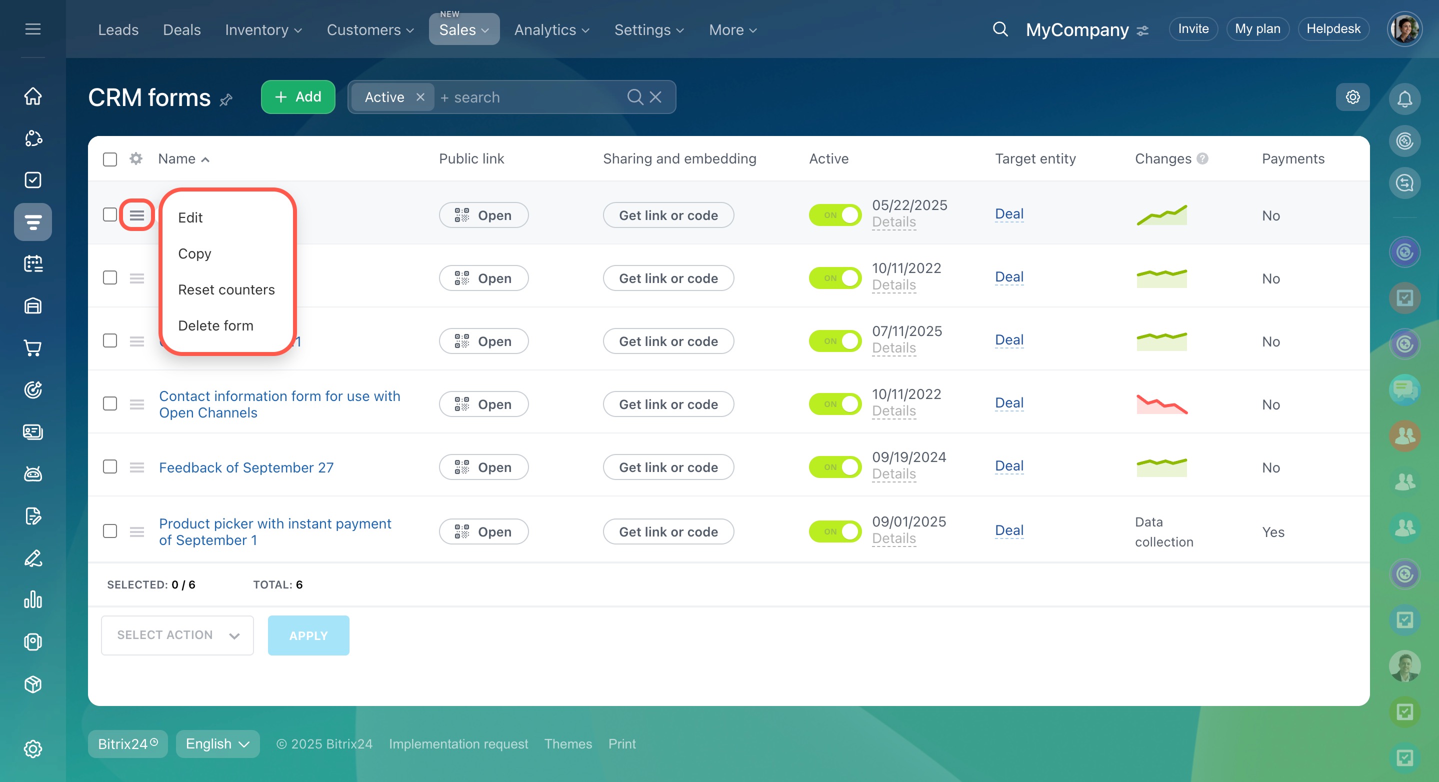 The list includes all CRM forms you have created in Bitrix24. Here, you can view basic information, change settings, and evaluate conversion.