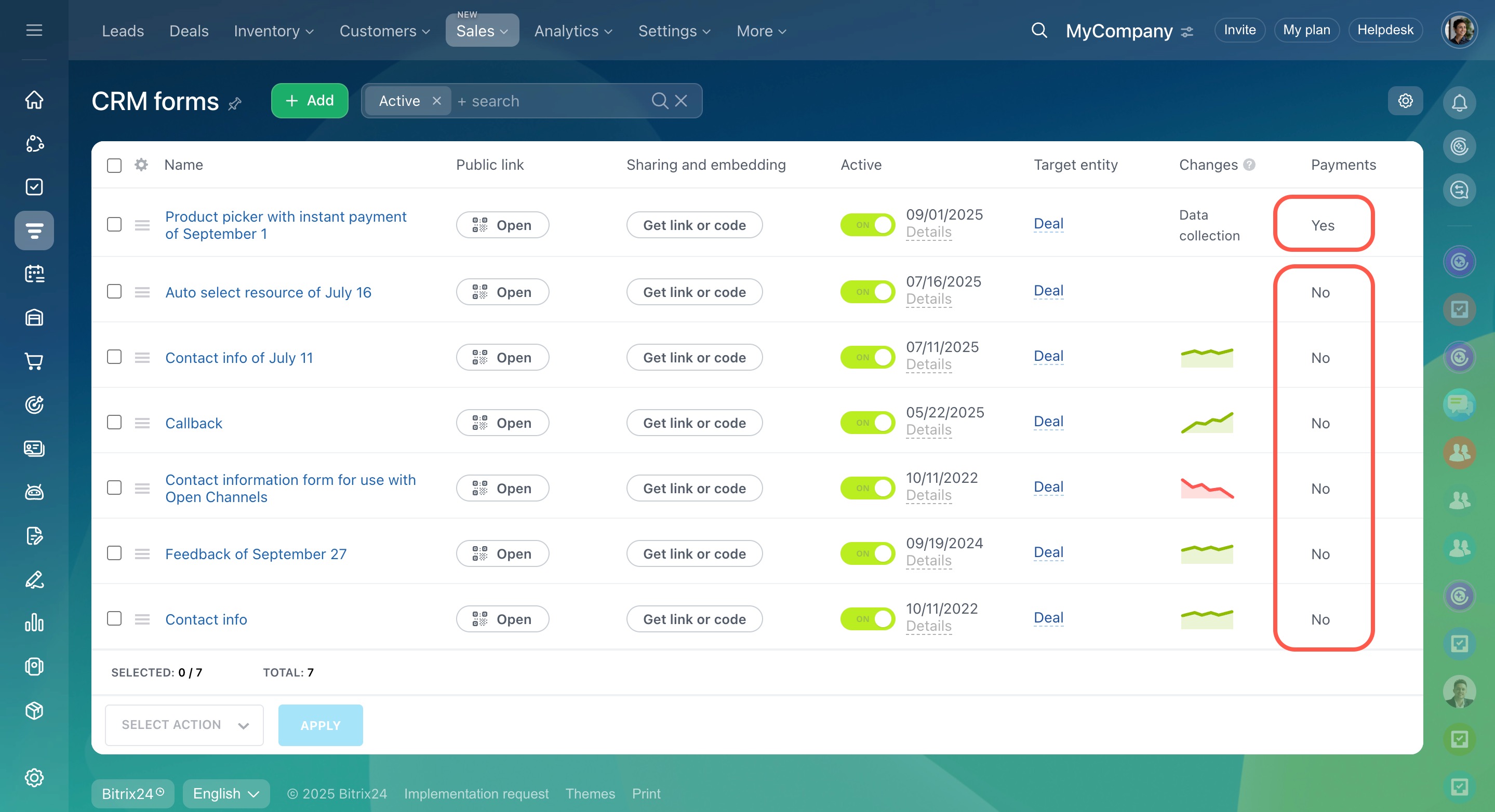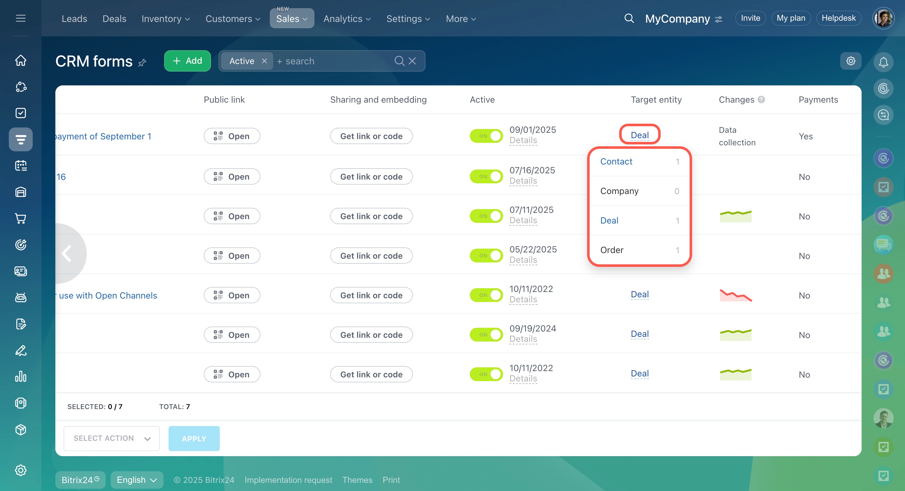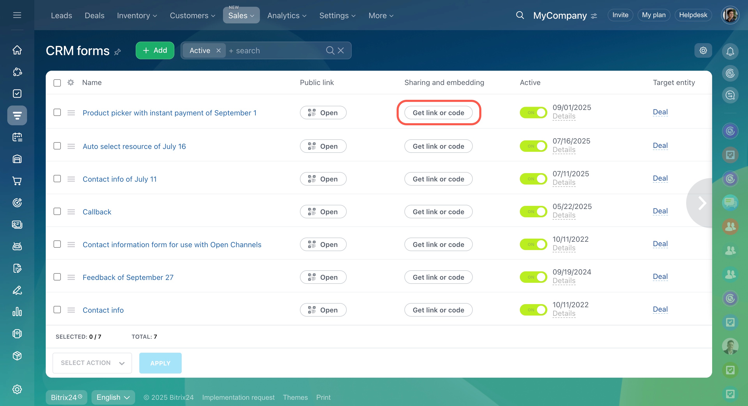 The list includes all CRM forms you have created in Bitrix24. Here, you can view basic information, change settings, and evaluate conversion.