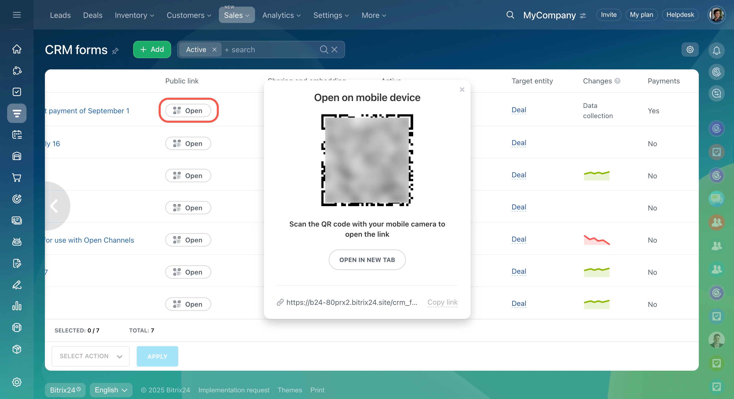 - Click Open in the Public link column for quick access to the form. Here, you can view how the form looks on different devices, fill it out, and copy the direct link.
