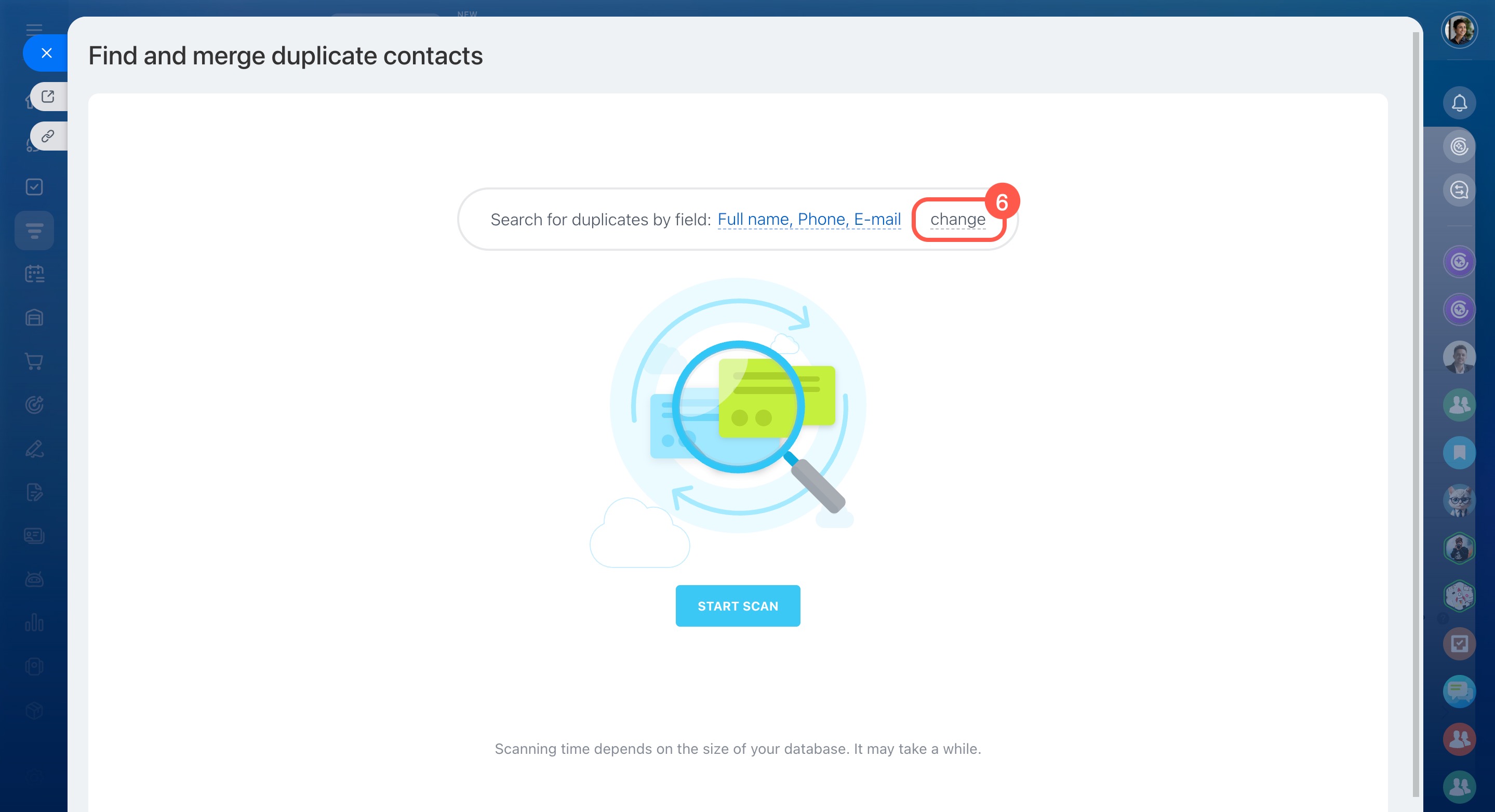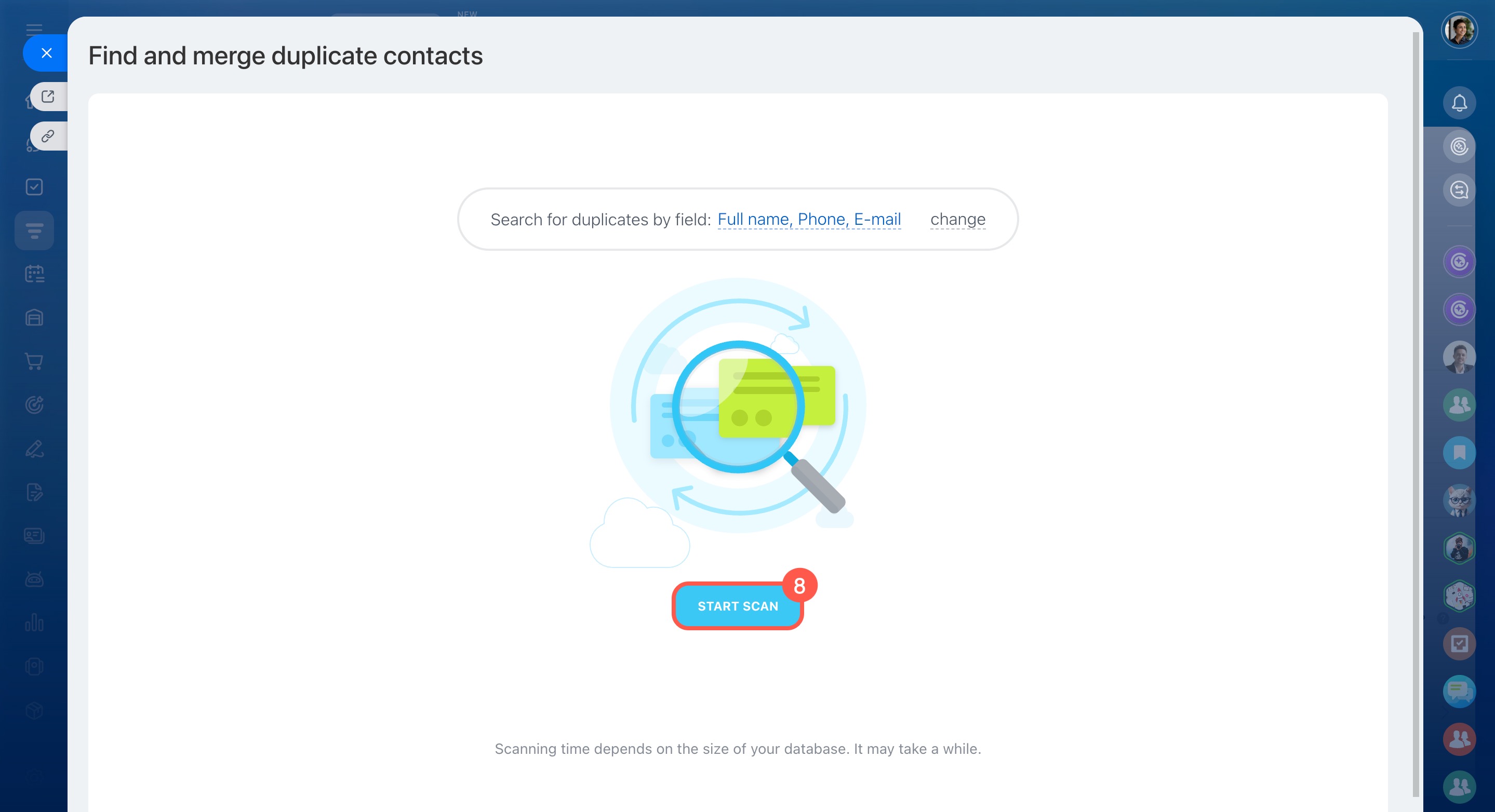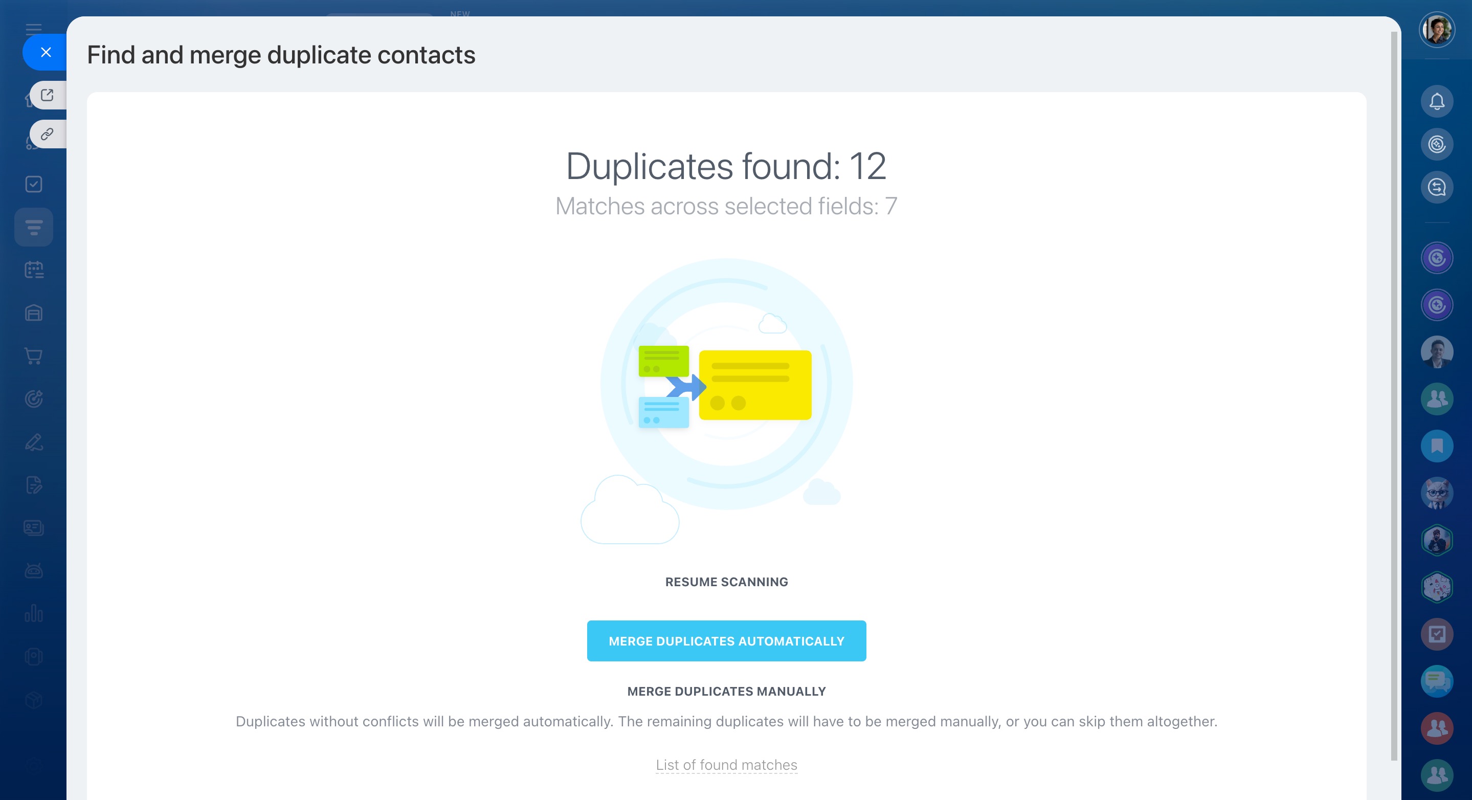 - By default, Bitrix24 automatically checks for duplicates once a day. You can configure the frequency of checks or start the process manually.