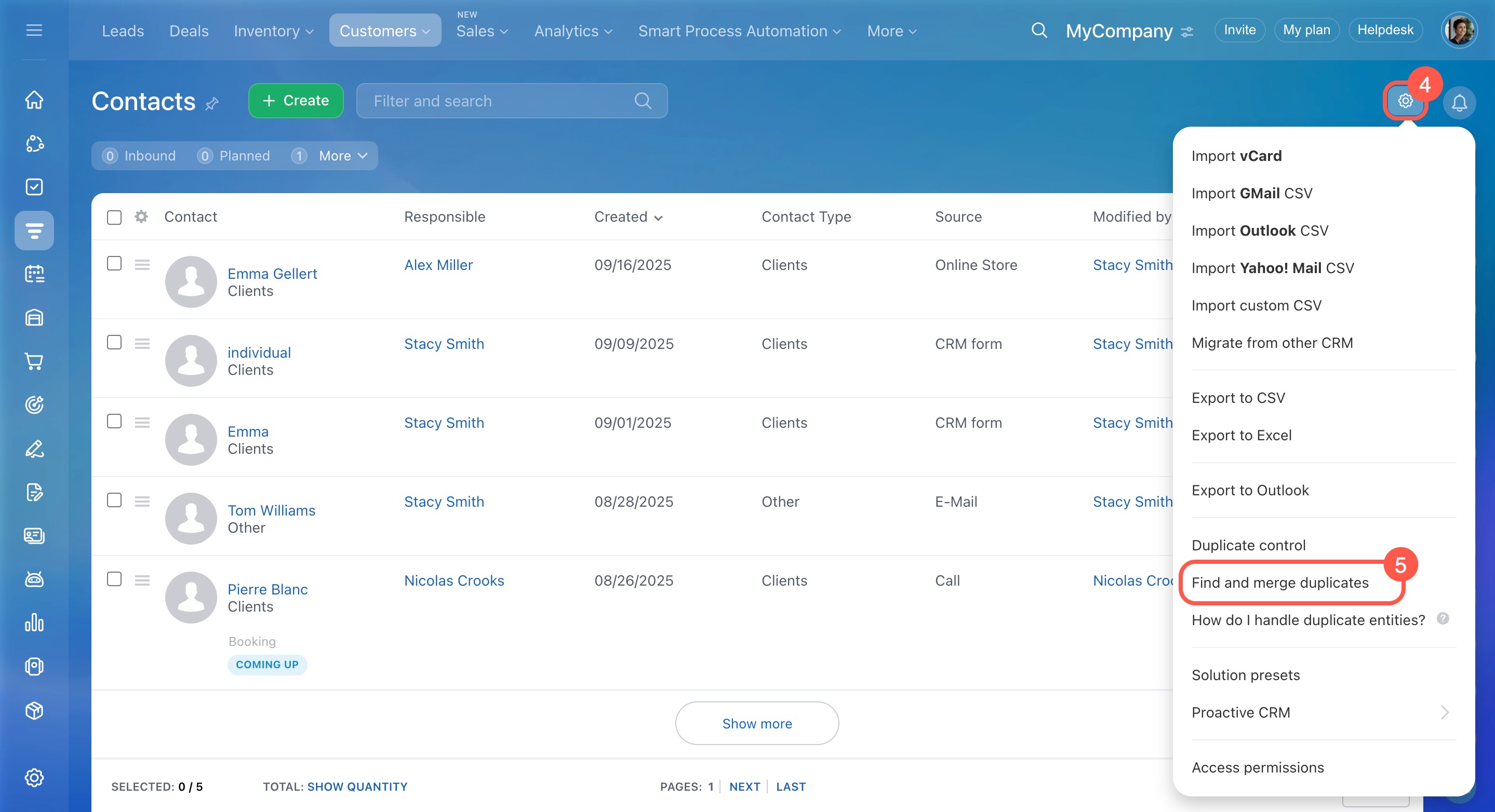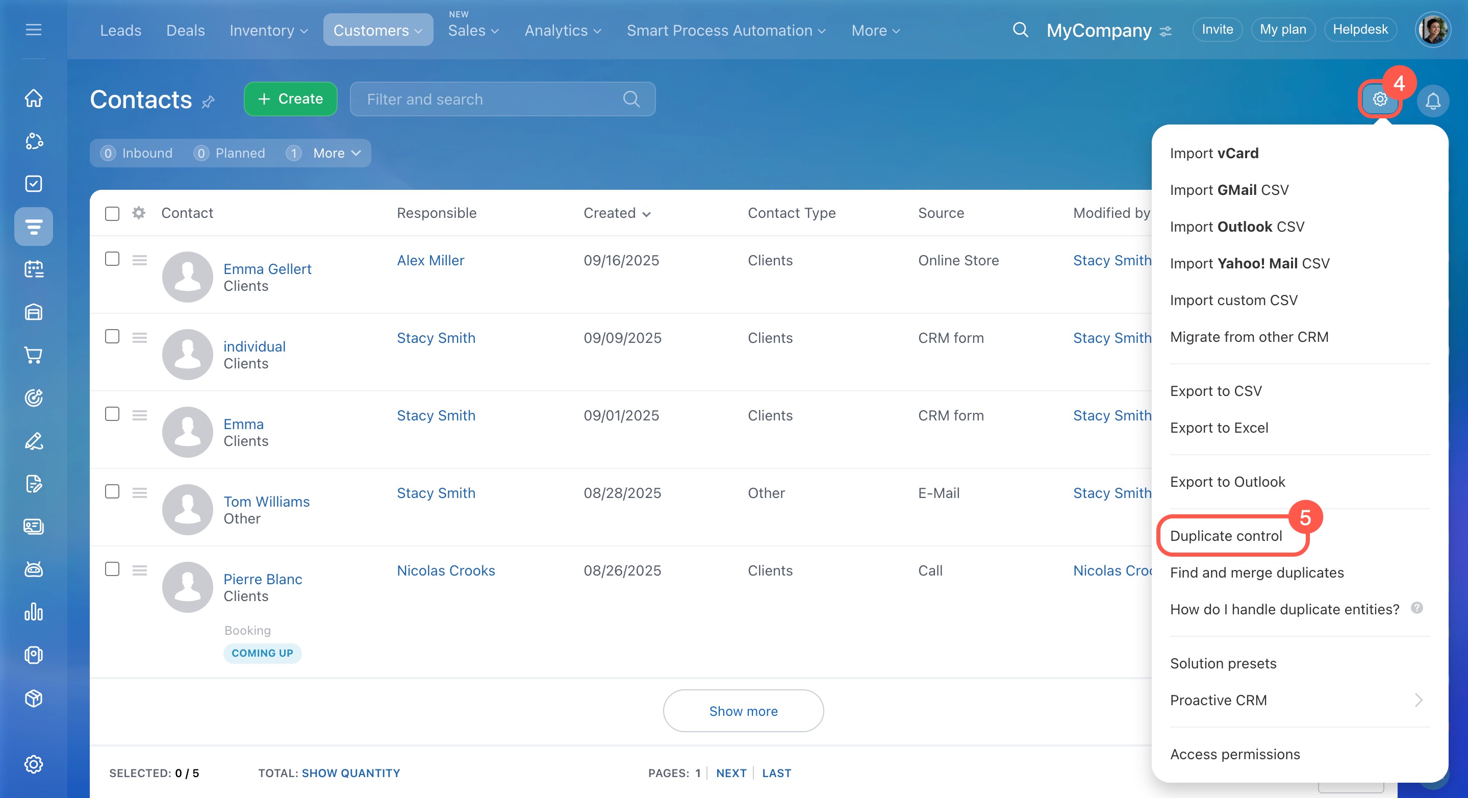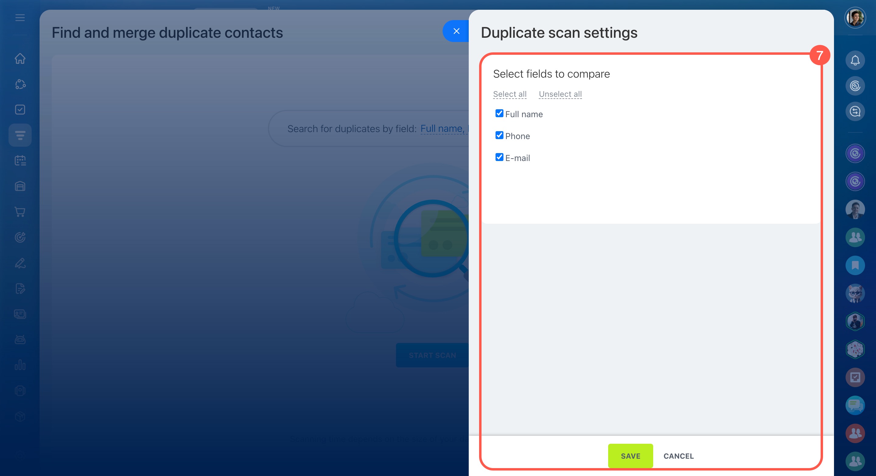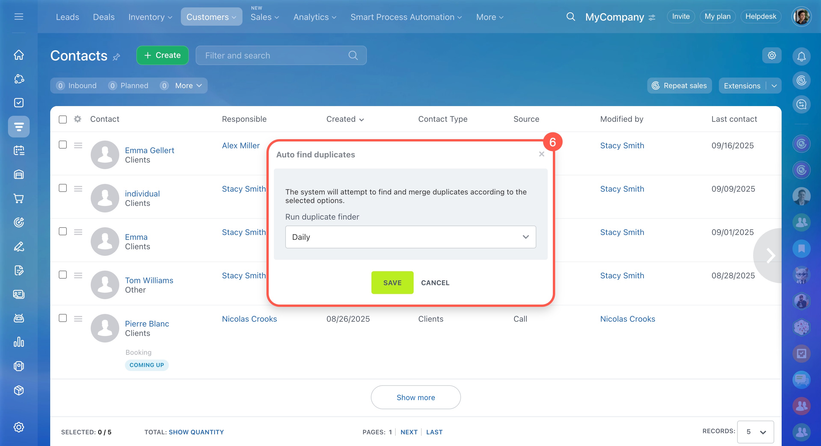 - By default, Bitrix24 automatically checks for duplicates once a day. You can configure the frequency of checks or start the process manually.