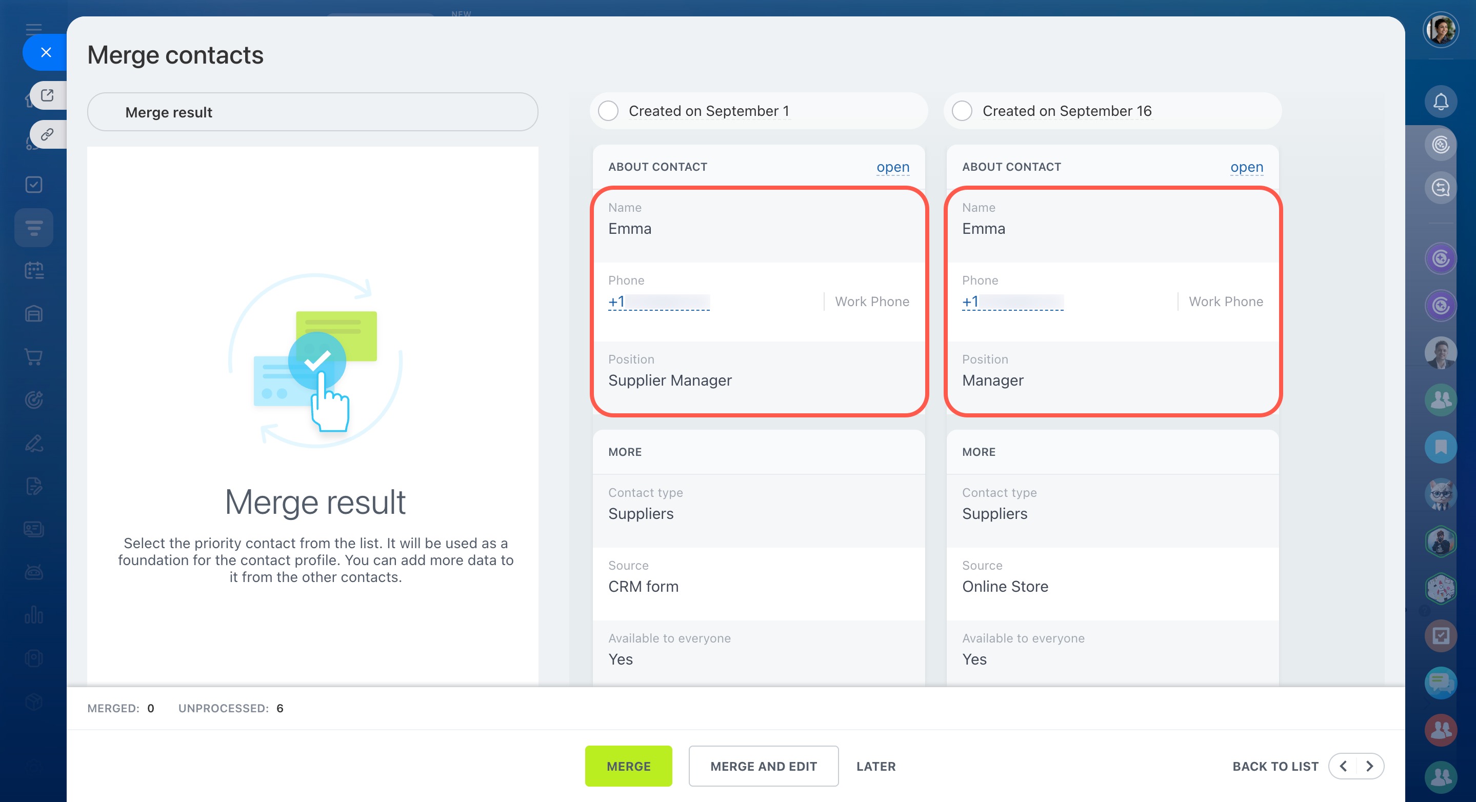 Manual merging. There are two contacts: Paul and Paul Smith. The phone numbers are the same, but the positions in the company differ. In this case, the contacts need to be merged manually.