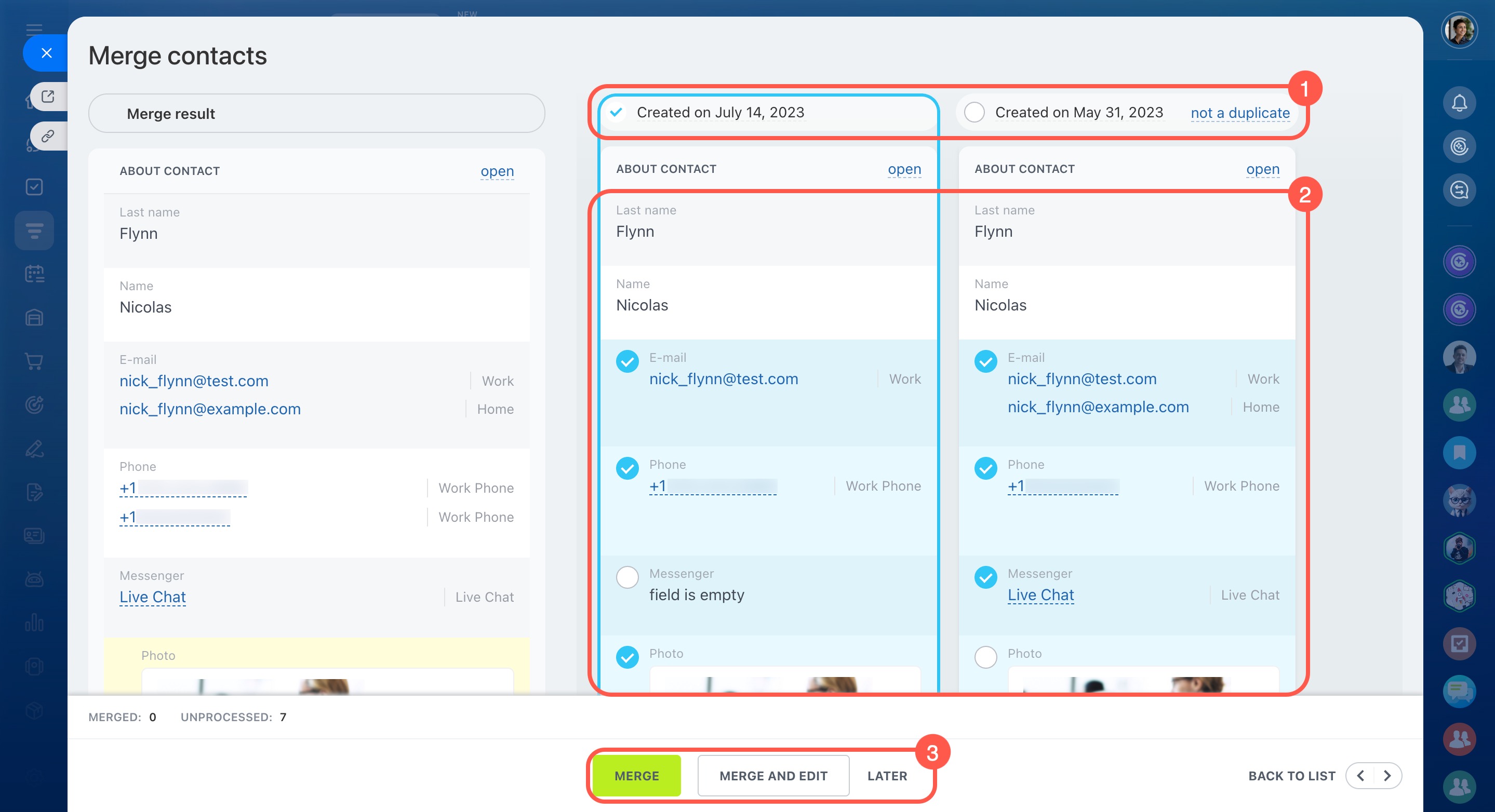 Review the field values in all records. If the field values match, they will be kept automatically. If the values differ, choose the ones you want to save. For fields that allow multiple entries, such as multiple phone numbers and email addresses, you can keep them all.