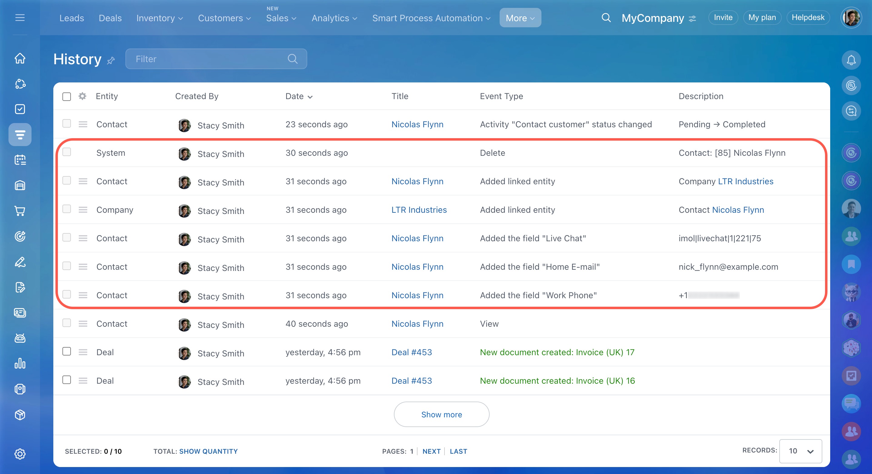 After automatic merging, the form created earlier will remain, and the others will be deleted. You can check which items were deleted in the History tab. If necessary, they can be restored from the CRM Recycle Bin.